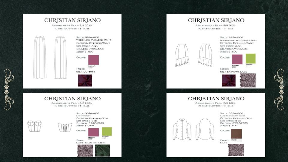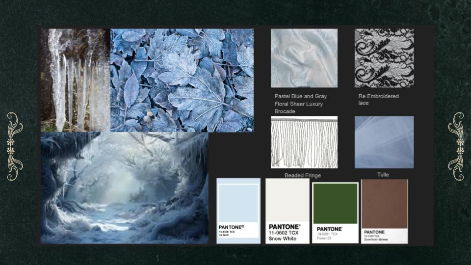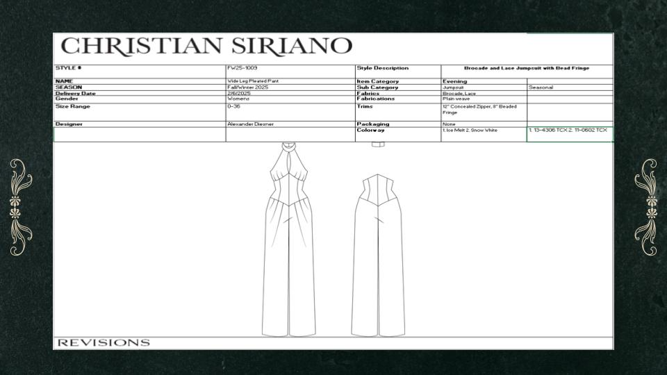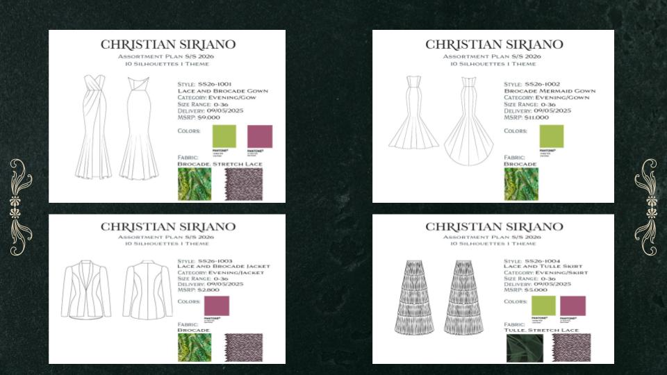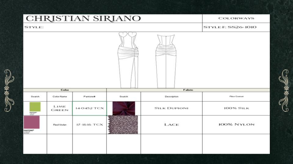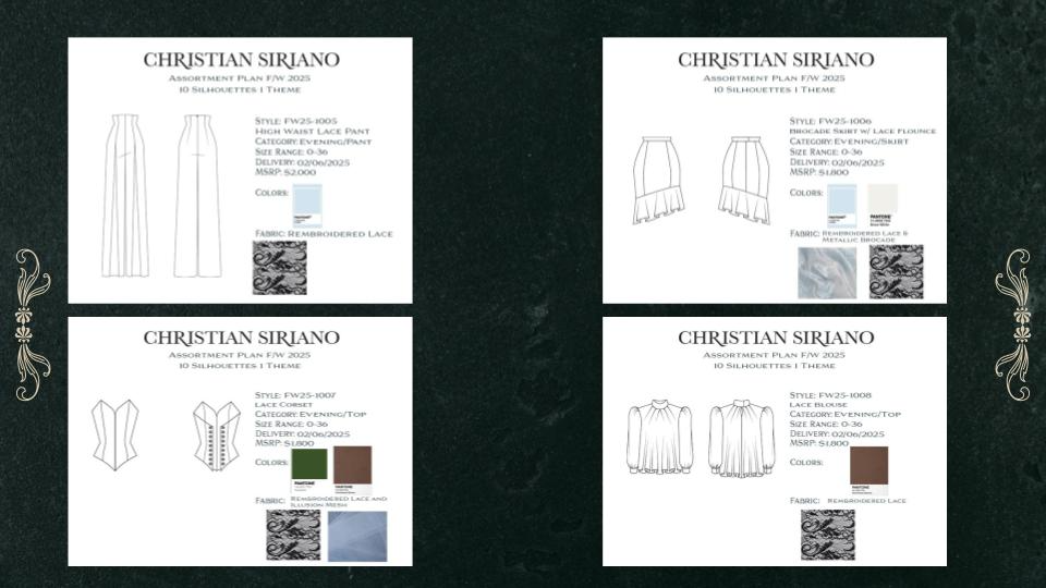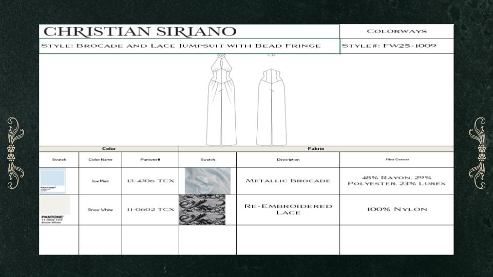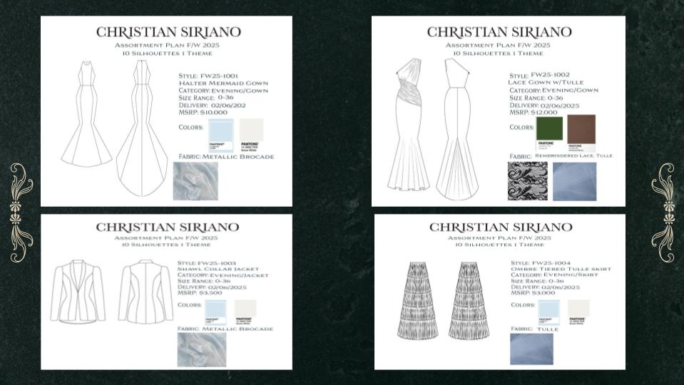 This project was done for FSH300: Global Fashion Industry, a class focused on supply chain management and garment production, with a creative edge. The project was a semester long learning experience where we chose a brand and went through the different production stages. My brand choice was Christian Siriano, as I had just returned from my internship experience. A large portion of the assignment was to develop two different collections for two different seasons totaling 20 individual pieces. This included creating tech packs, merchandising sheets, and a timeline, as well as planning out the production cycle. All technical flats were created by me in Adobe Illustrator, either as original designs or as studies on more complex designs, some reused from previous projects For the Fall Winter 2025 season, the collection builds off of the Spring Summer 2025 collection, following the enchanted forest being frozen over. The collection will feature crystalline beadwork reminiscent of icicles gleaming in the sun, frosty blues and shimmering silvers reminiscent of the cold winter air, and rich forest greens ombre dyed into a rich brown, signaling the start of the change of seasons. For Spring Summer 2026, we’re taking inspiration from the Alnwick Gardens Poison Garden. Dark beauty is the theme of the collection, featuring custom laces reminiscent of poison ivy and deadly nightshade. Rich shades of green paired with rich hues of violets and limes are the primary colors of the collection, with black accents creating a sense of dread.