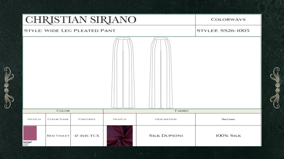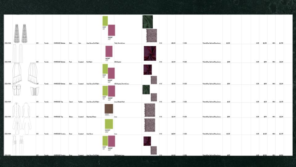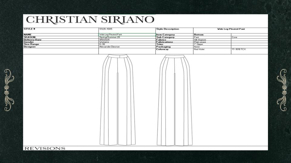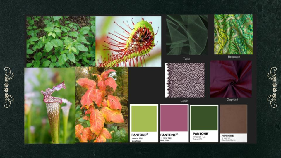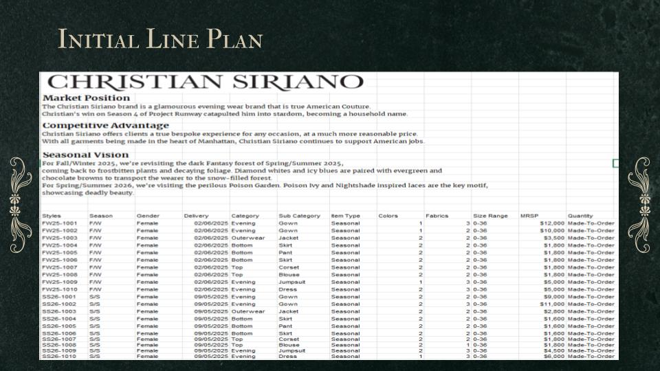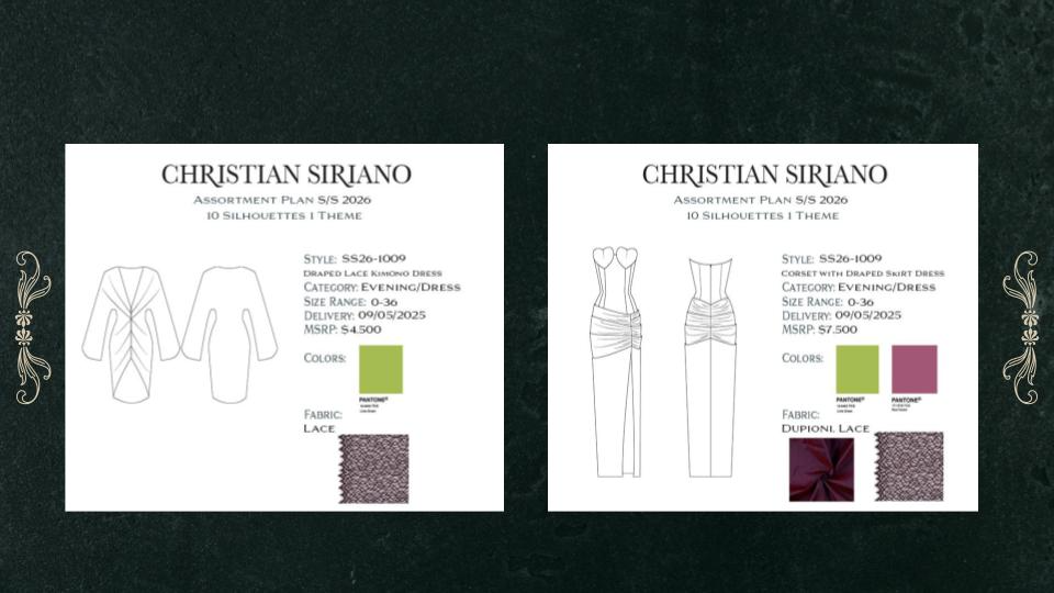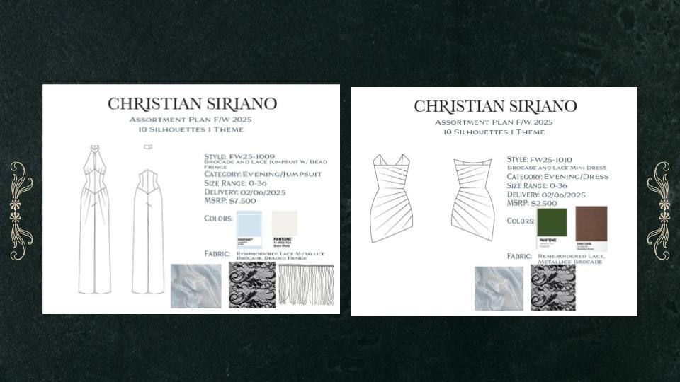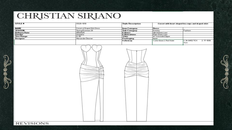 This project was done for FSH300: Global Fashion Industry, a class focused on supply chain management and garment production, with a creative edge. The project was a semester long learning experience where we chose a brand and went through the different production stages. My brand choice was Christian Siriano, as I had just returned from my internship experience. A large portion of the assignment was to develop two different collections for two different seasons totaling 20 individual pieces. This included creating tech packs, merchandising sheets, and a timeline, as well as planning out the production cycle. All technical flats were created by me in Adobe Illustrator, either as original designs or as studies on more complex designs, some reused from previous projects For the Fall Winter 2025 season, the collection builds off of the Spring Summer 2025 collection, following the enchanted forest being frozen over. The collection will feature crystalline beadwork reminiscent of icicles gleaming in the sun, frosty blues and shimmering silvers reminiscent of the cold winter air, and rich forest greens ombre dyed into a rich brown, signaling the start of the change of seasons. For Spring Summer 2026, we’re taking inspiration from the Alnwick Gardens Poison Garden. Dark beauty is the theme of the collection, featuring custom laces reminiscent of poison ivy and deadly nightshade. Rich shades of green paired with rich hues of violets and limes are the primary colors of the collection, with black accents creating a sense of dread.