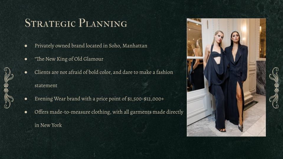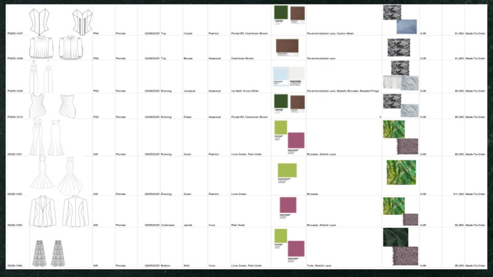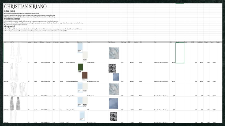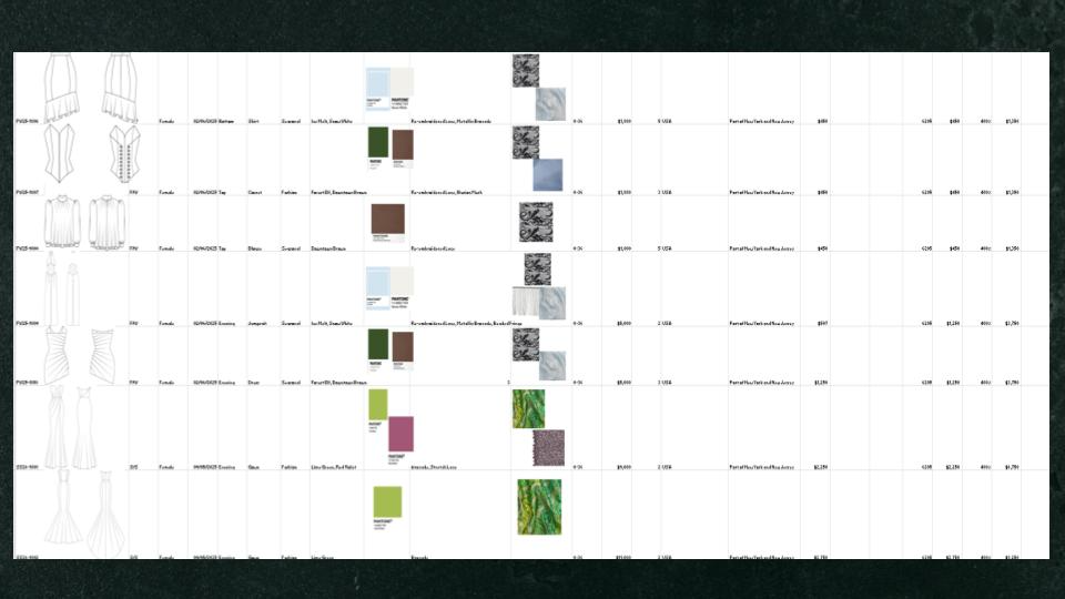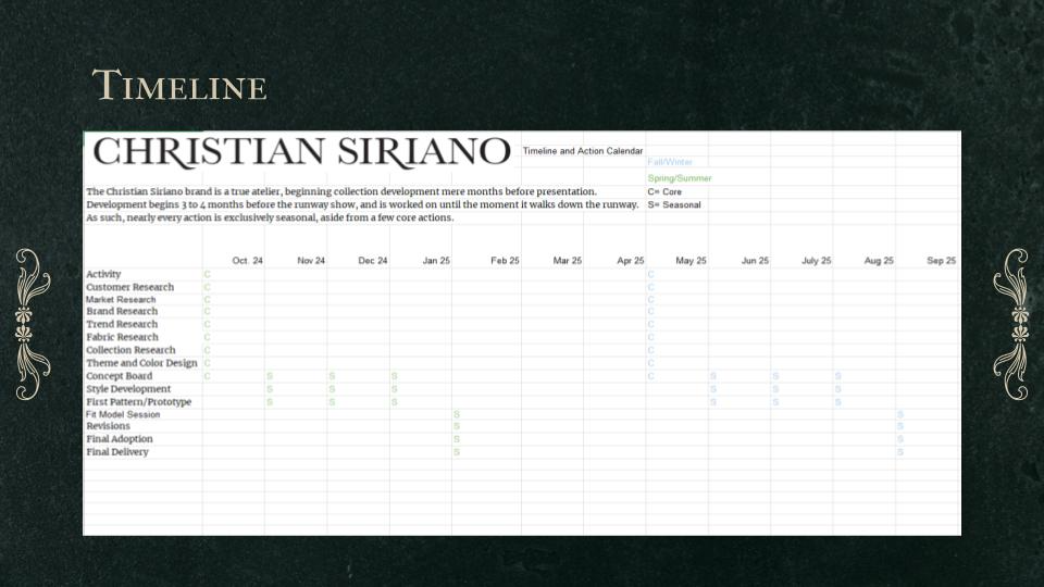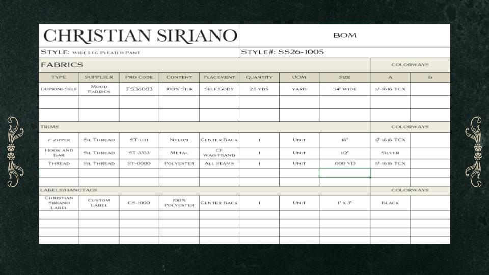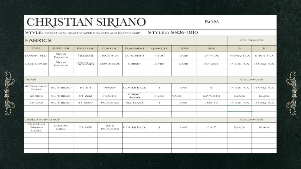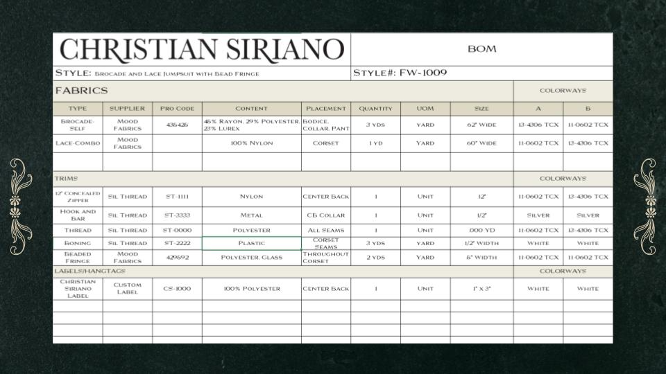This project was done for FSH300: Global Fashion Industry, a class focused on supply chain management and garment production, with a creative edge. The project was a semester long learning experience where we chose a brand and went through the different production stages. My brand choice was Christian Siriano, as I had just returned from my internship experience. A large portion of the assignment was to develop two different collections for two different seasons totaling 20 individual pieces. This included creating tech packs, merchandising sheets, and a timeline, as well as planning out the production cycle. All technical flats were created by me in Adobe Illustrator, either as original designs or as studies on more complex designs, some reused from previous projects For the Fall Winter 2025 season, the collection builds off of the Spring Summer 2025 collection, following the enchanted forest being frozen over. The collection will feature crystalline beadwork reminiscent of icicles gleaming in the sun, frosty blues and shimmering silvers reminiscent of the cold winter air, and rich forest greens ombre dyed into a rich brown, signaling the start of the change of seasons. For Spring Summer 2026, we’re taking inspiration from the Alnwick Gardens Poison Garden. Dark beauty is the theme of the collection, featuring custom laces reminiscent of poison ivy and deadly nightshade. Rich shades of green paired with rich hues of violets and limes are the primary colors of the collection, with black accents creating a sense of dread.