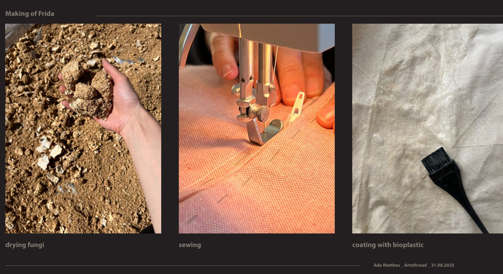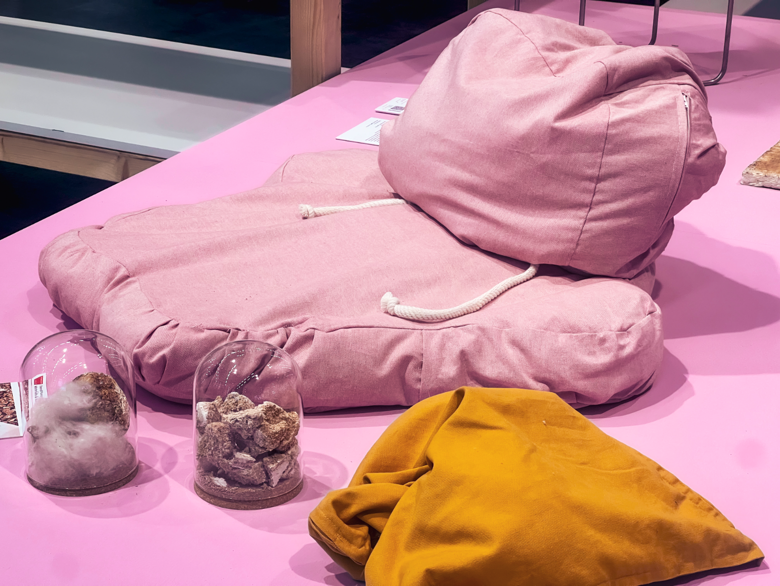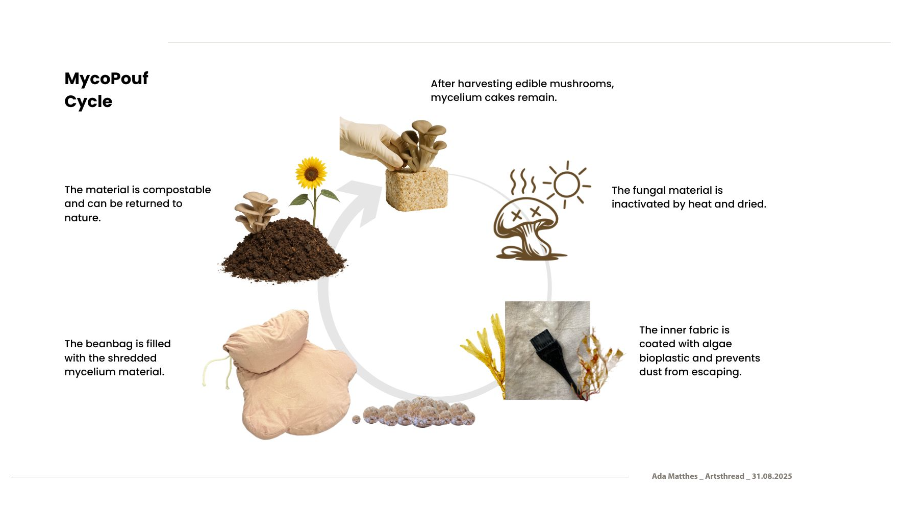 MycoPouf – The Pouf with Mycelium Filling The beanbag is the end result of a whole series of material tests and the outcome of the bachelor thesis "Fungi a La Design," which explored the meaningful application of fungi and their coatings. MycoPouf "Frida" introduces mycelium as a material for beanbag interiors, offering an alternative to synthetic fillings. Polystyrene and polyester emit high levels of CO₂ during production, release microplastics, and are difficult to recycle. MycoPouf solves this by using dried, reused mycelium from gourmet mushroom production — a natural, breathable, fire-retardant material that is fully biodegradable. By working symbiotically with existing systems, MycoPouf introduces a scalable, circular approach to furniture design. Let's shape an optimistic future with mycelium materials!