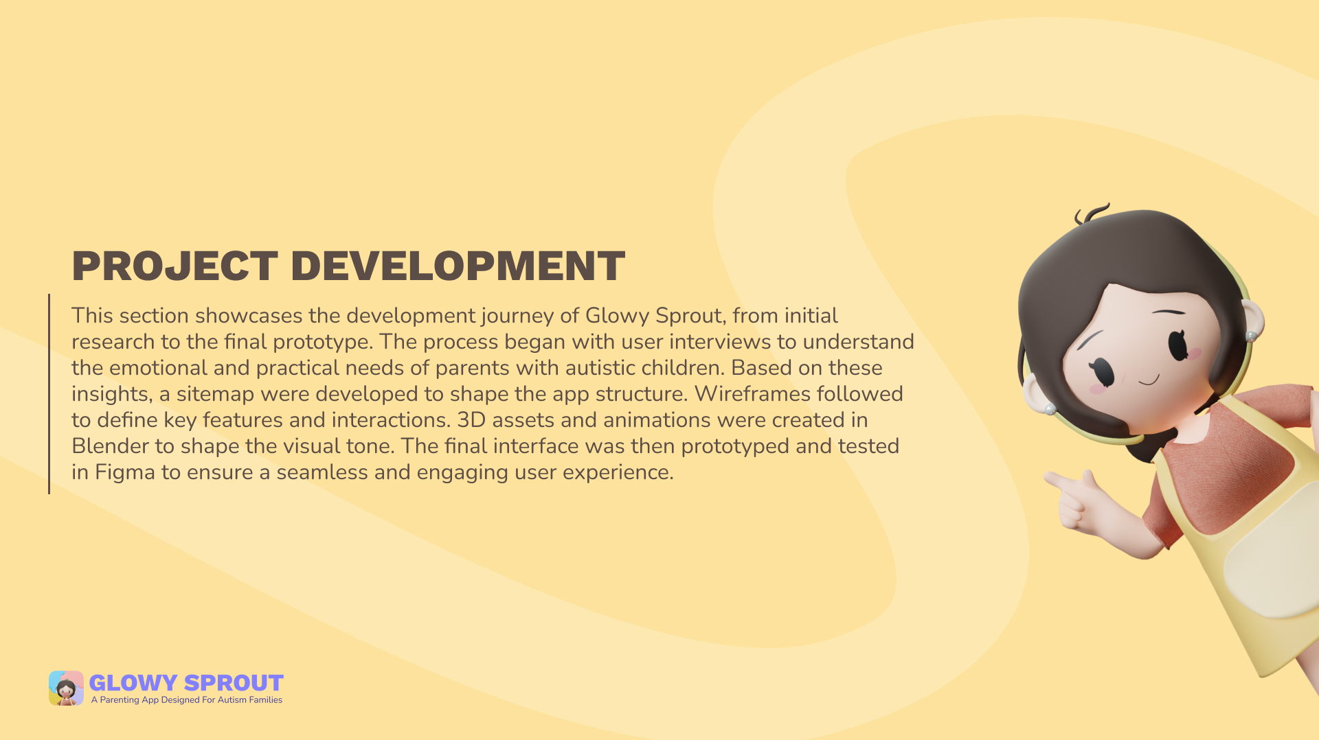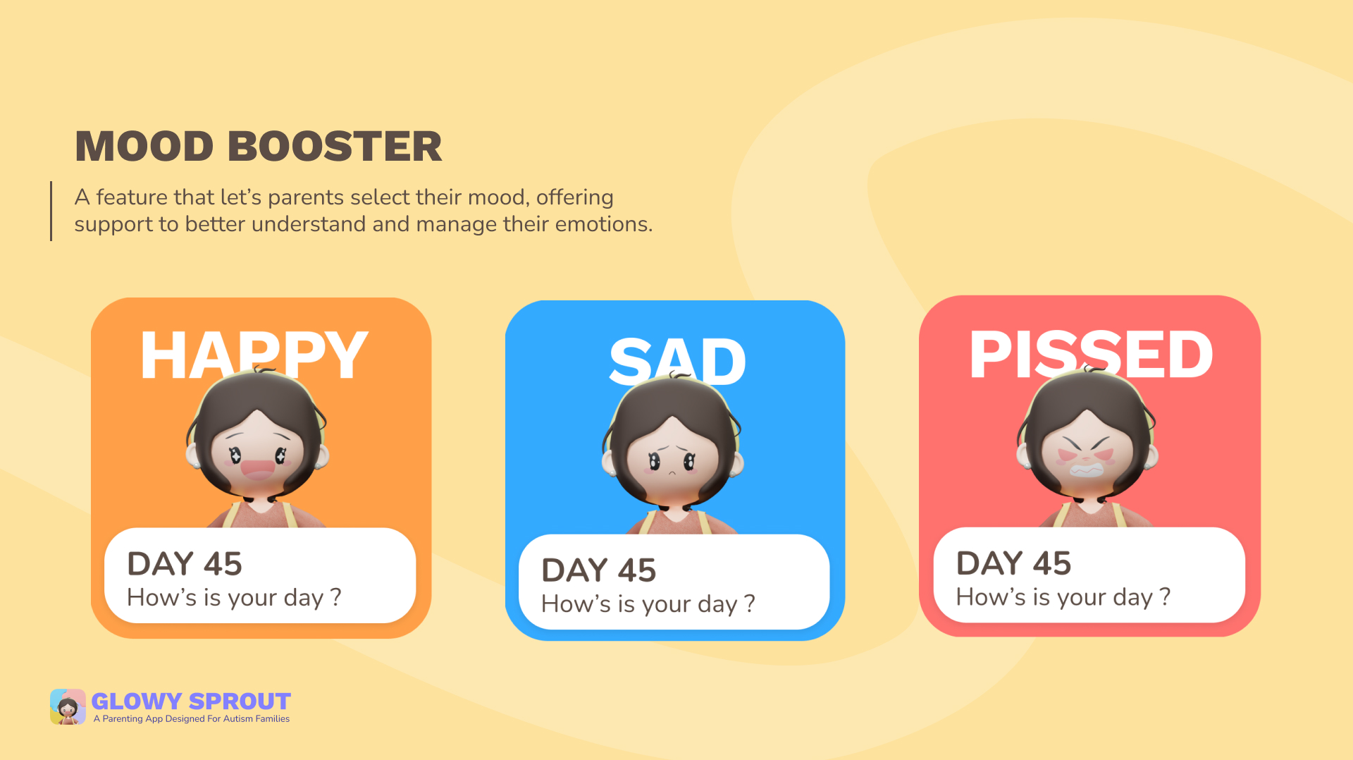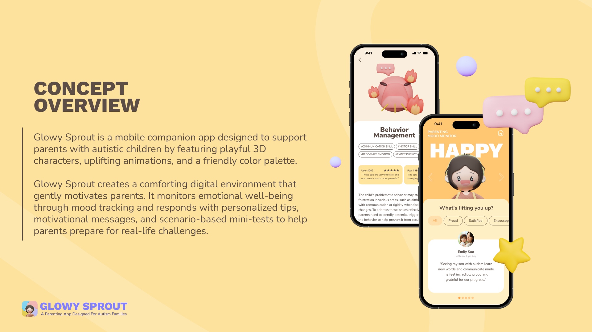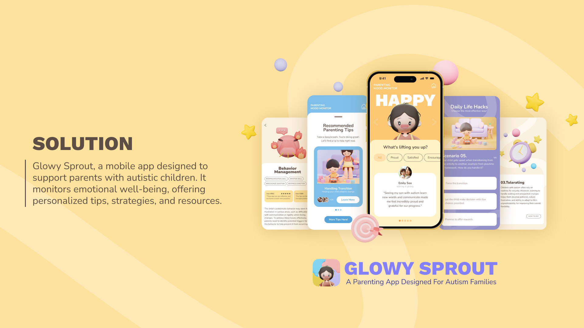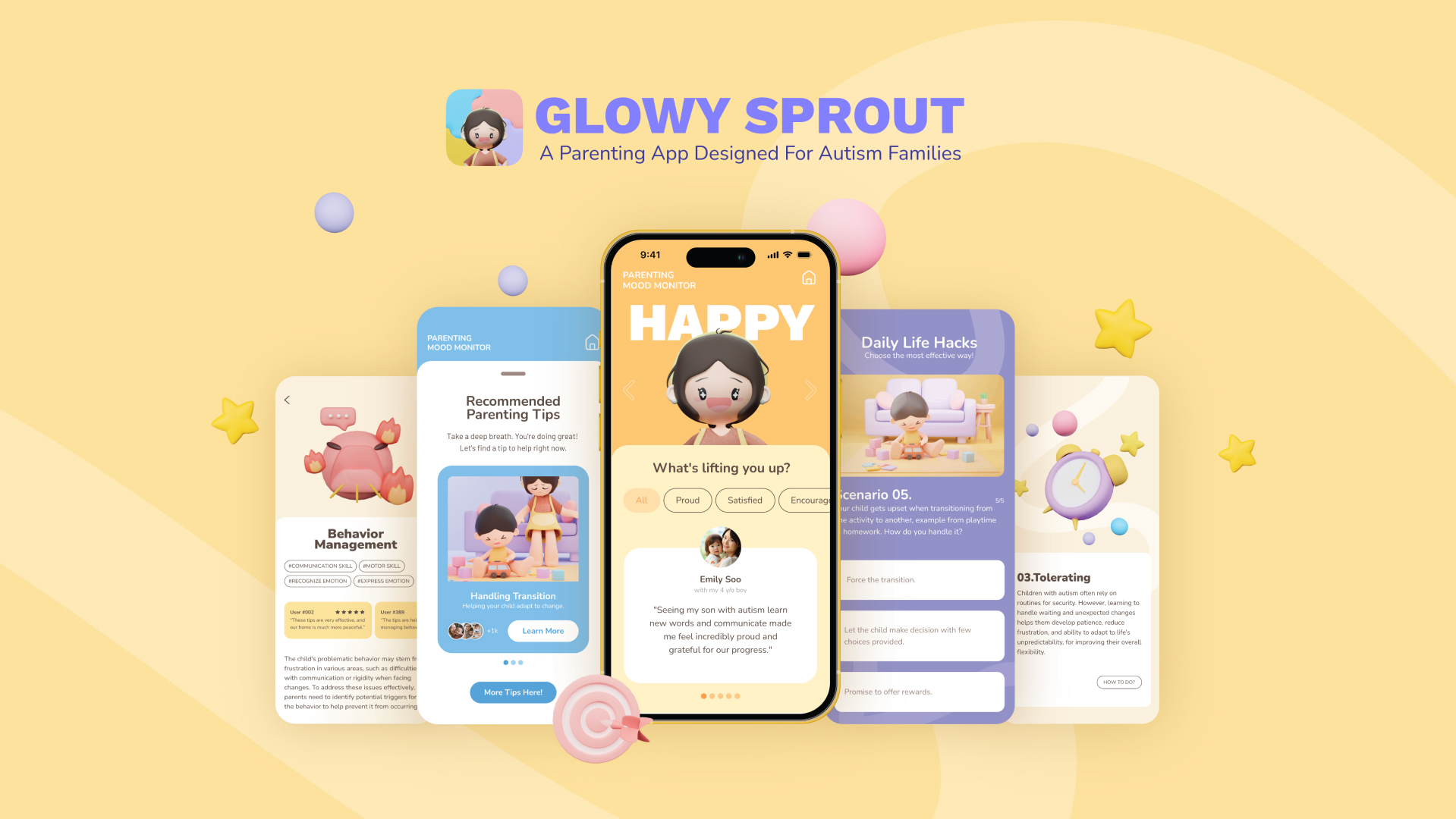 Glowy Sprout is a mobile companion app designed to support parents with autistic children by featuring playful 3D characters, uplifting animations, and a friendly color palette. Glowy Sprout creates a comforting digital environment that gently motivates parents. It monitors emotional well-being through mood tracking and responds with personalized tips, motivational messages, and scenario-based mini-tests to help parents prepare for real-life challenges. For a comprehensive overview of the research, design process, and development journey behind Glowy Sprout, the full documentation slides can be accessed here: https://docs.google.com/presentation/d/1_Ur5cAkJ_ez3tr3oeK-WV_dUPv_N5qI7lKy0HK6gHbw/edit?usp=sharing
