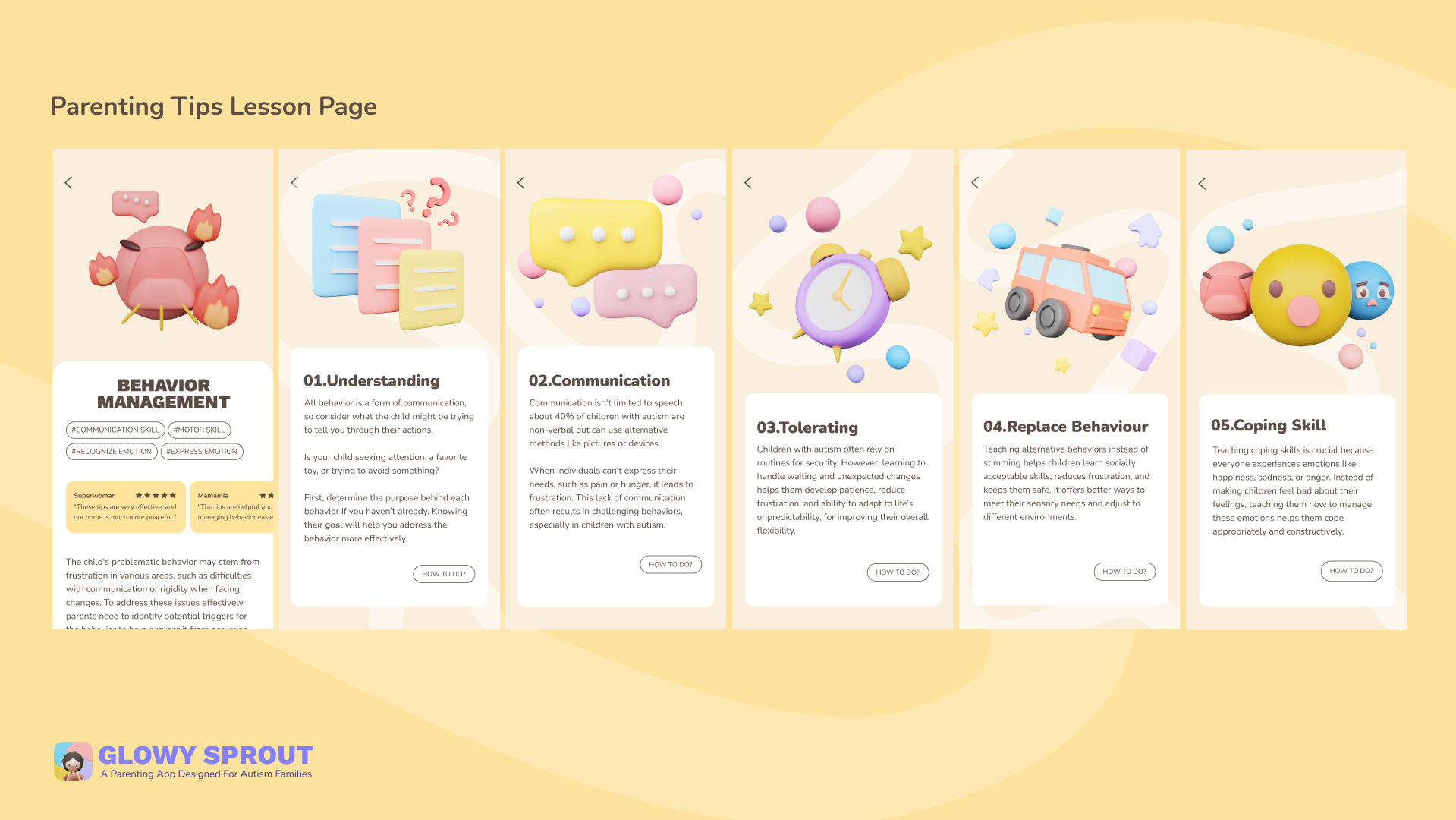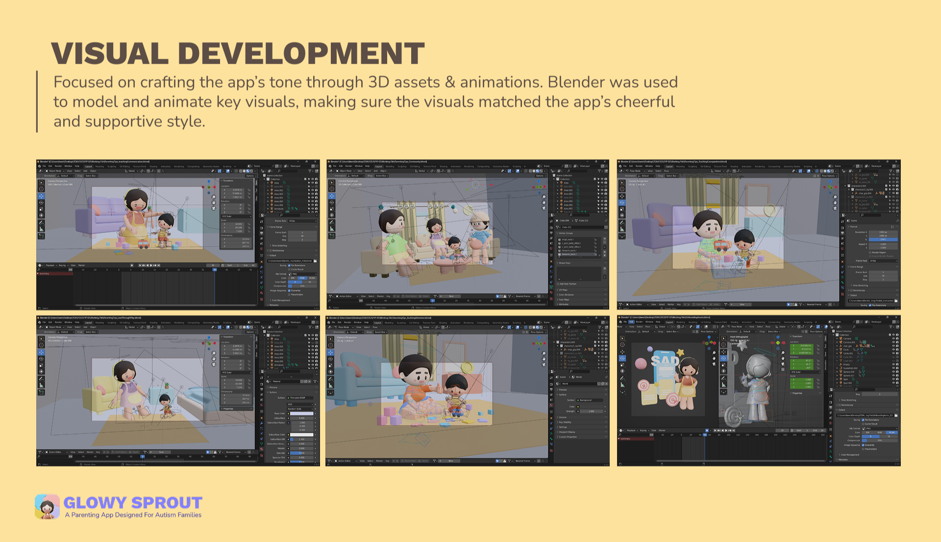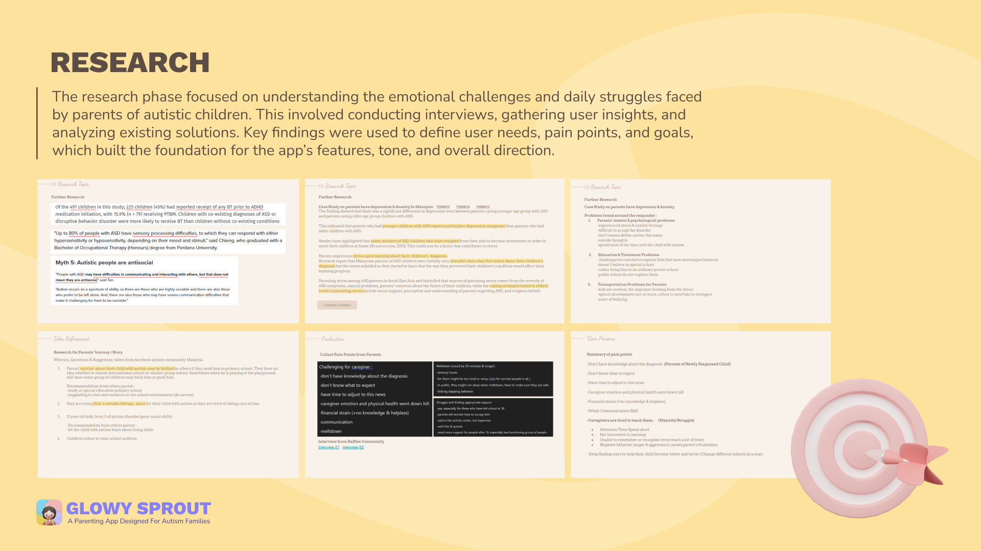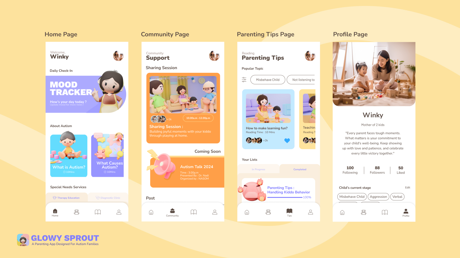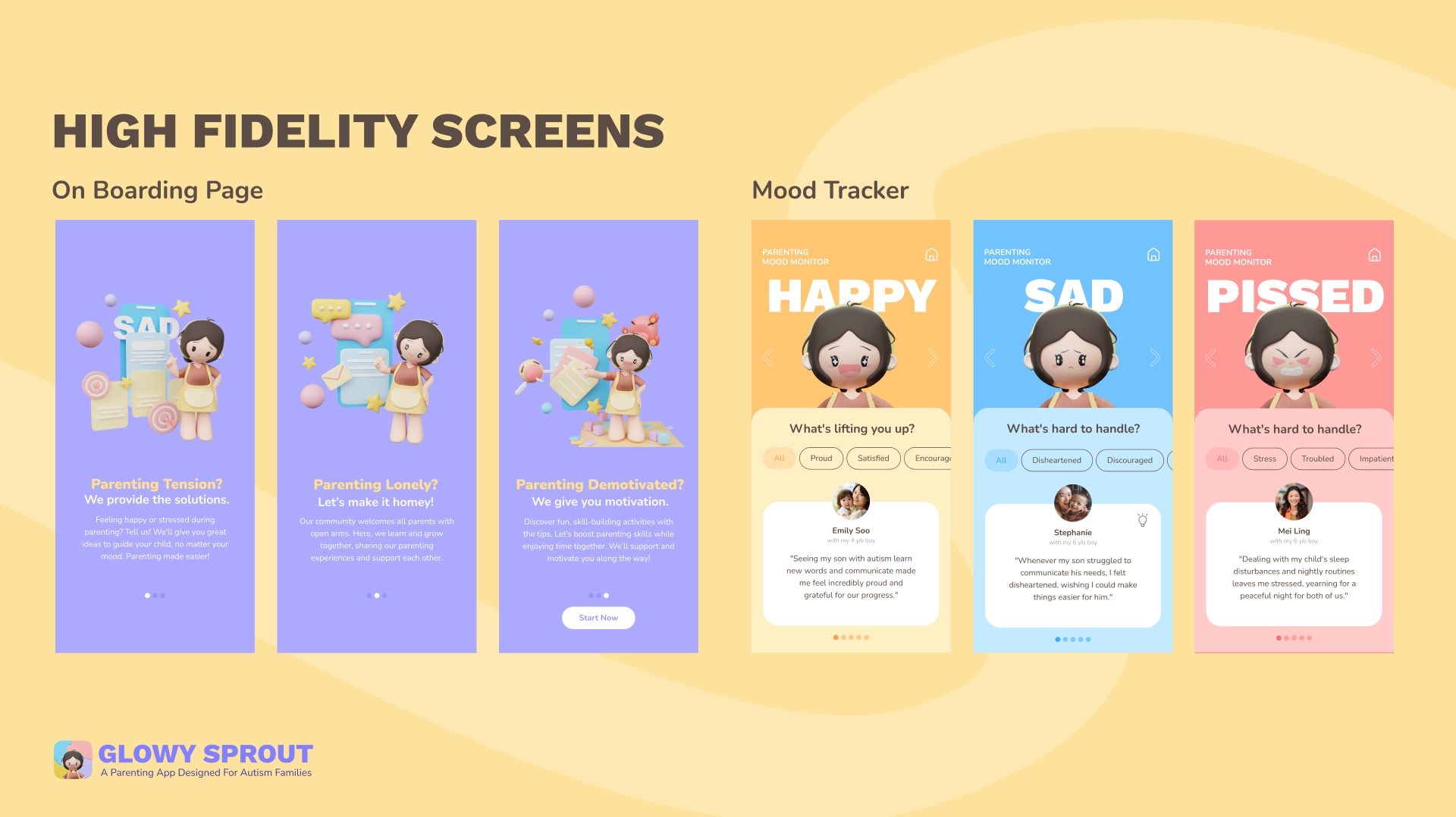 Glowy Sprout is a mobile companion app designed to support parents with autistic children by featuring playful 3D characters, uplifting animations, and a friendly color palette. Glowy Sprout creates a comforting digital environment that gently motivates parents. It monitors emotional well-being through mood tracking and responds with personalized tips, motivational messages, and scenario-based mini-tests to help parents prepare for real-life challenges. For a comprehensive overview of the research, design process, and development journey behind Glowy Sprout, the full documentation slides can be accessed here: https://docs.google.com/presentation/d/1_Ur5cAkJ_ez3tr3oeK-WV_dUPv_N5qI7lKy0HK6gHbw/edit?usp=sharing