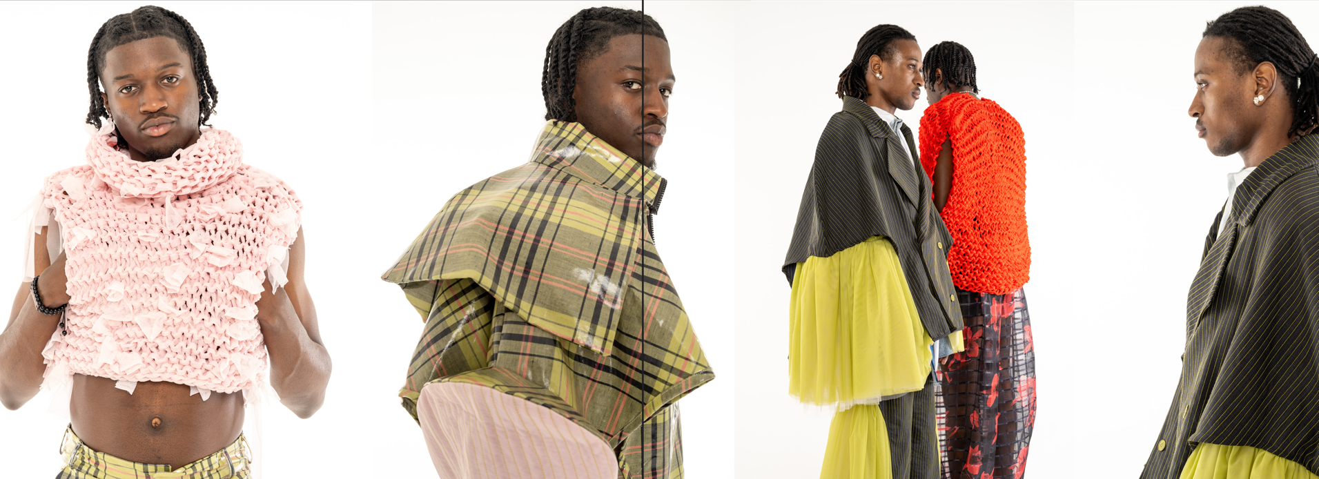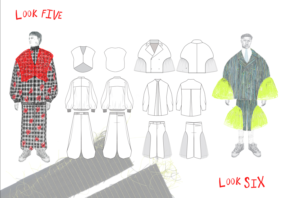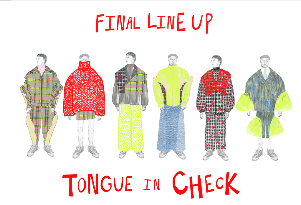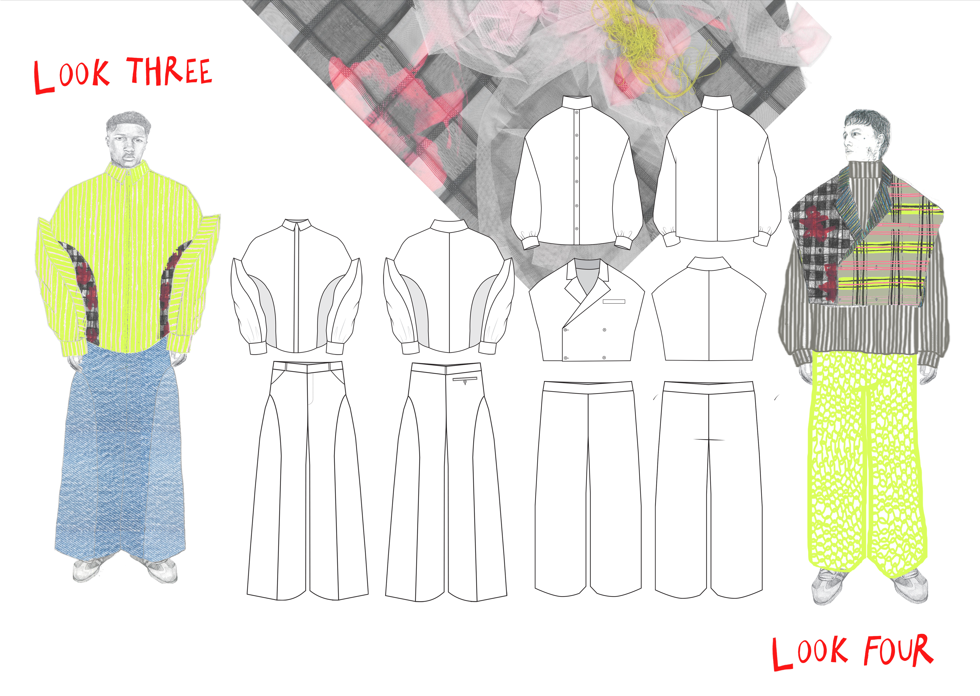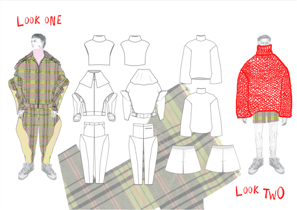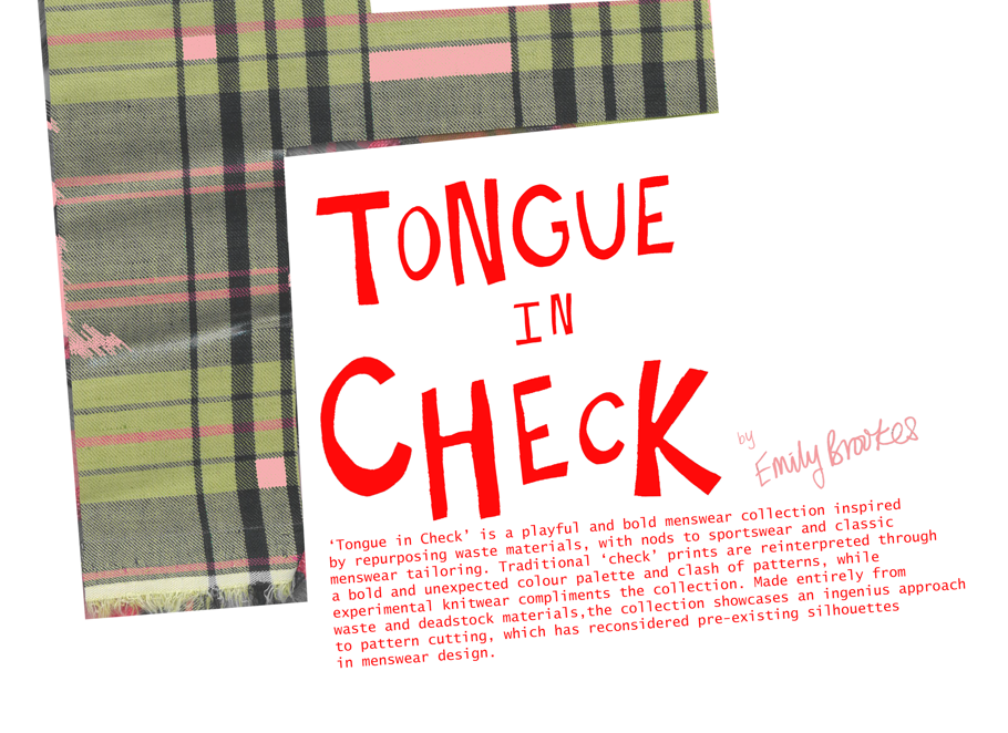 ‘Tongue in Check’ is a playful and bold menswear collection inspired by repurposing waste materials, with nods to sportswear and traditional menswear tailoring. Brookes reinterprets the use of traditional ‘check’ prints found in men’s suiting through a bold and unexpected colour palette and clash of patterns. Using deadstock materials across the entire collection, she showcases an ingenious approach to pattern cutting, which has reconsidered pre-existing silhouettes in menswear design. The collection also features an investigational approach to knitwear design by using unconventional yarns, such as tulle and netting, which have been generated as a by-product of the garment construction process.