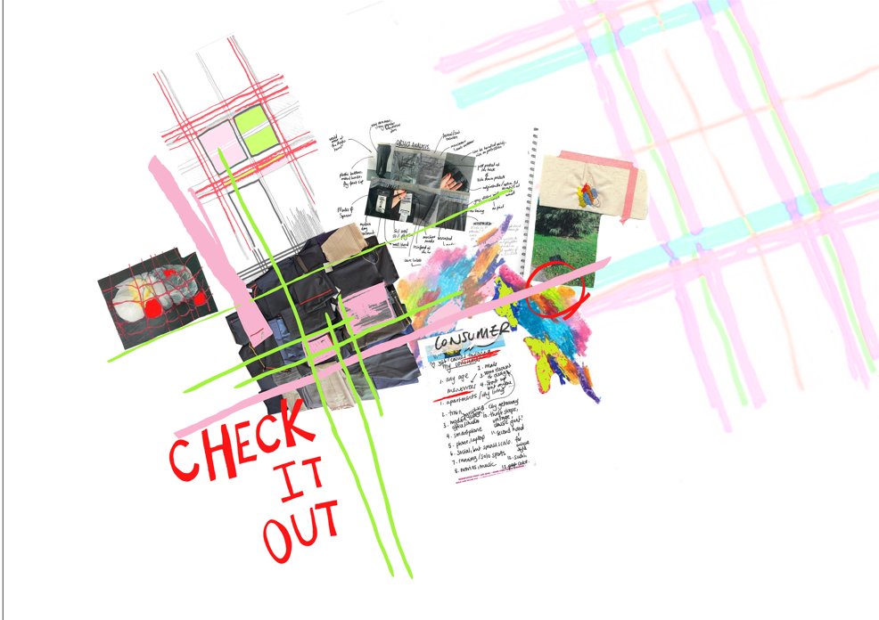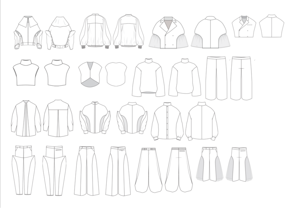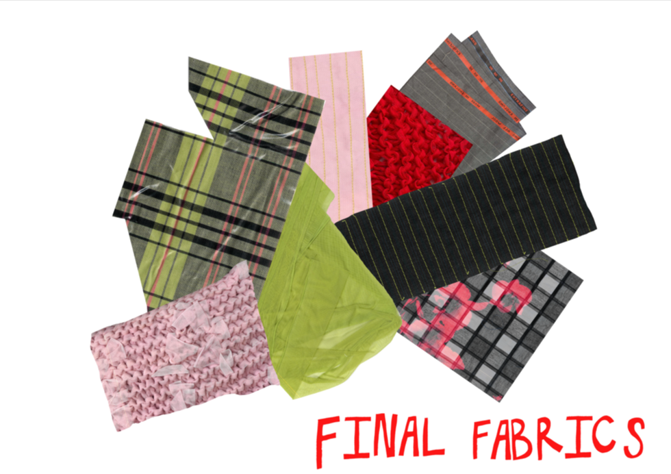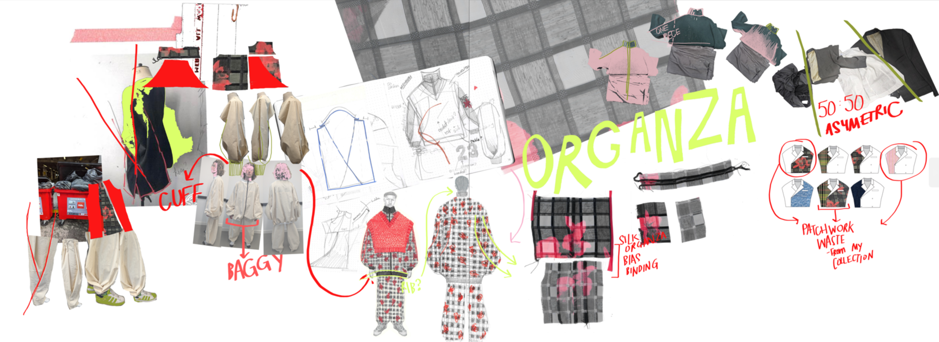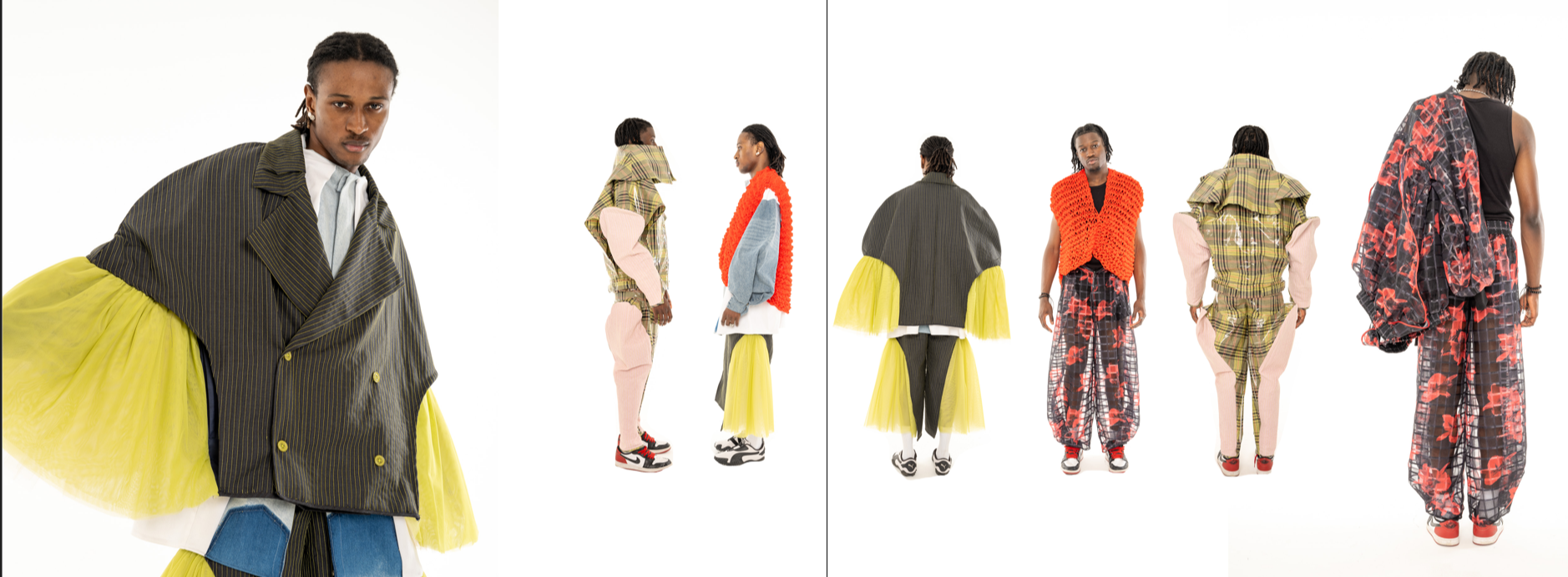 ‘Tongue in Check’ is a playful and bold menswear collection inspired by repurposing waste materials, with nods to sportswear and traditional menswear tailoring. Brookes reinterprets the use of traditional ‘check’ prints found in men’s suiting through a bold and unexpected colour palette and clash of patterns. Using deadstock materials across the entire collection, she showcases an ingenious approach to pattern cutting, which has reconsidered pre-existing silhouettes in menswear design. The collection also features an investigational approach to knitwear design by using unconventional yarns, such as tulle and netting, which have been generated as a by-product of the garment construction process.
