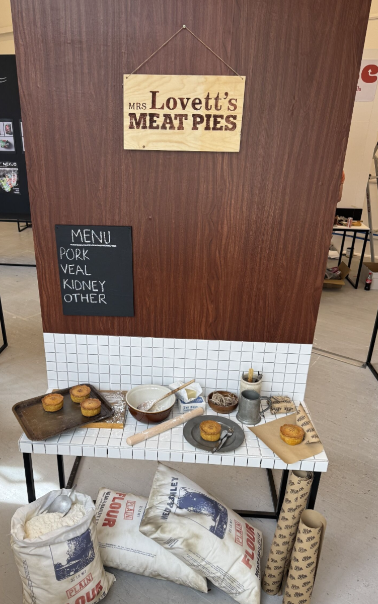 The award-winning musical, Sweeney Todd: The Demon Barber of Fleet Street by Steven Sondheim has been reimagined into countless movie adaptions that tells the tale of Benjamin Barker, a barber who was sent away from his family on a false charge. 15 years later he returns to London with a new name, seeking revenge on the Judge who wrongly accused him. Mrs Lovett, a baker lady who lives below his Barber Shop, helps Todd in his plans of luring customers in for a shave, by disposing of the bodies and turning them into the best-selling meat pies in Fleet Street. I've chosen Mrs Lovett's Pie Shop to inspire 3 graphic props, that I have handcrafted through digital and analogue techniques, to enrich her dusty old pie shop and add more visual depth to the storyline to create verisimilitude within the viewer.