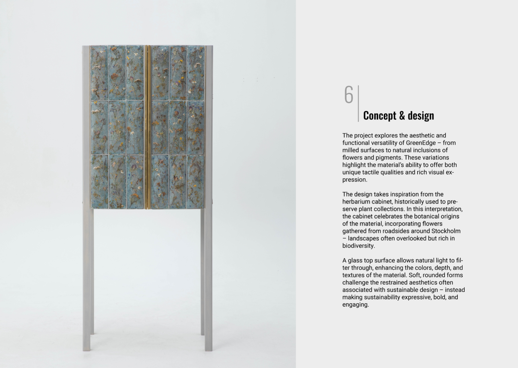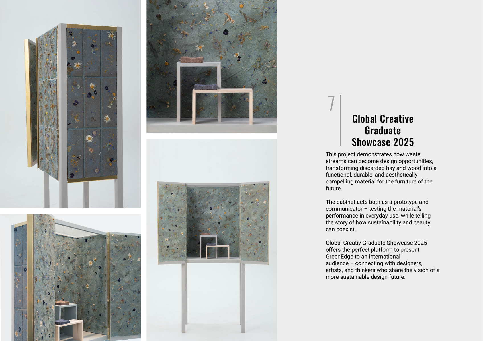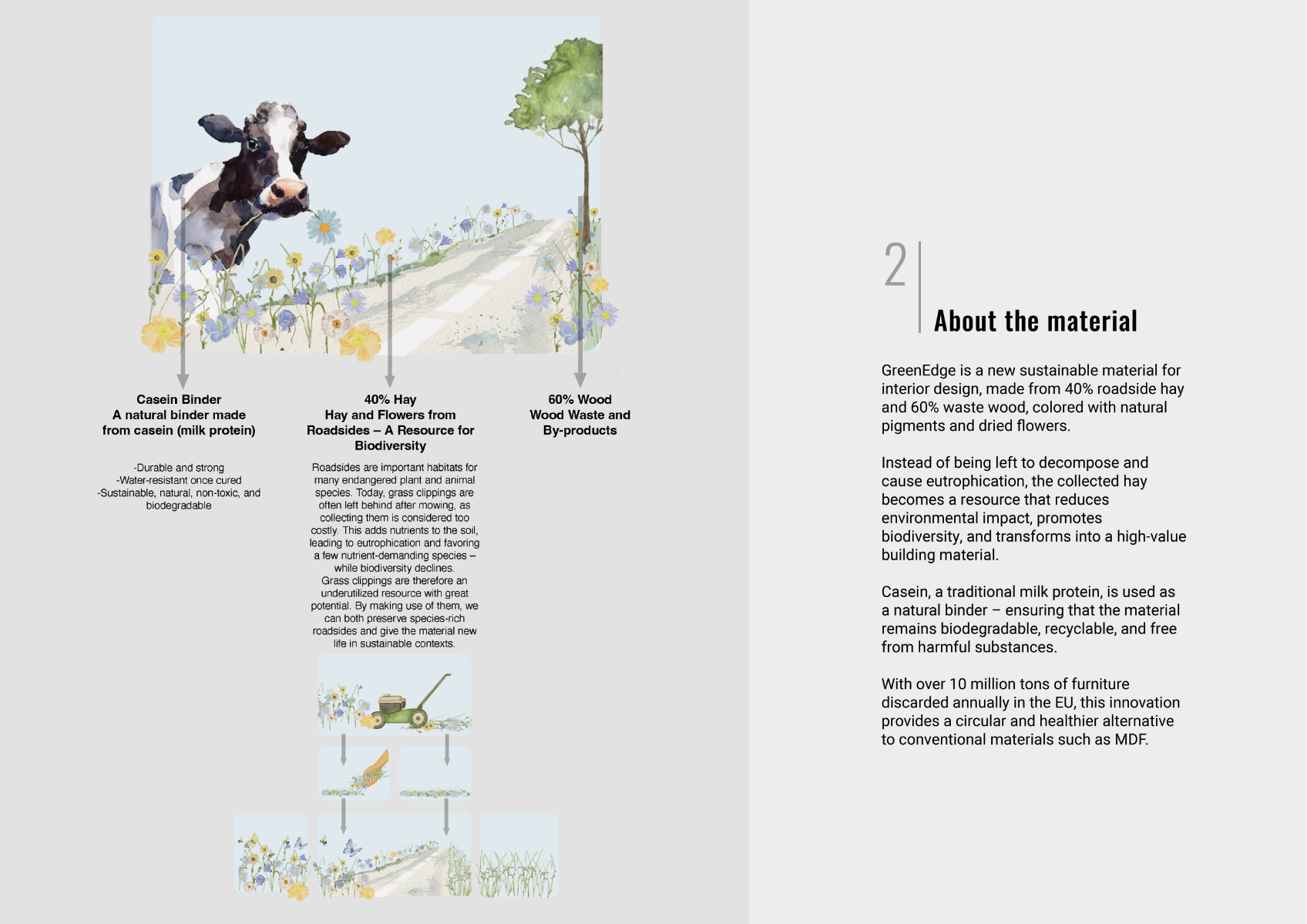 The Green Edge project explores the potential of creating a new sustainable material for furniture production. By combining grass clippings from ecologically valuable roadside areas with wood waste from CNC milling, it develops a bio-based resource that both reduces waste and makes use of overlooked natural materials. The outcome is a piece of furniture that highlights the origin of the material and tells a story of circularity, innovation, and sustainable design. The project demonstrates how local resources can be transformed into the furniture of tomorrow, emphasizing the need to rethink both material choices and production methods.