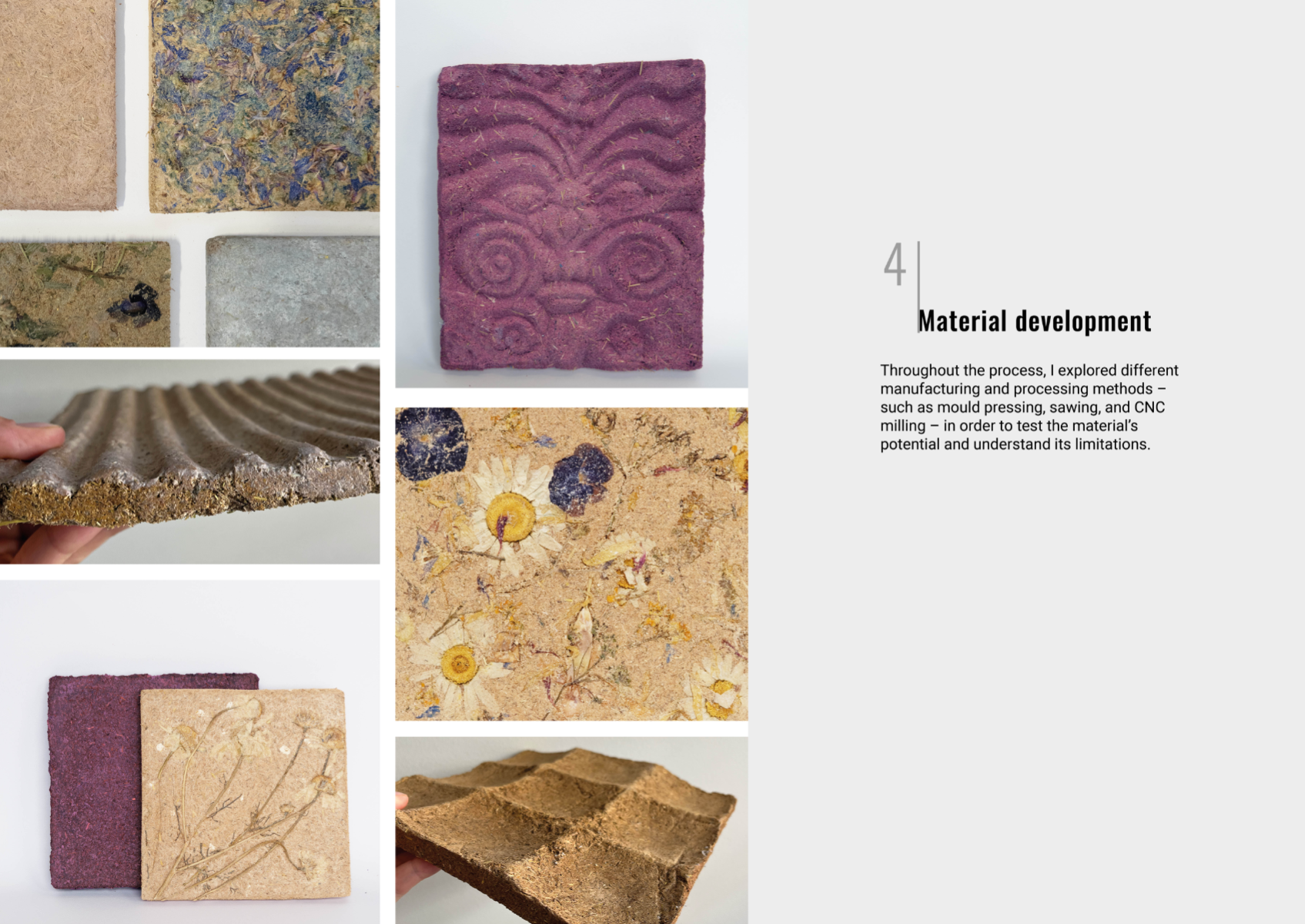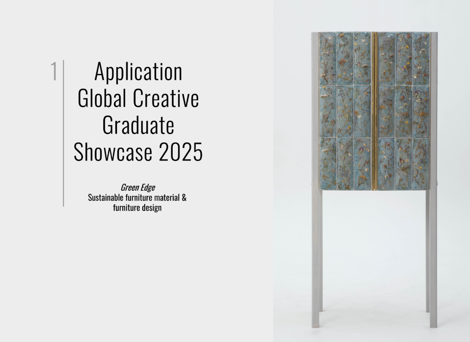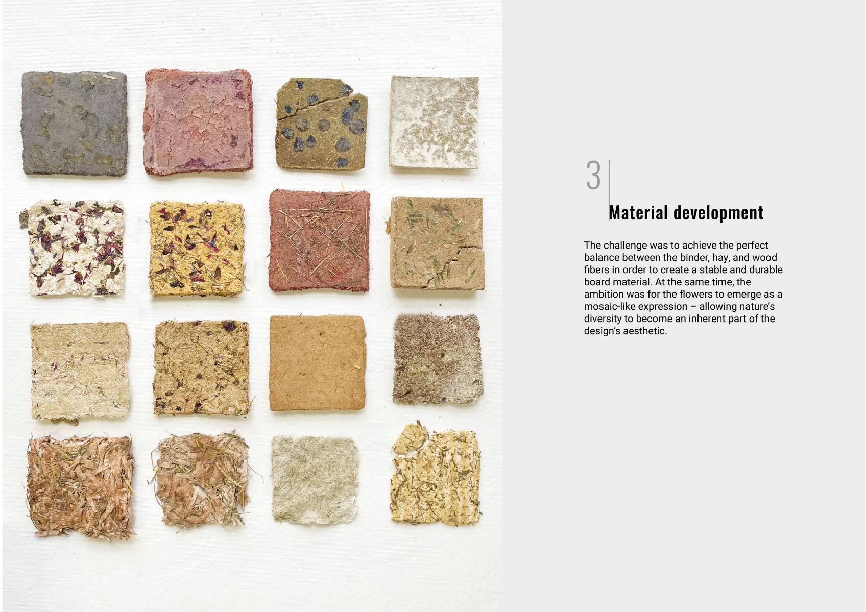 The Green Edge project explores the potential of creating a new sustainable material for furniture production. By combining grass clippings from ecologically valuable roadside areas with wood waste from CNC milling, it develops a bio-based resource that both reduces waste and makes use of overlooked natural materials. The outcome is a piece of furniture that highlights the origin of the material and tells a story of circularity, innovation, and sustainable design. The project demonstrates how local resources can be transformed into the furniture of tomorrow, emphasizing the need to rethink both material choices and production methods.