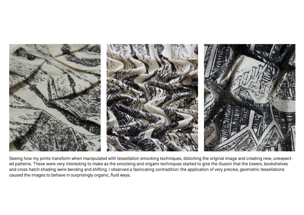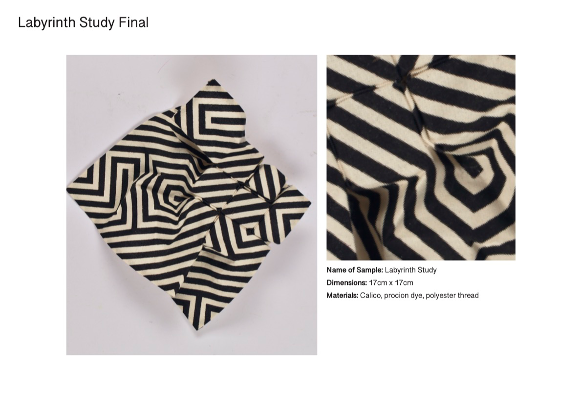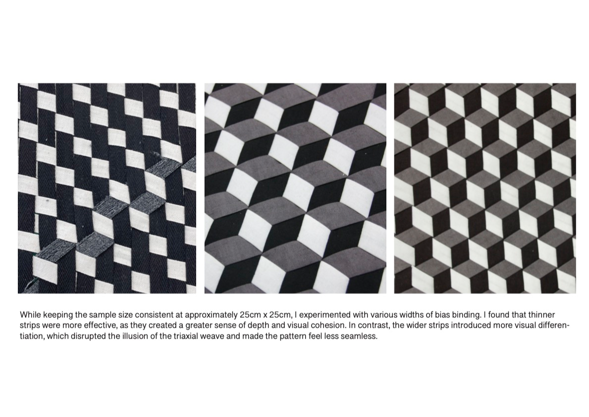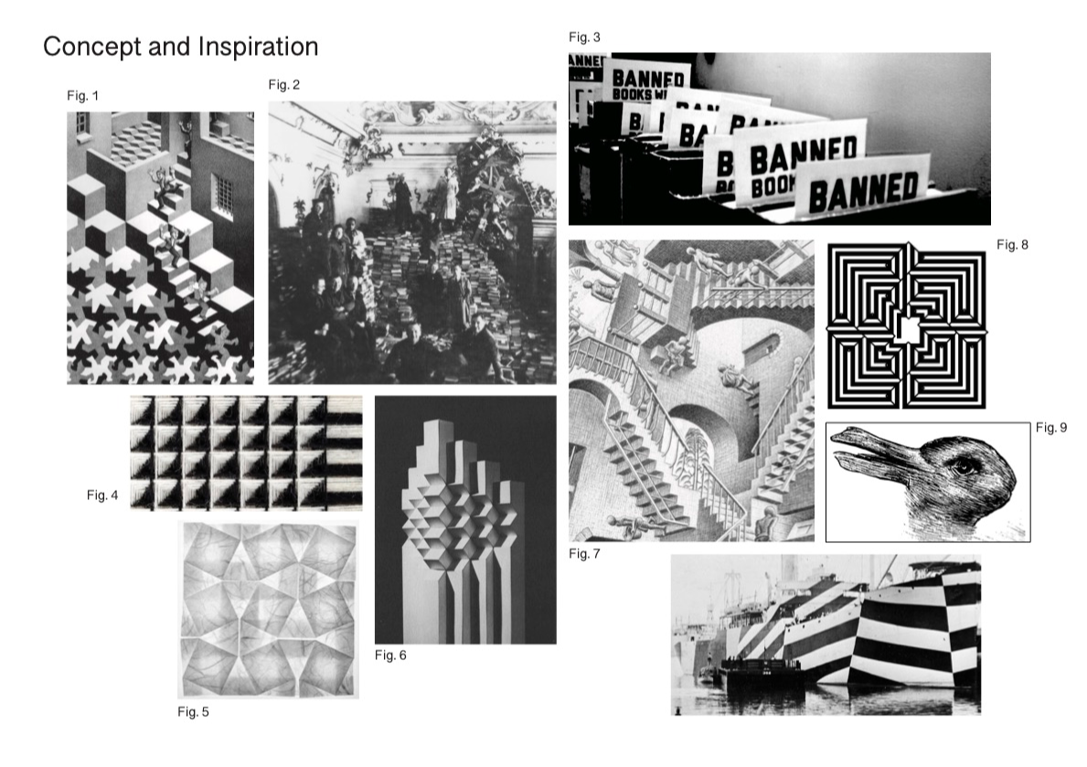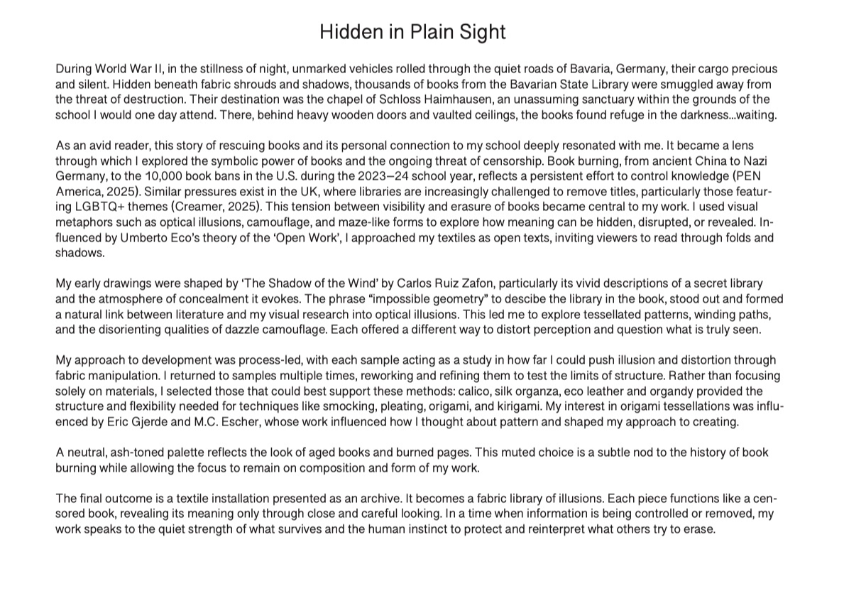 During World War II, thousands of books from the Bavarian State Library were hidden in the chapel of Schloss Haimhausen, later my school. This story of rescue and its link to my own life, inspired my exploration of books as symbols of memory and censorship. From ancient book burnings to modern bans in the US and UK, the control of knowledge persists. My textiles use optical illusions, labyrinth forms, and tessellations to explore visibility and erasure. Influenced by Umberto Eco, Eric Gjerde, and M.C. Escher, I create ash-toned, illusion-based fabrics that invite close reading, echoing the act of uncovering hidden histories.