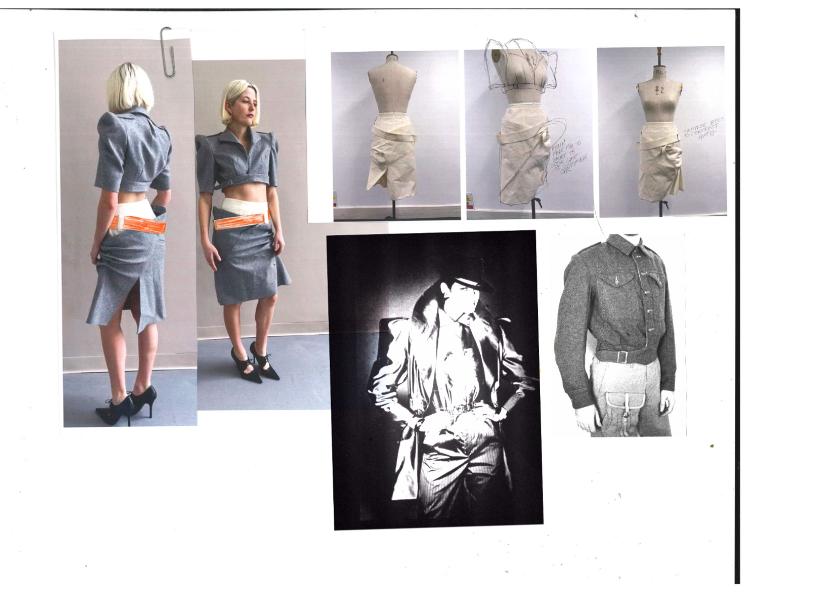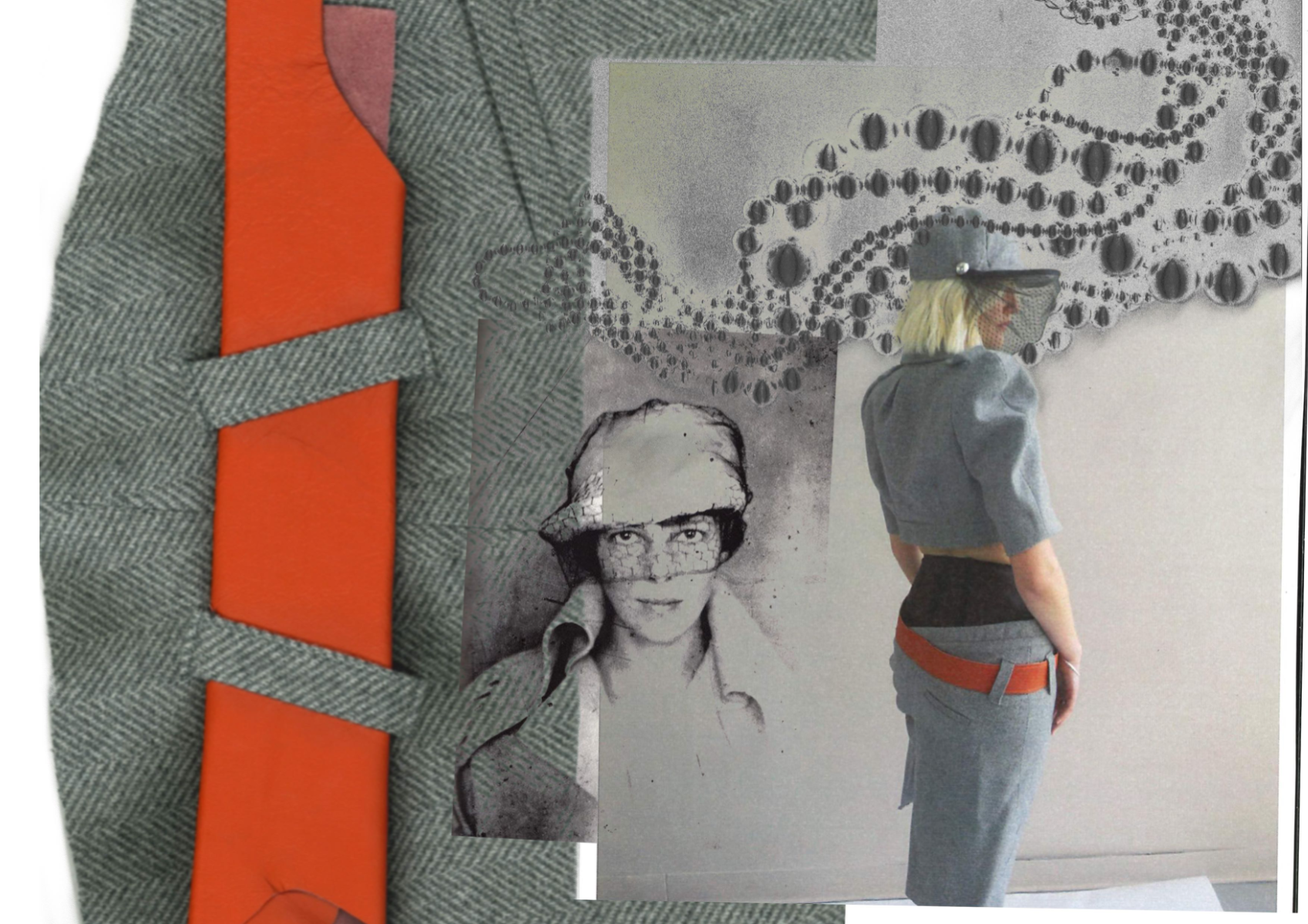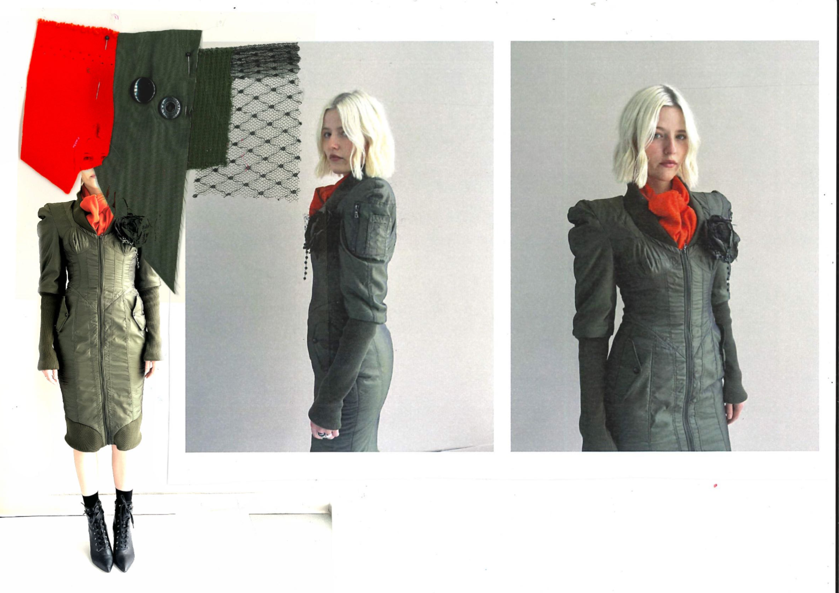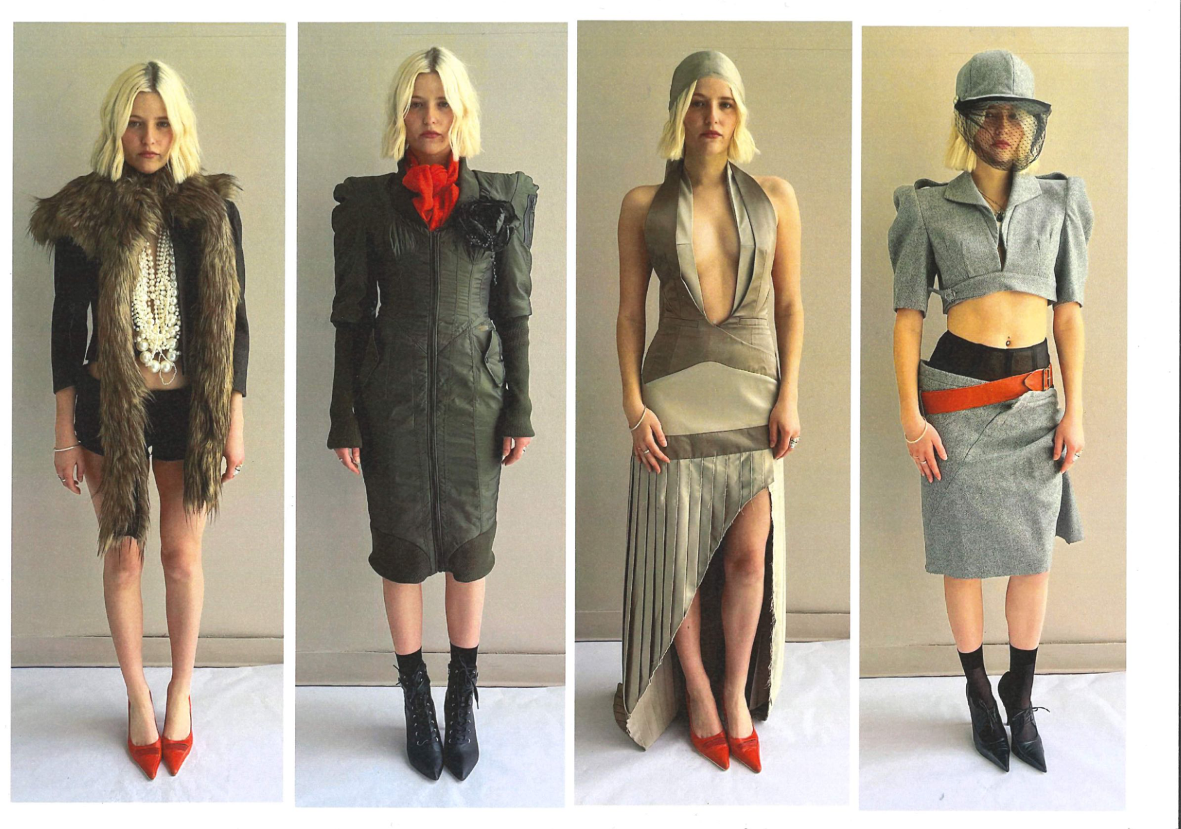 At the heart of Hotsy Totsy is a persona: my interpretation of a 1920s term used to describe someone ostentatiously fashionable. She’s a woman of the past, dressed for the future—immaculate, in control, and magnetic without trying. Influenced by classic military uniforms from the 1940s—particularly the MA-1 bomber and flight suit—combined with the opulence of 1930s silhouettes, the collection offers a sharp, satirical take on vintage glamour reimagined through a modern lens. I paired luxurious and utilitarian fabrics to echo the blend of 1930s elegance and 1940s military structure. A palette of greys, taupes and greens—punctuated by bright orange—references artillery linings. Detail-heavy topstitching reinforces craftsmanship, while trompe l’oeil effects reveal mesh underskirts and underwear at the back of garments for a playful twist. Draping techniques developed during my placements helped shape sensual, wrapped forms—especially the twisted waistcoat dress, which merges seduction and strength.