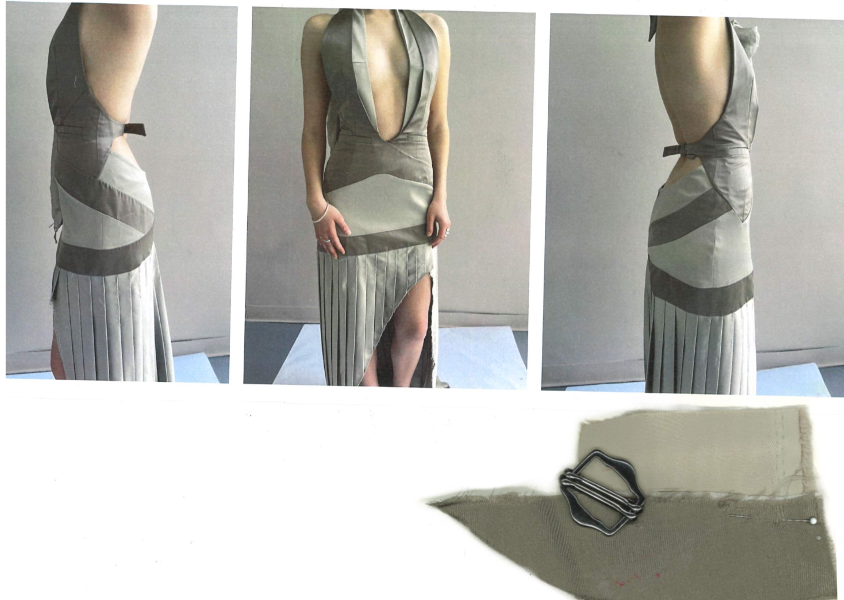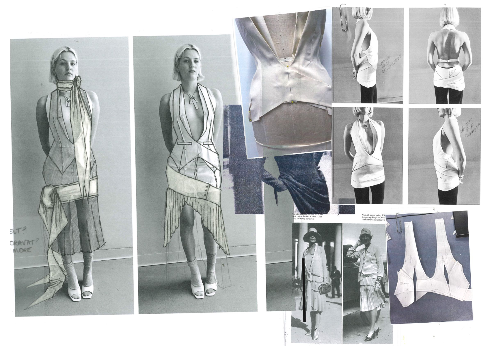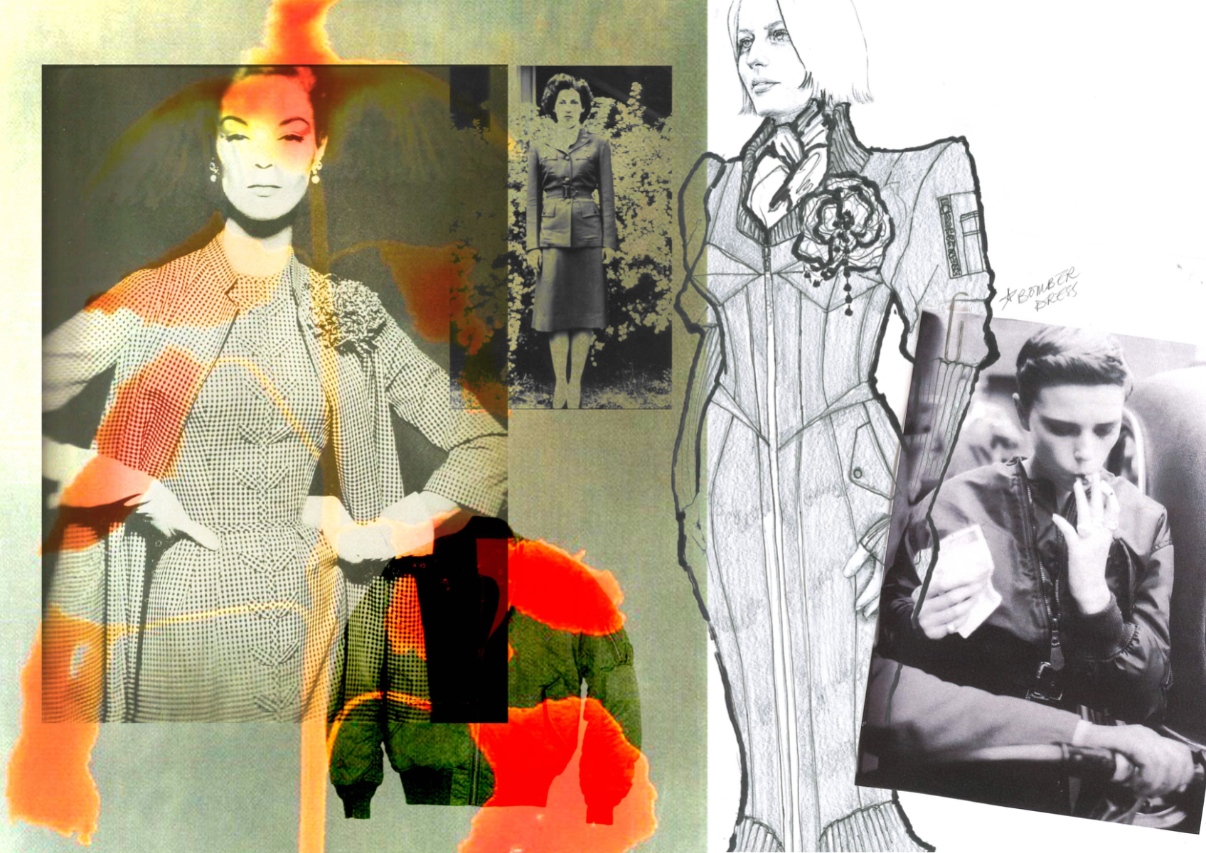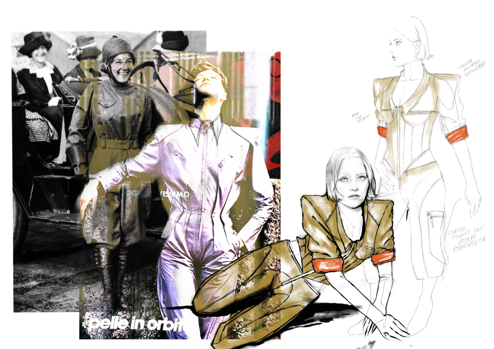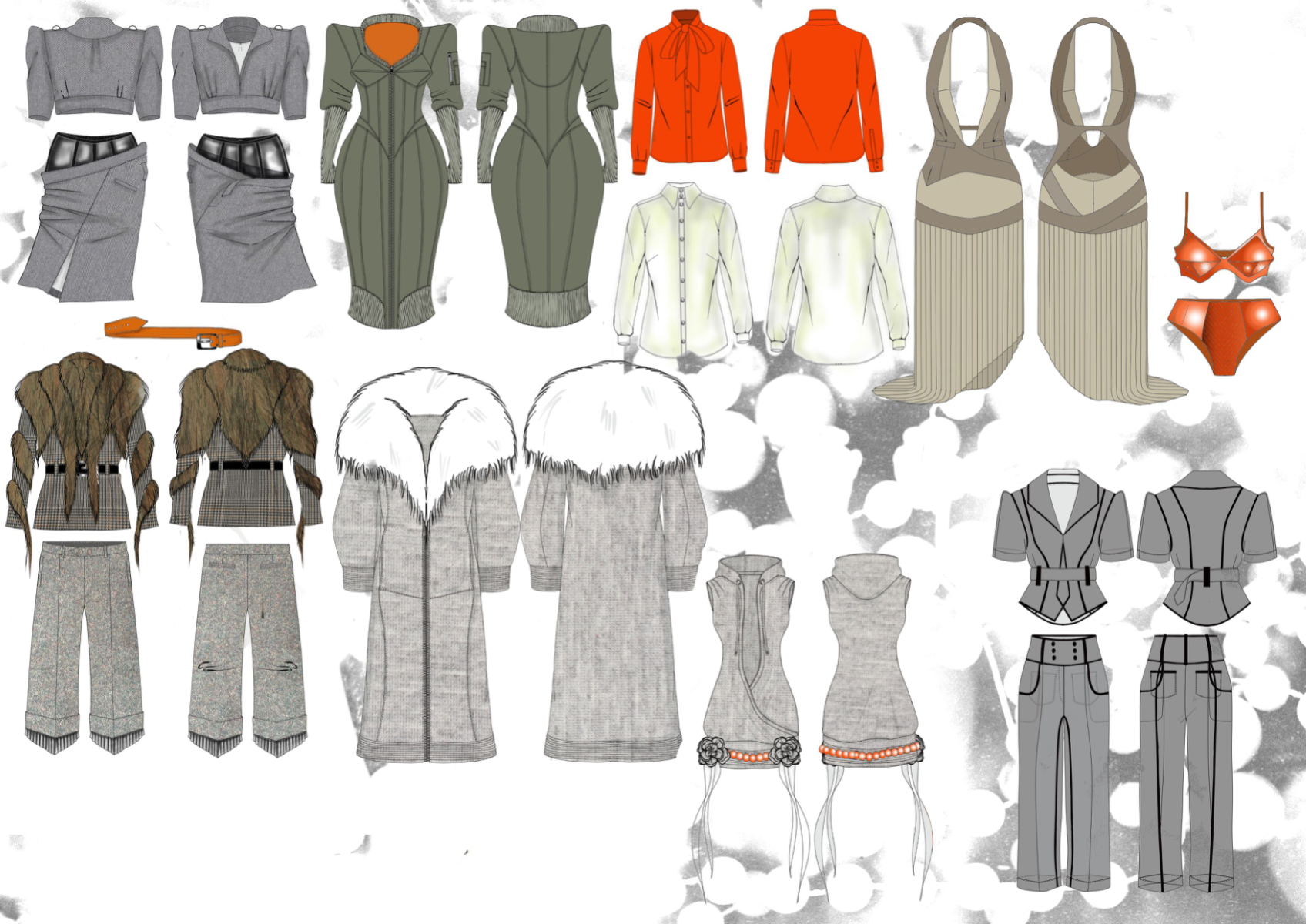 At the heart of Hotsy Totsy is a persona: my interpretation of a 1920s term used to describe someone ostentatiously fashionable. She’s a woman of the past, dressed for the future—immaculate, in control, and magnetic without trying. Influenced by classic military uniforms from the 1940s—particularly the MA-1 bomber and flight suit—combined with the opulence of 1930s silhouettes, the collection offers a sharp, satirical take on vintage glamour reimagined through a modern lens. I paired luxurious and utilitarian fabrics to echo the blend of 1930s elegance and 1940s military structure. A palette of greys, taupes and greens—punctuated by bright orange—references artillery linings. Detail-heavy topstitching reinforces craftsmanship, while trompe l’oeil effects reveal mesh underskirts and underwear at the back of garments for a playful twist. Draping techniques developed during my placements helped shape sensual, wrapped forms—especially the twisted waistcoat dress, which merges seduction and strength.