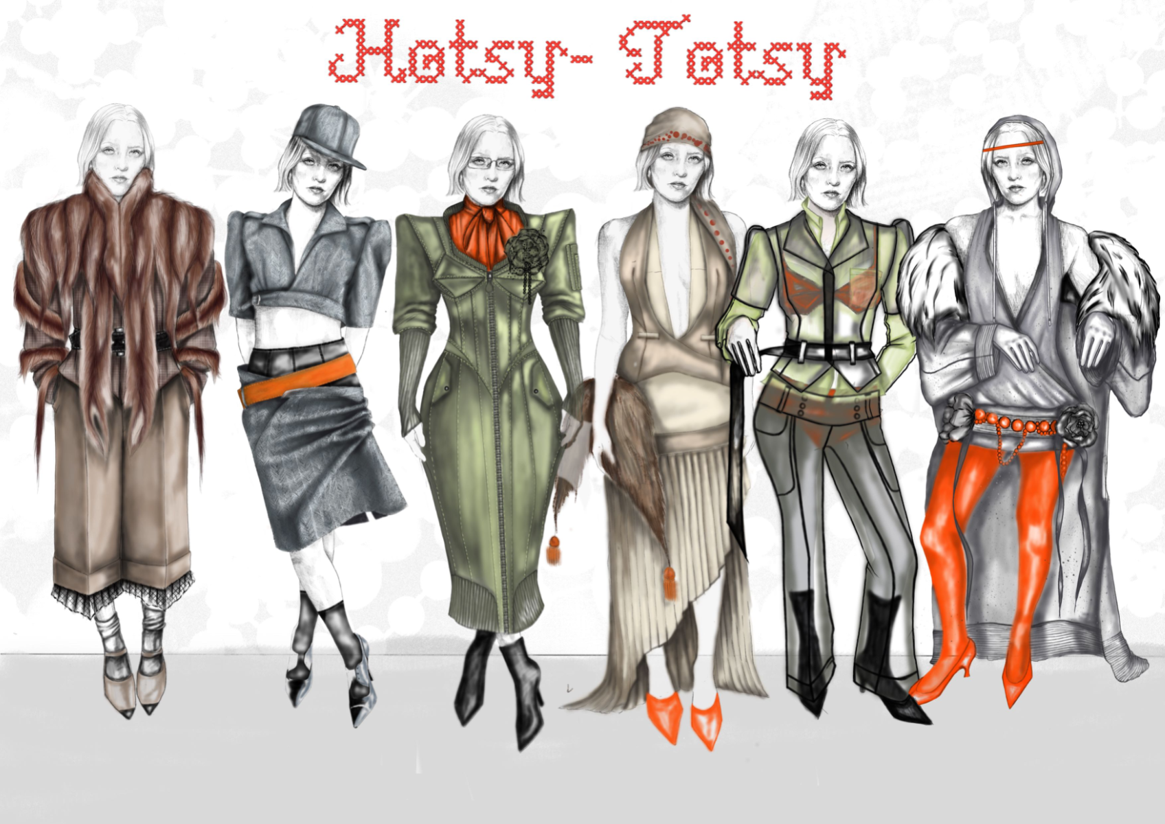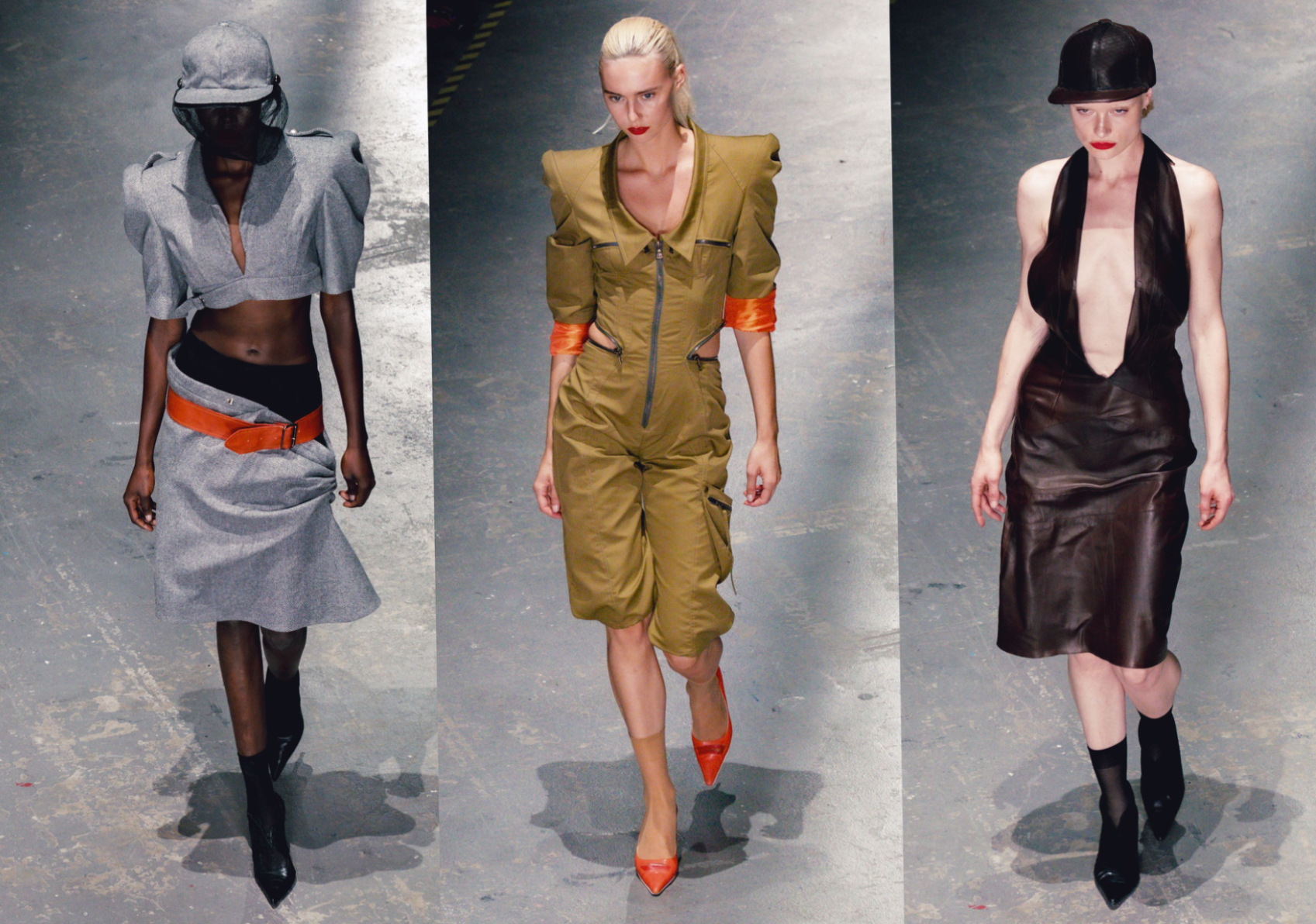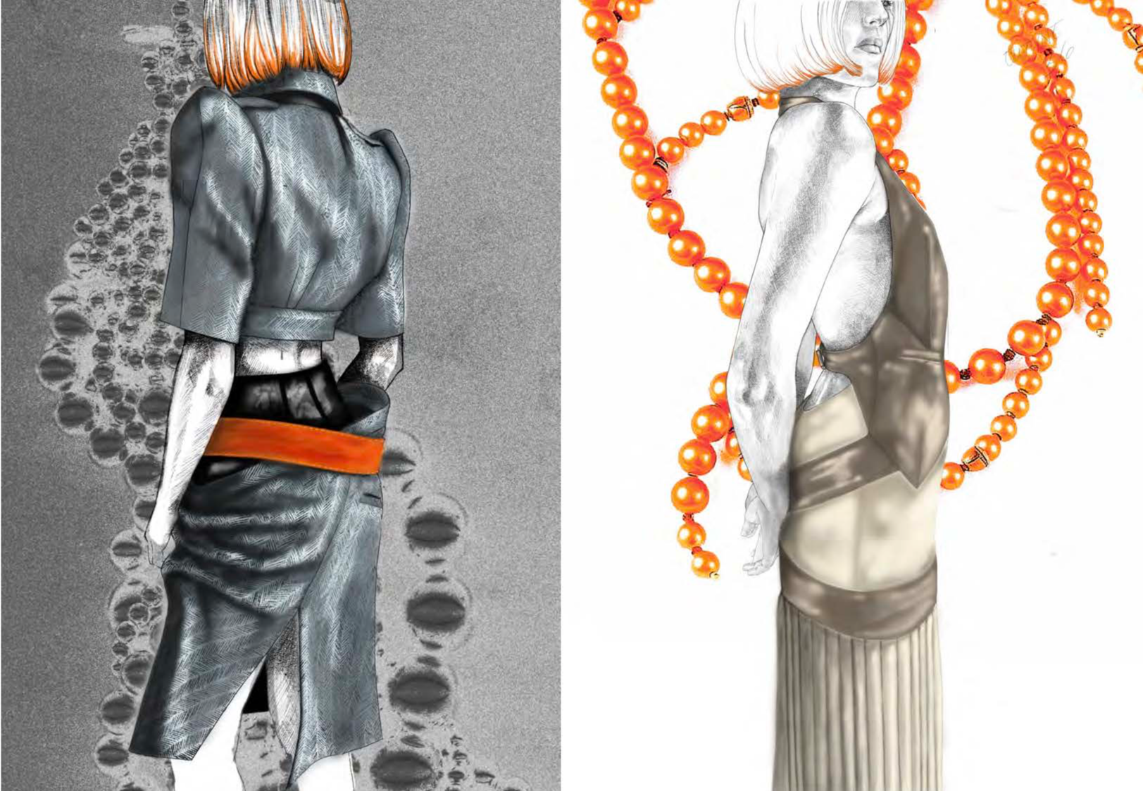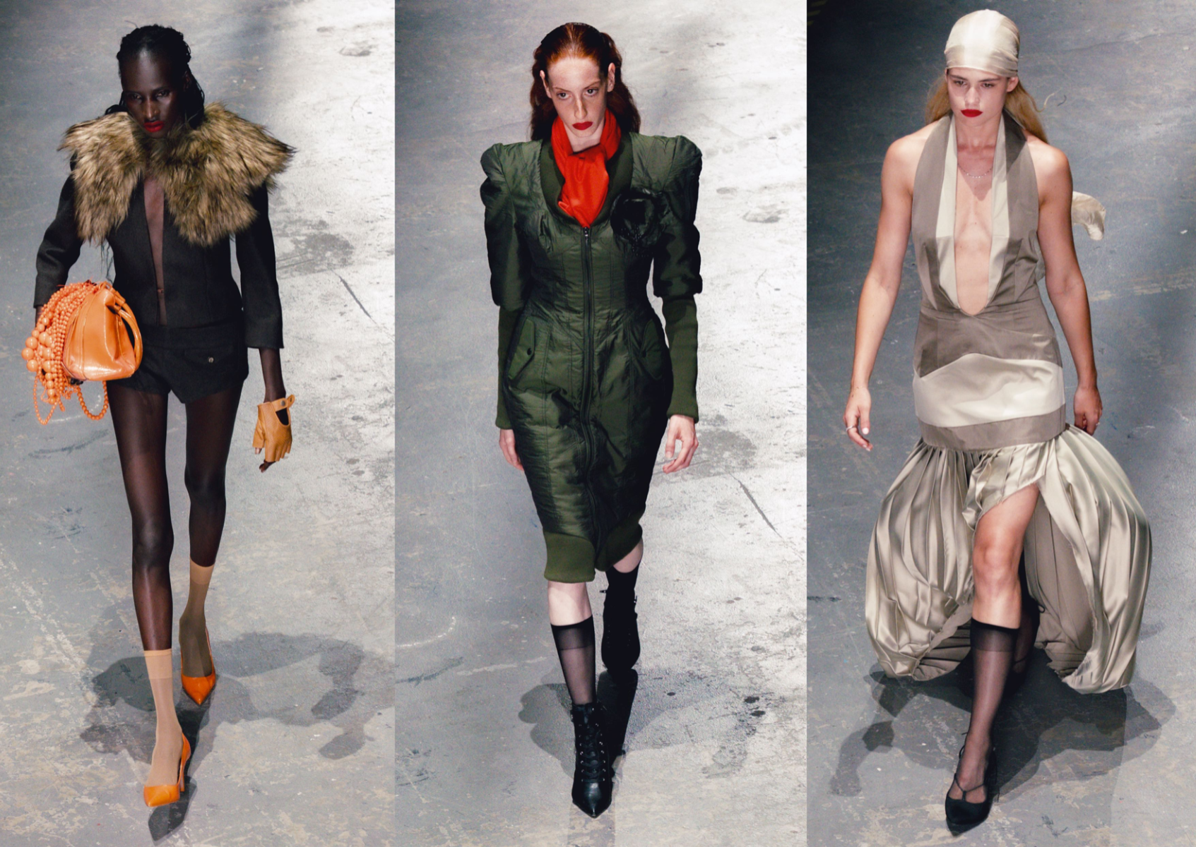 At the heart of Hotsy Totsy is a persona: my interpretation of a 1920s term used to describe someone ostentatiously fashionable. She’s a woman of the past, dressed for the future—immaculate, in control, and magnetic without trying. Influenced by classic military uniforms from the 1940s—particularly the MA-1 bomber and flight suit—combined with the opulence of 1930s silhouettes, the collection offers a sharp, satirical take on vintage glamour reimagined through a modern lens. I paired luxurious and utilitarian fabrics to echo the blend of 1930s elegance and 1940s military structure. A palette of greys, taupes and greens—punctuated by bright orange—references artillery linings. Detail-heavy topstitching reinforces craftsmanship, while trompe l’oeil effects reveal mesh underskirts and underwear at the back of garments for a playful twist. Draping techniques developed during my placements helped shape sensual, wrapped forms—especially the twisted waistcoat dress, which merges seduction and strength.