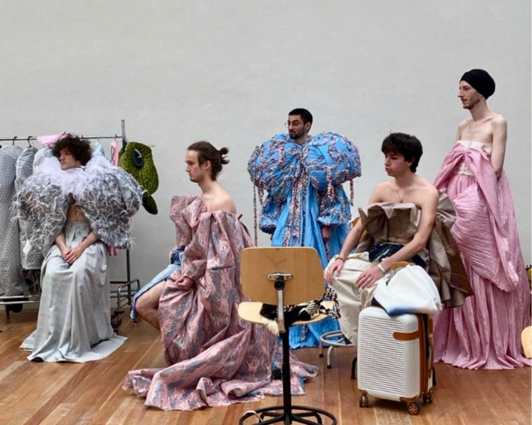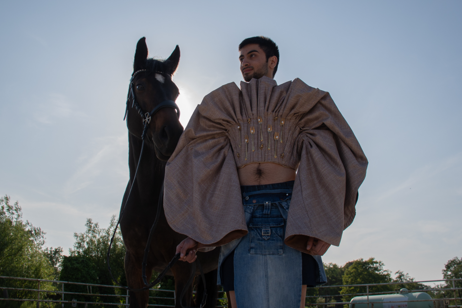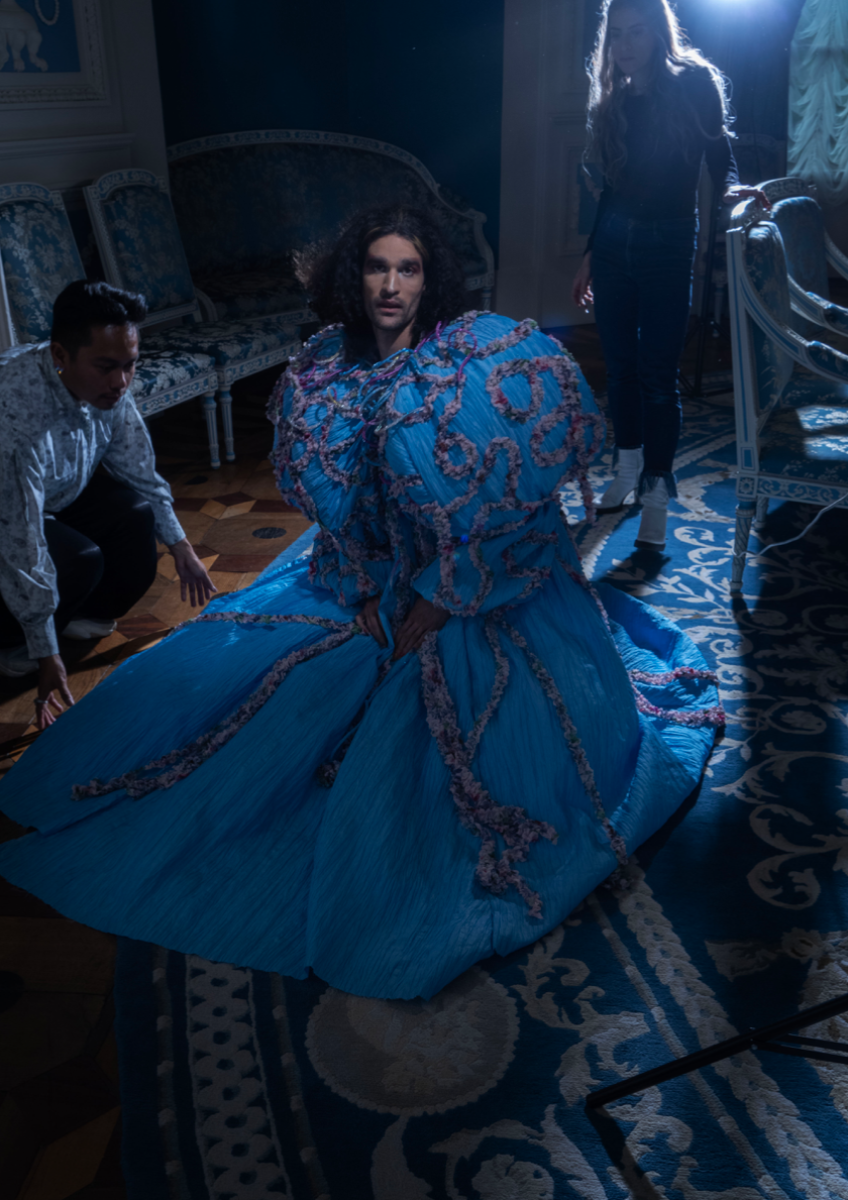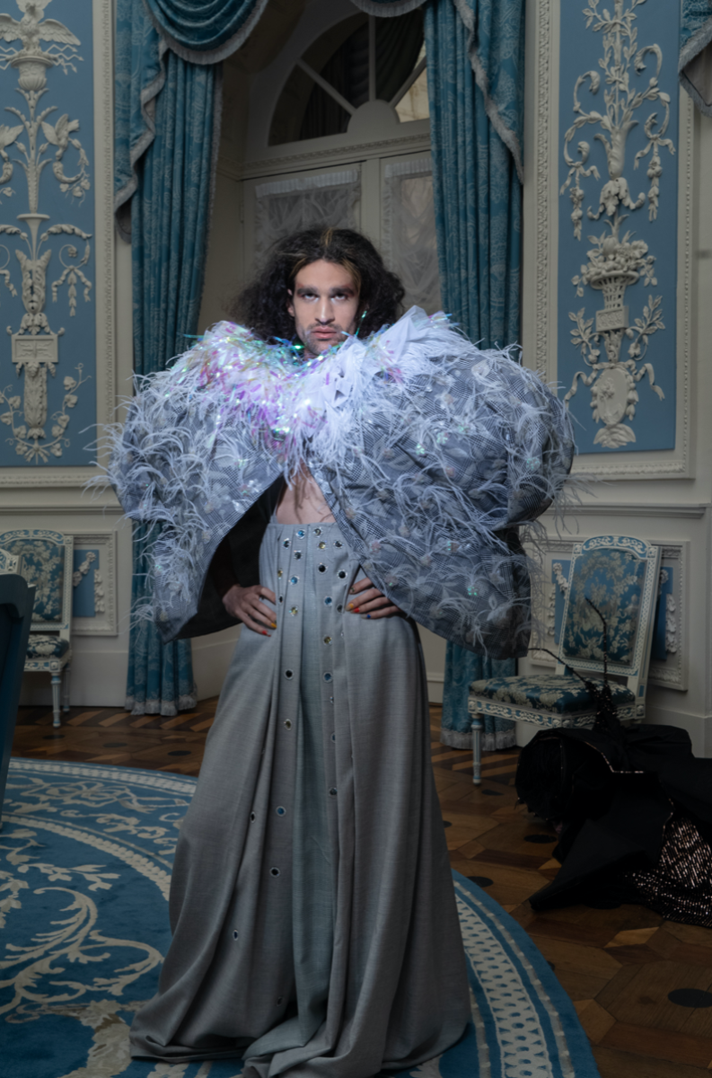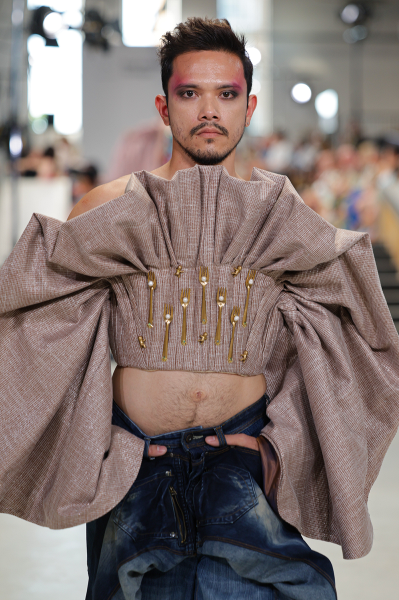 Imelda Marcos is a controversial image in the Philippines. She is the former first lady in the Philippines, known for her three thousand pairs of shoes and who hides diamonds in diapers as she fled the country. She uses beauty as a political tool. She justifies her beauty as a moral standard that everybody must aspire to be and to have. For the poor Filipinos, She is the image of beauty and the image of wealth. The value of beauty and image of money became synonymous. It is not because we value money more than beauty but because our society is structured on money. The story of money is our greatest invention according to Harrari. I am fascinated with this display of beauty. The line between opulence and tackiness, that spot between sweet perfume and rot. It is in this thin line where I try to grasp for the moment: diamonds in diapers. I made a couture collection for men. I try to capture a new sense of beauty in the collection by using men/they who are rough and raw. The collection tries to be couture luxury out from nothing, capturing the wealth myths of Imelda. I was trying to think like Imelda. I try to imitate and embody her values.I try to capture what is beautiful for Imelda. For her, Beauty is not luxury but an Art. She is the combination of Diamonds and Diaper. Hopefully, the collection will open a conversation and awareness on the influence of the Marcoses in the Philippine politics. This influence extended to erasing and distortion of Philippine history, as they glamorise the Marcos era. The use of beauty in this collection is my political tool in honouring the victims of the Marcoses and preserving the real history