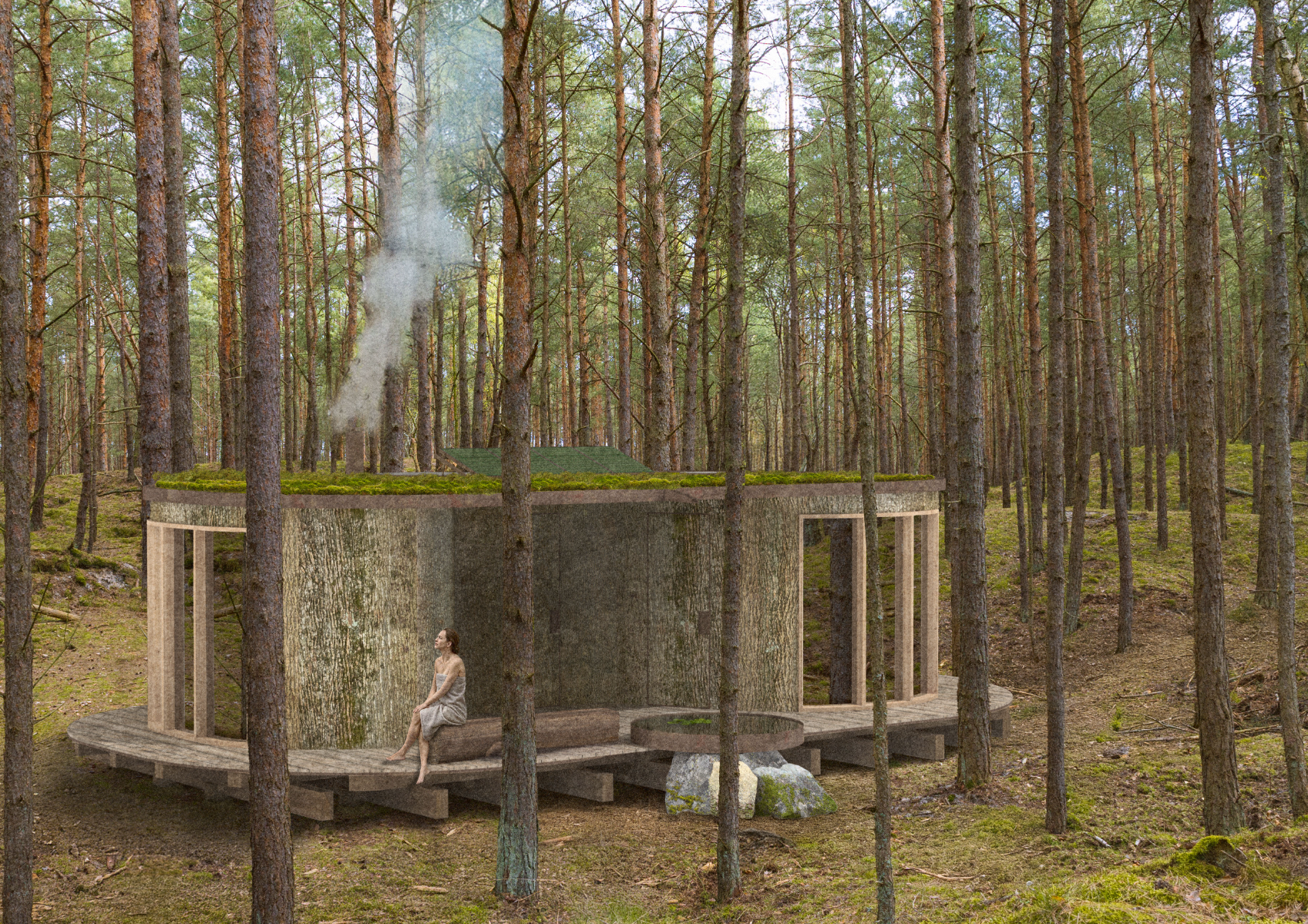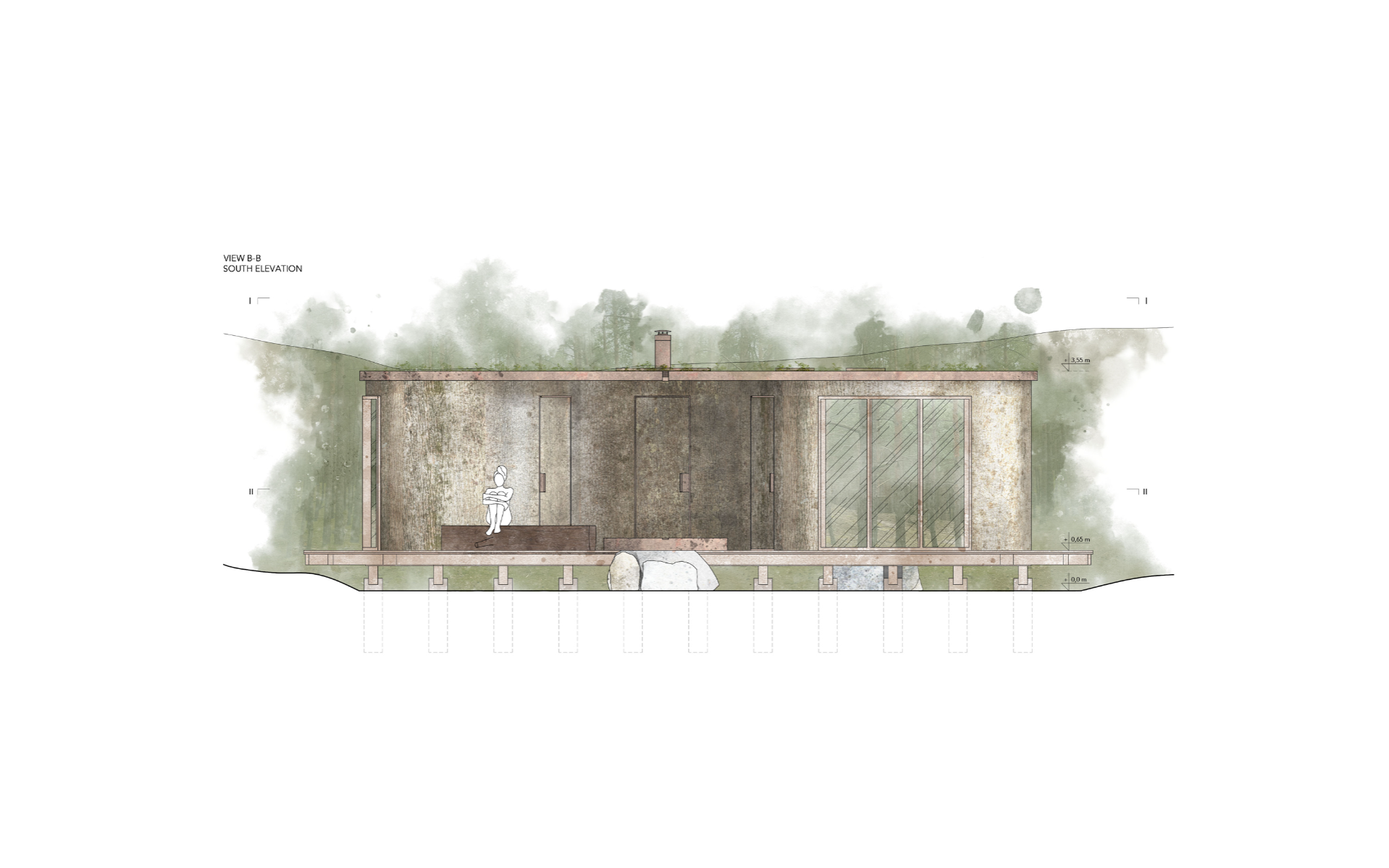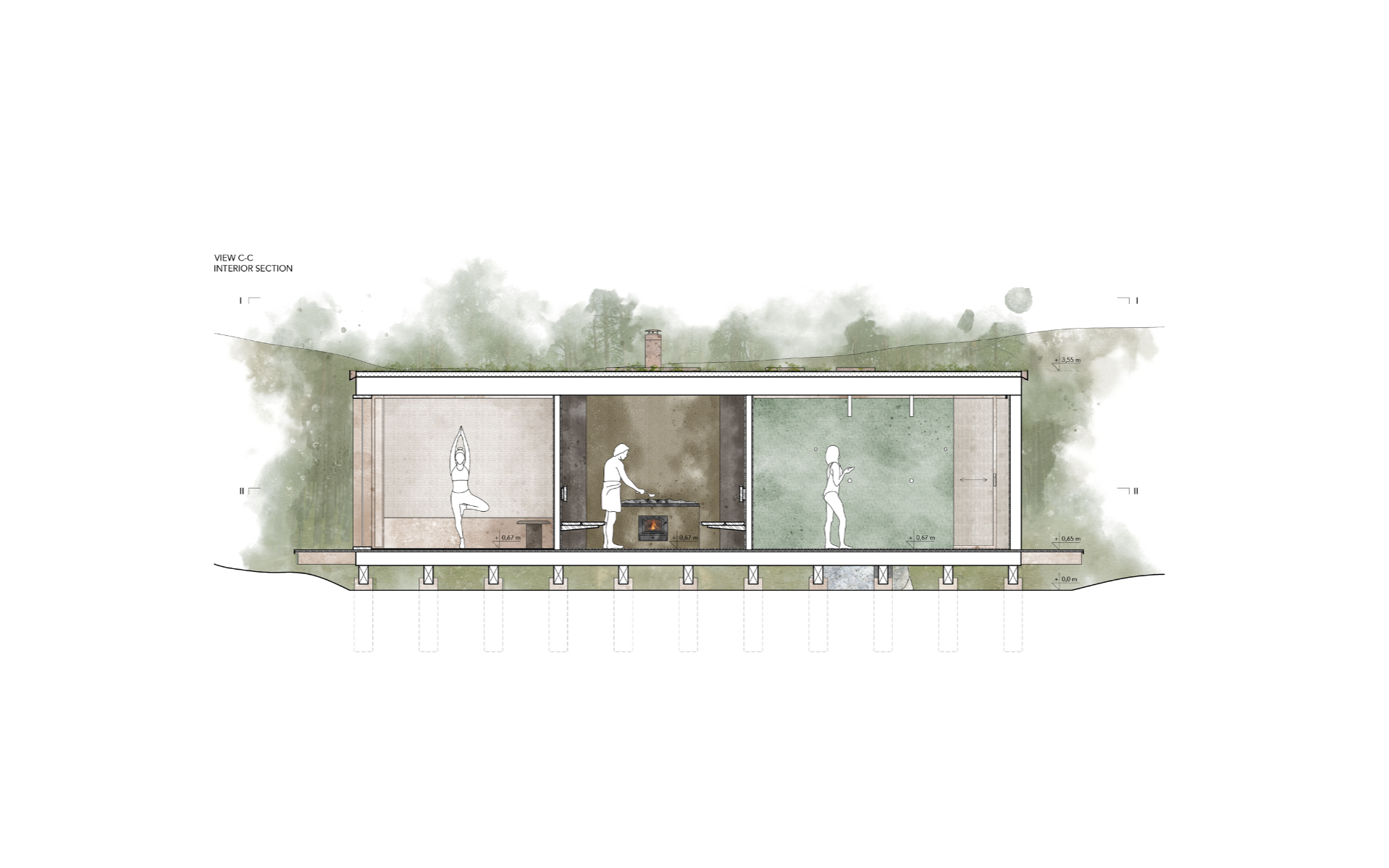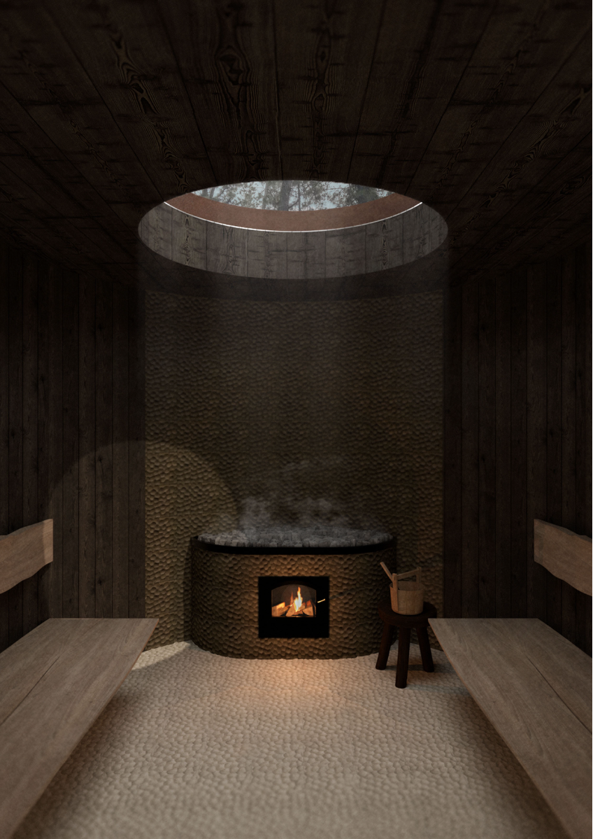 This project proposes an experimental forest refuge, a place to disconnect from the overstimulation of everyday life and reconnect with the body and senses. The architecture is designed around three core elements: heat, water, and nature, with each room offering a dedicated space for experiencing these in a mindful way. The building includes a wood- fired sauna, a water room for cleansing and cooling down, and a sensory room designed for rest, meditation, and tactile exploration.