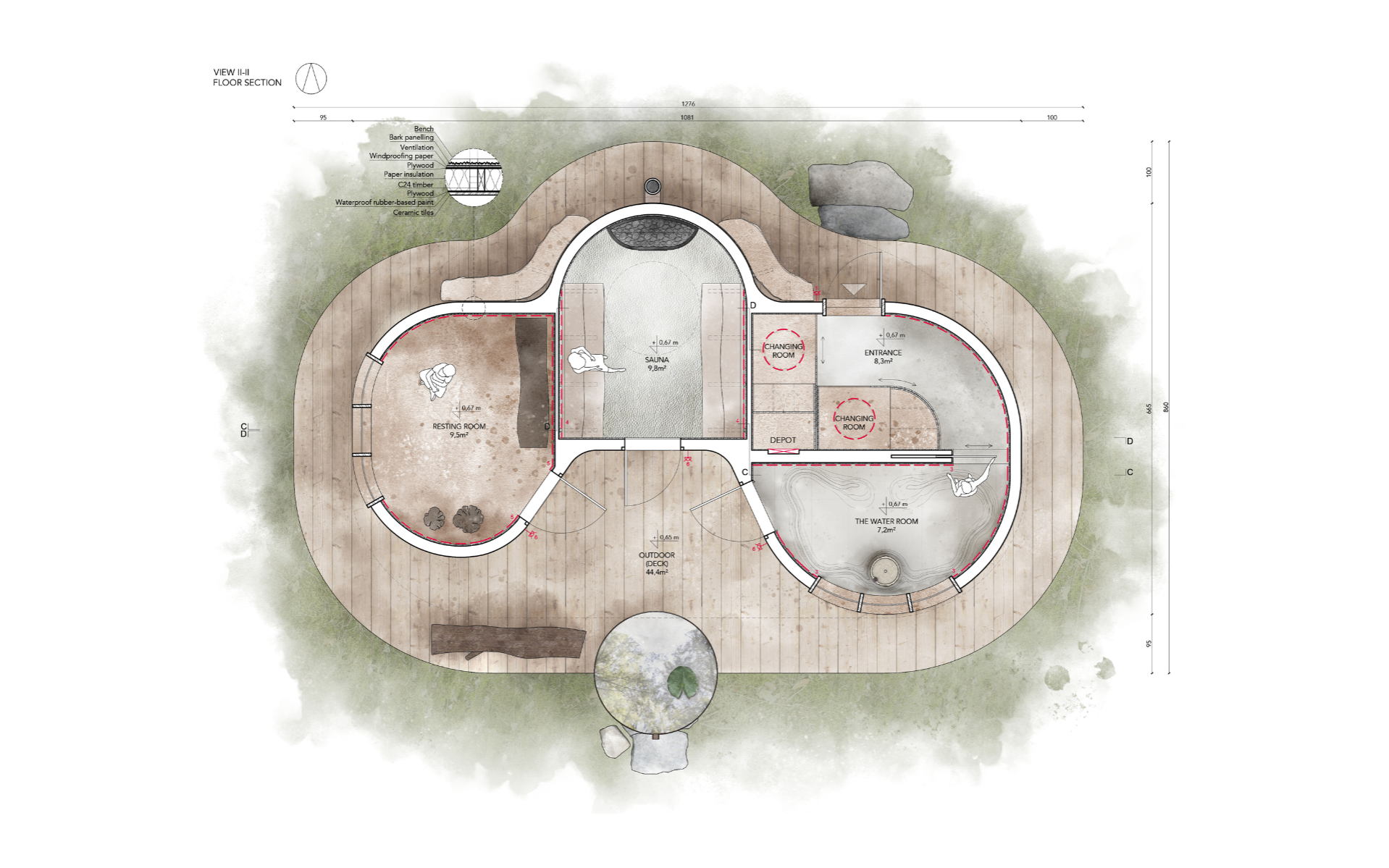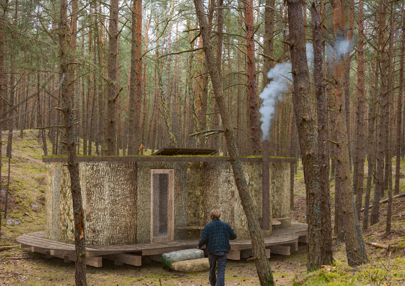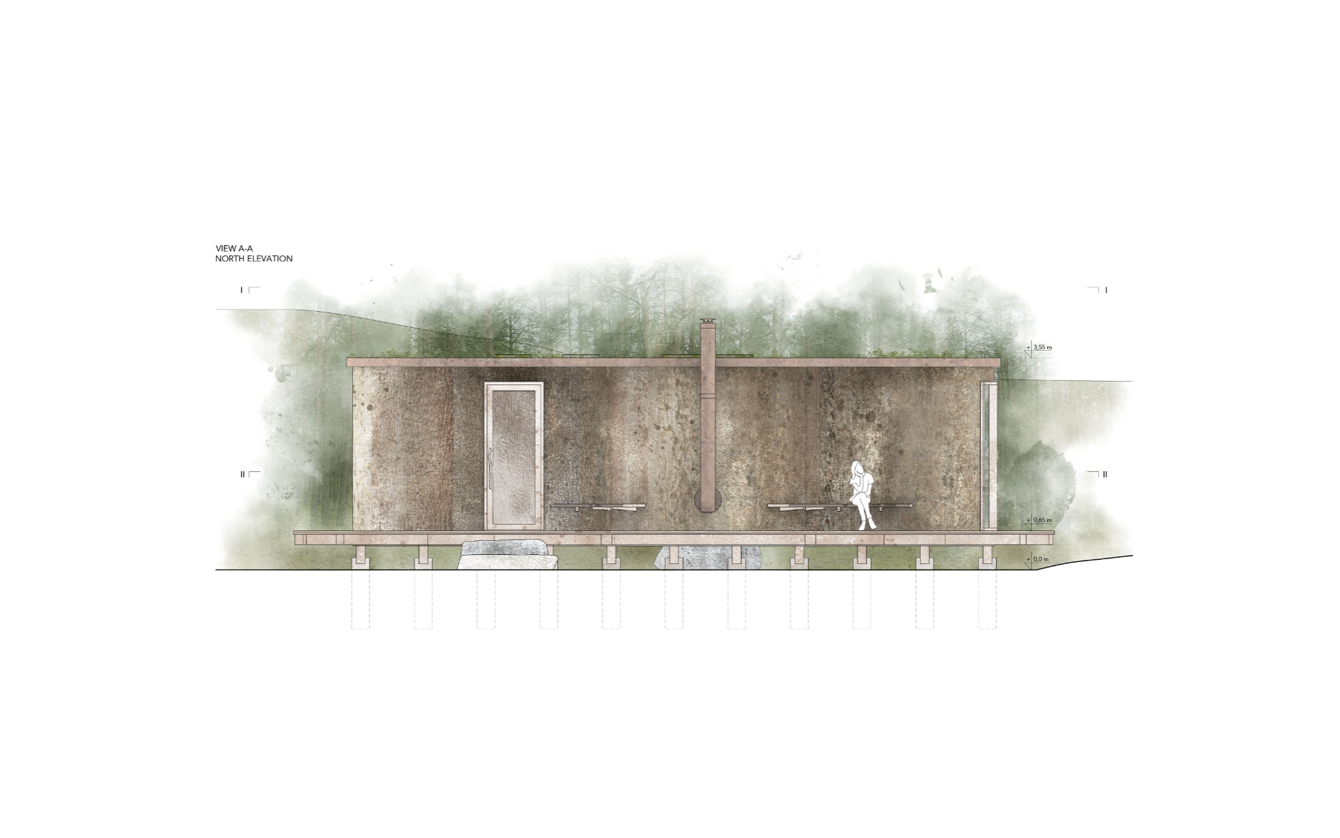 This project proposes an experimental forest refuge, a place to disconnect from the overstimulation of everyday life and reconnect with the body and senses. The architecture is designed around three core elements: heat, water, and nature, with each room offering a dedicated space for experiencing these in a mindful way. The building includes a wood- fired sauna, a water room for cleansing and cooling down, and a sensory room designed for rest, meditation, and tactile exploration.