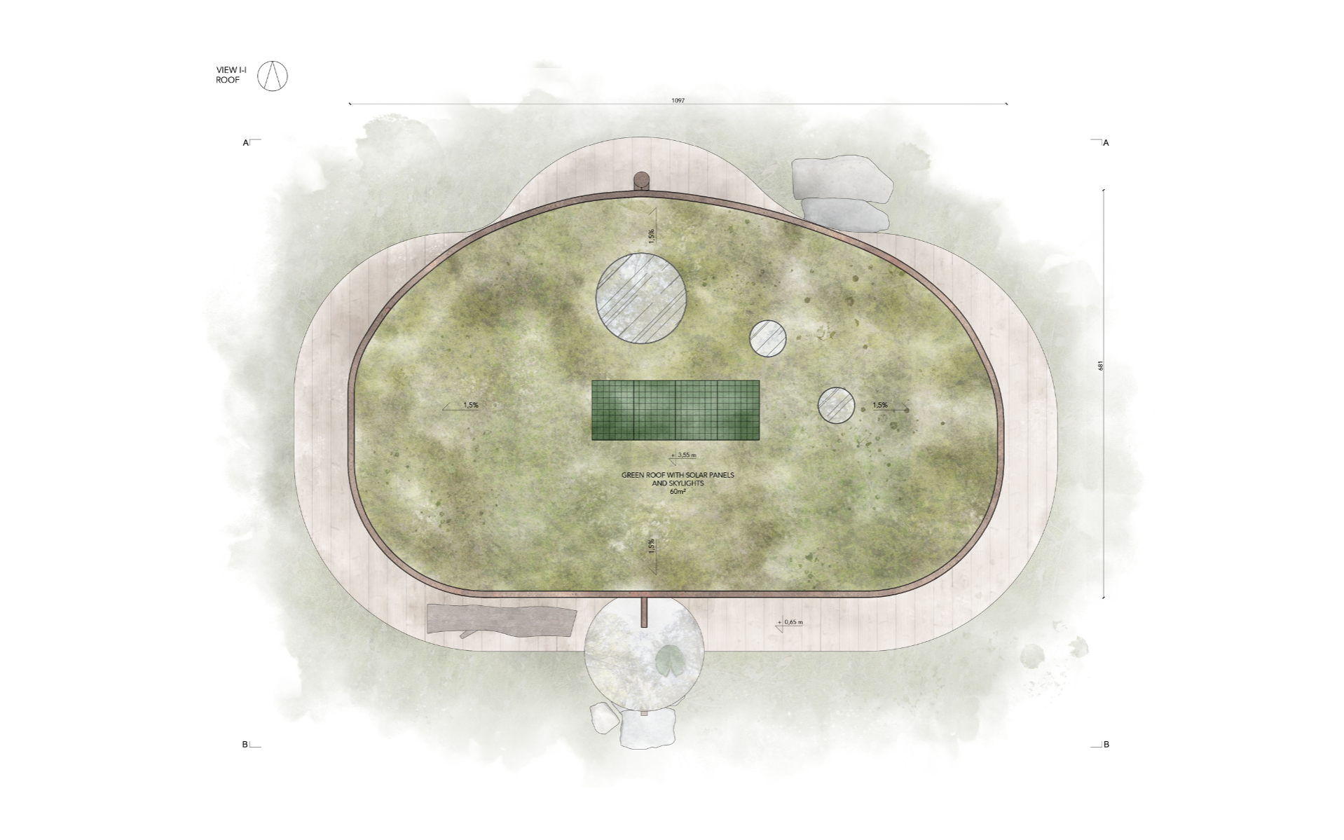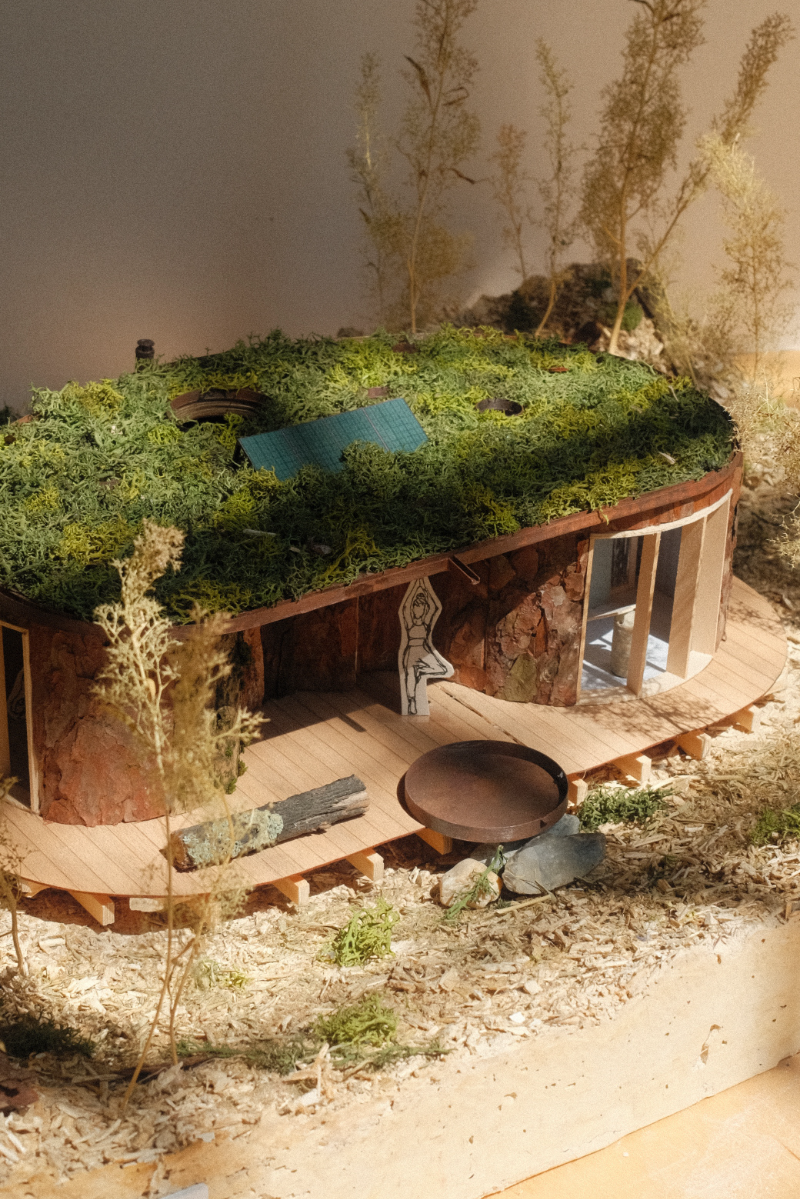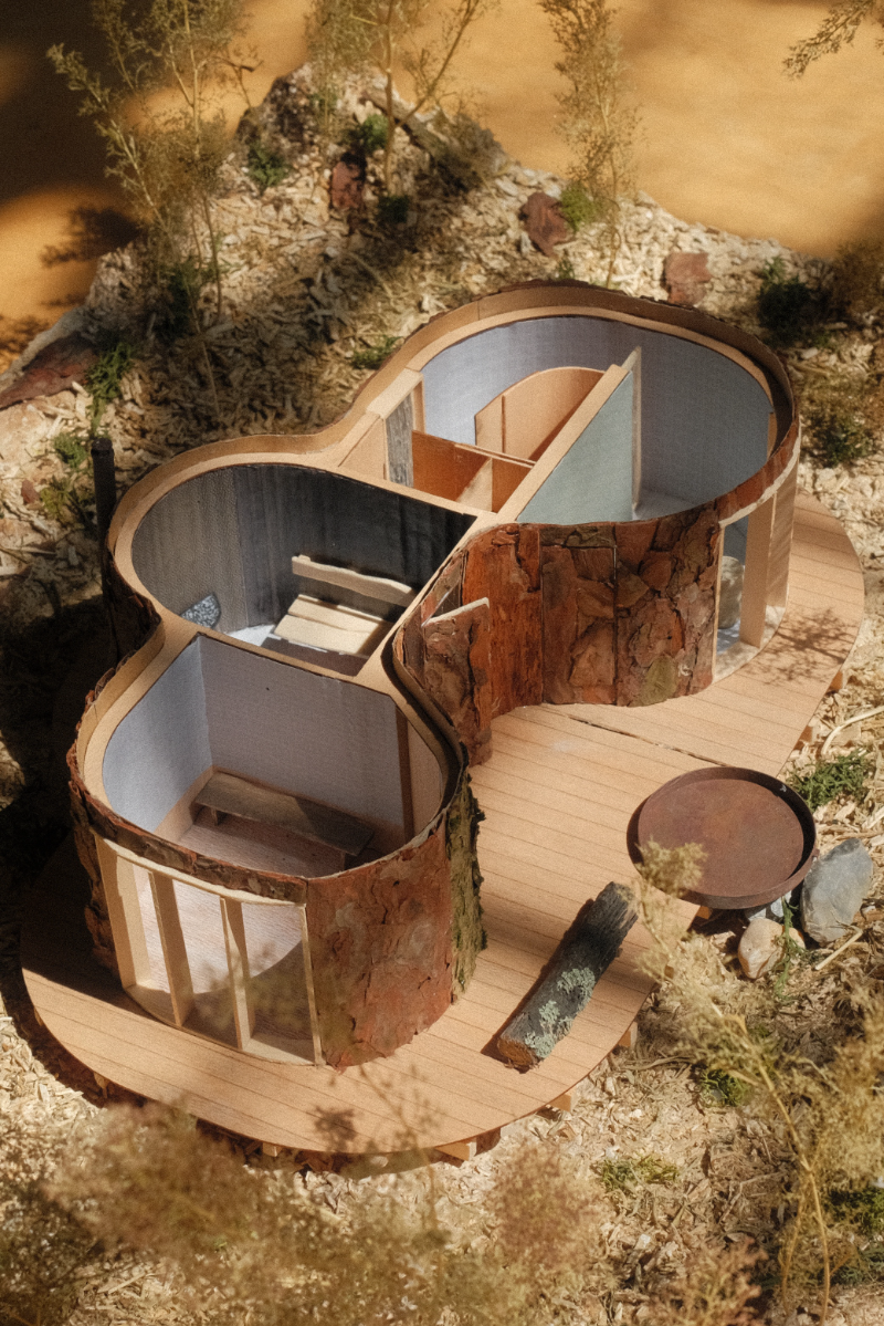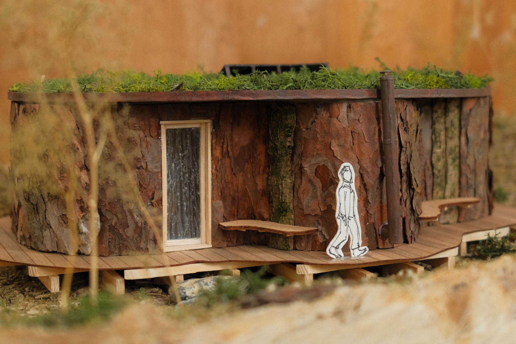This project proposes an experimental forest refuge, a place to disconnect from the overstimulation of everyday life and reconnect with the body and senses. The architecture is designed around three core elements: heat, water, and nature, with each room offering a dedicated space for experiencing these in a mindful way. The building includes a wood- fired sauna, a water room for cleansing and cooling down, and a sensory room designed for rest, meditation, and tactile exploration.