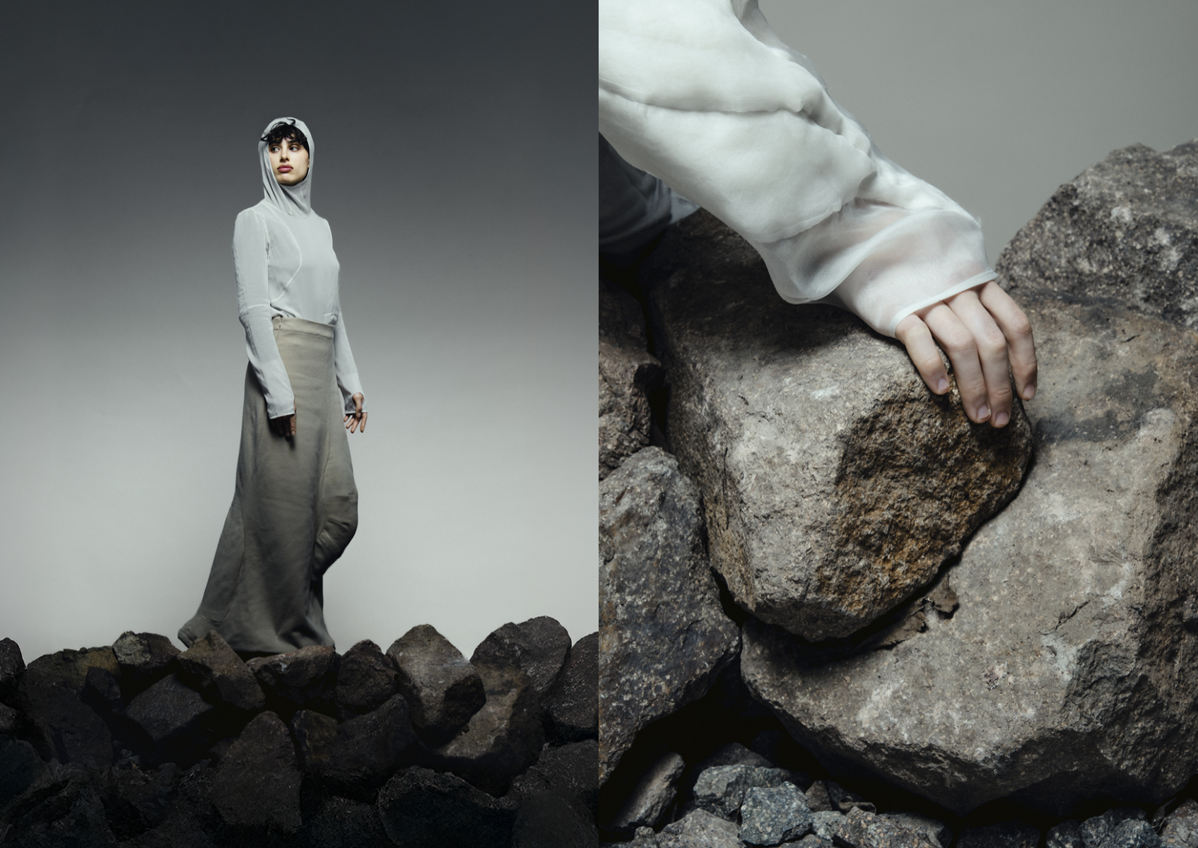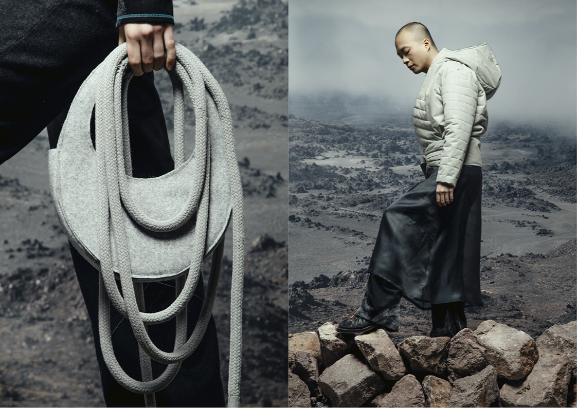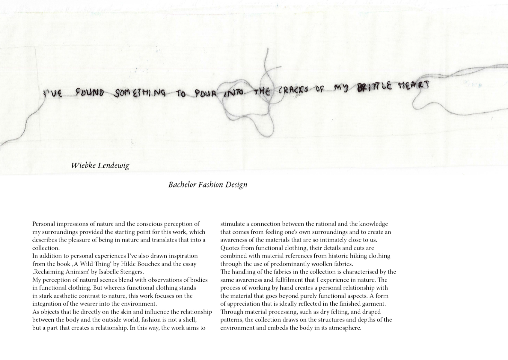 ‘I‘ve found something to pour into the cracks of my brittle heart’ is dedicated to the pleasure of feeling oneself in nature and translates these impressions into a fashion collection. As objects that lie directly on the skin and influence the relationship between body and outside world, the collection is intended to stimulate the connection between the rational and the knowledge that comes from feeling one‘s own surroundings. The aim is to connect with nature, the material and the process itself.