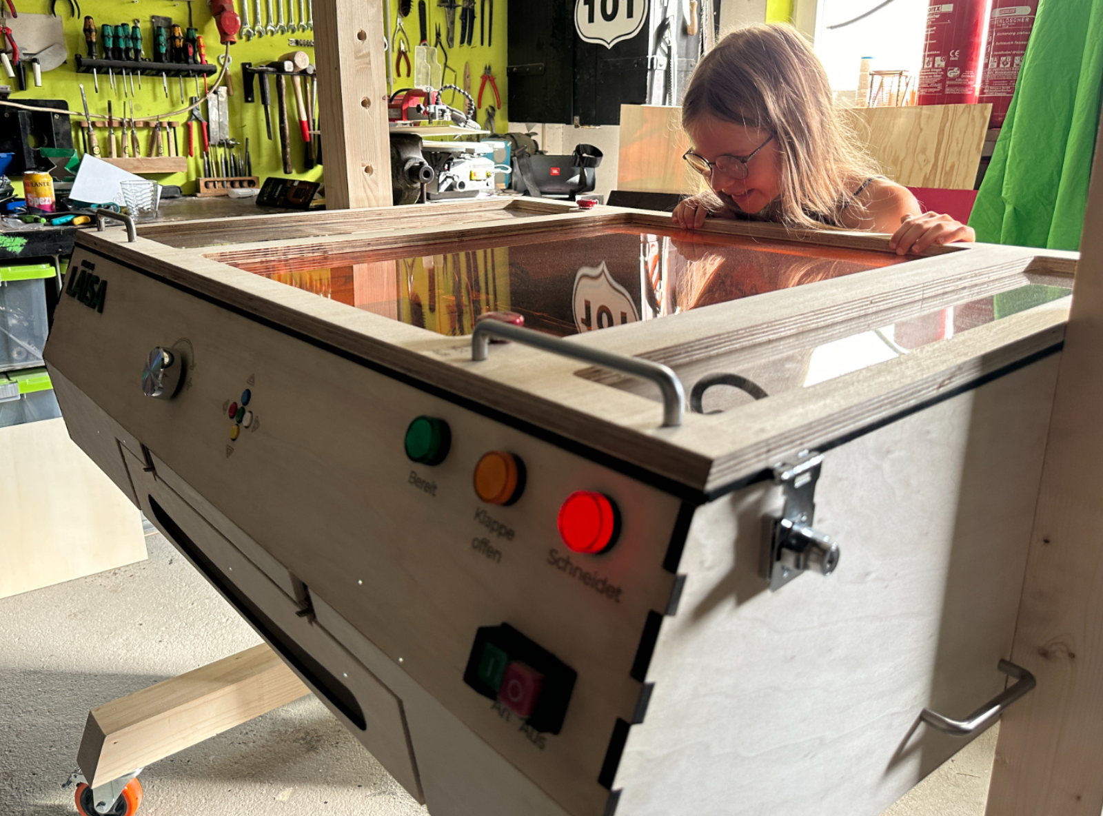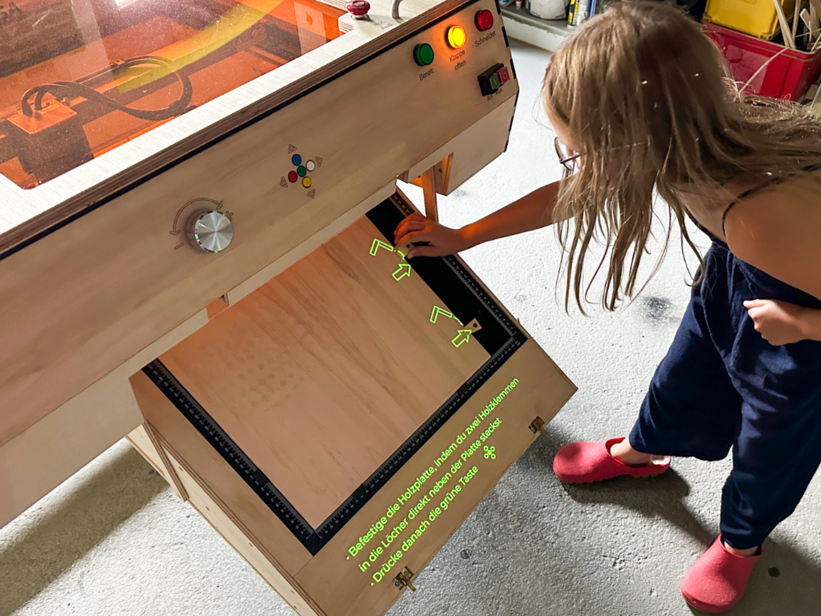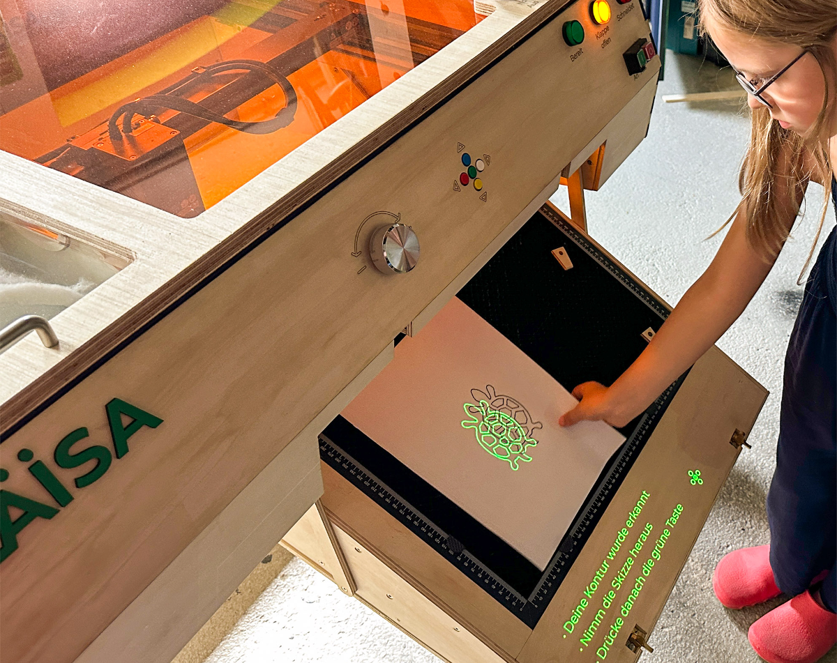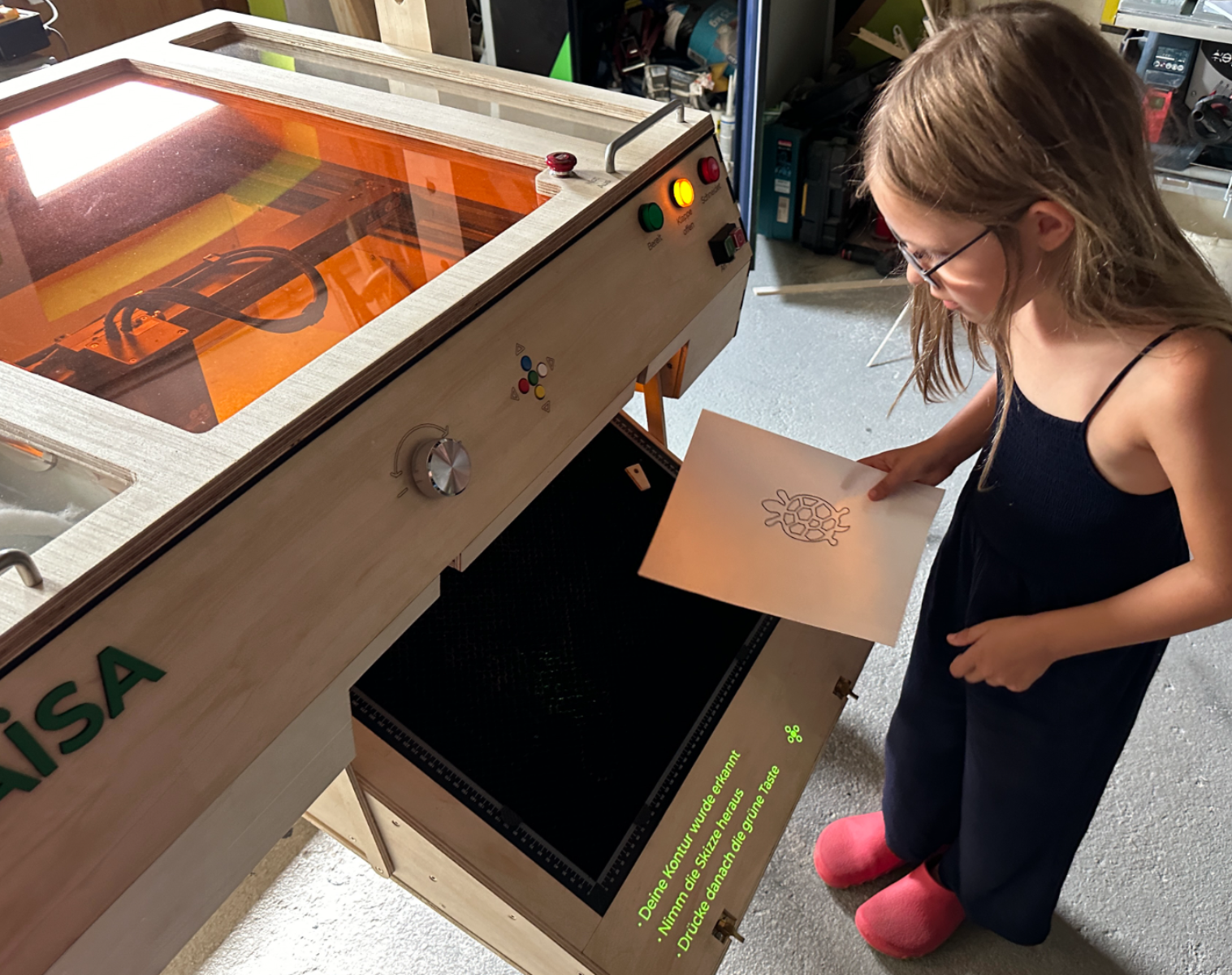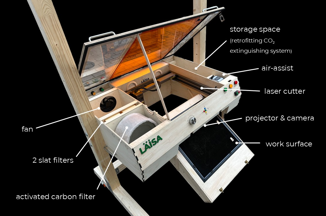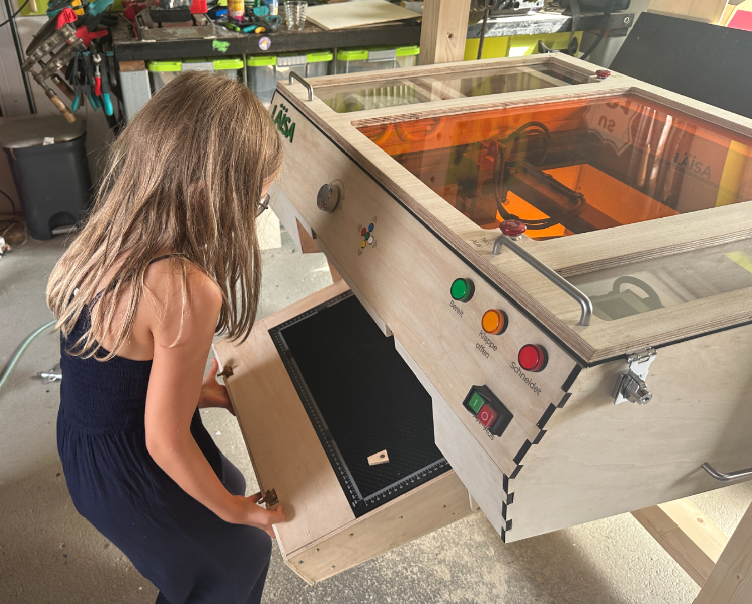 LÄISA is a mobile housing and interface for the safe, child-friendly use of laser cutters, developed for schools and children from the age of eight. Users place a hand-drawn sketch on the fold-out workspace, which is captured by a camera and projected back with guiding instructions. Wooden panels up to 12 mm can be processed without the need for professional software, making laser cutting accessible to a wide audience. The device features a lockable service hatch for tool-free filter replacement, a height-adjustable frame for different age groups or standing work, and is wheelchair-accessible and operable with one hand.