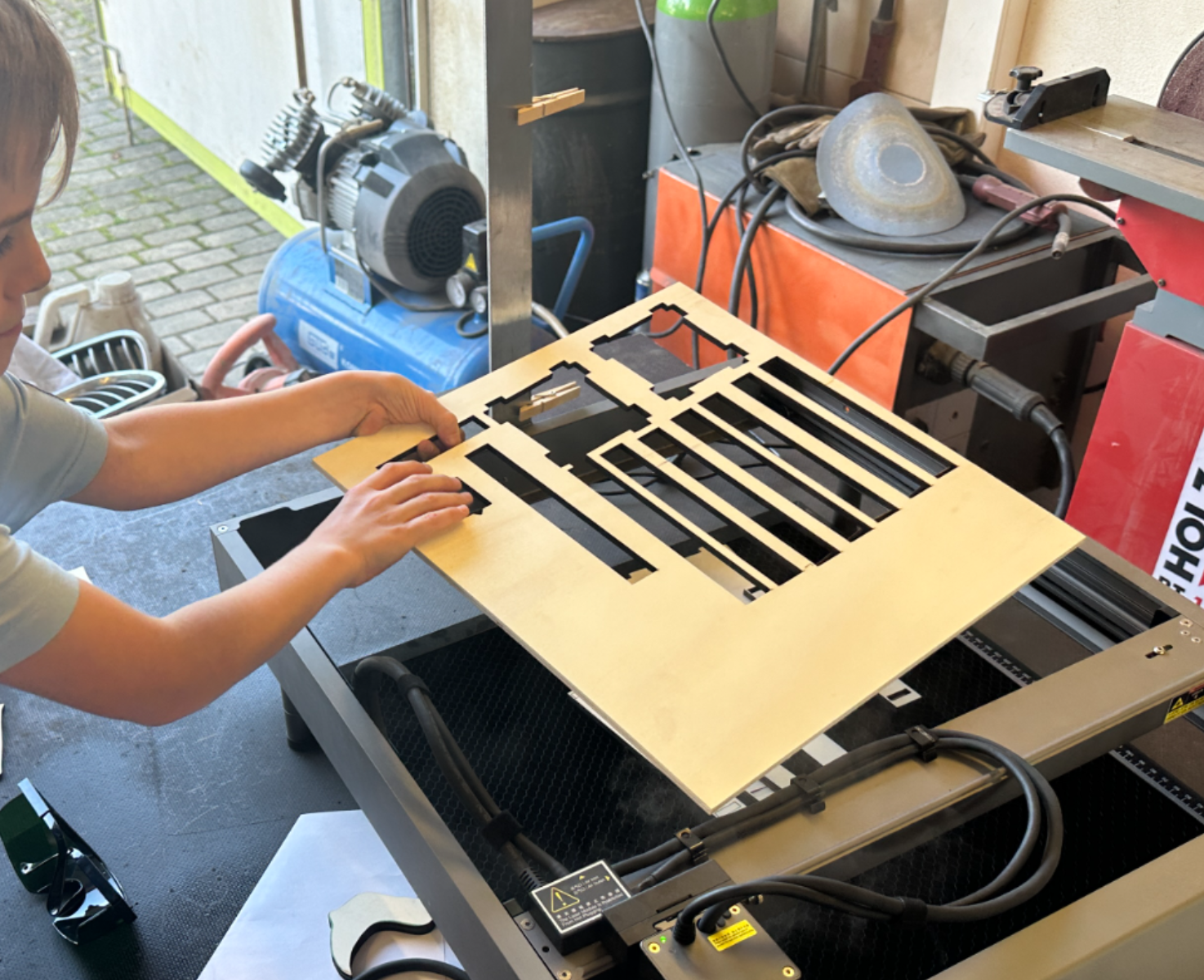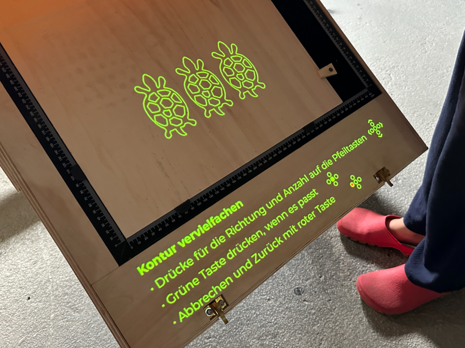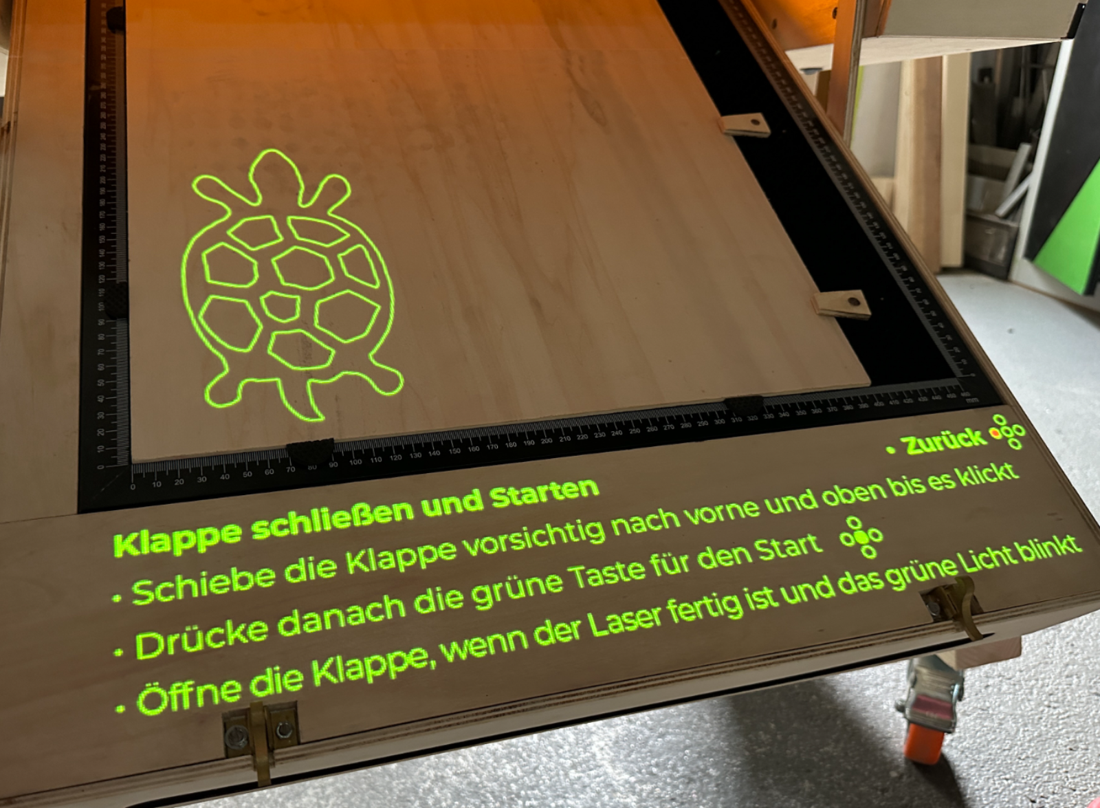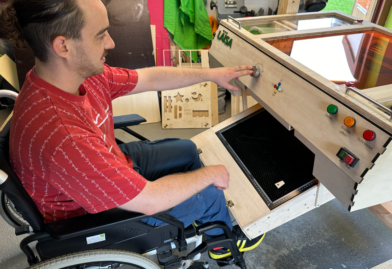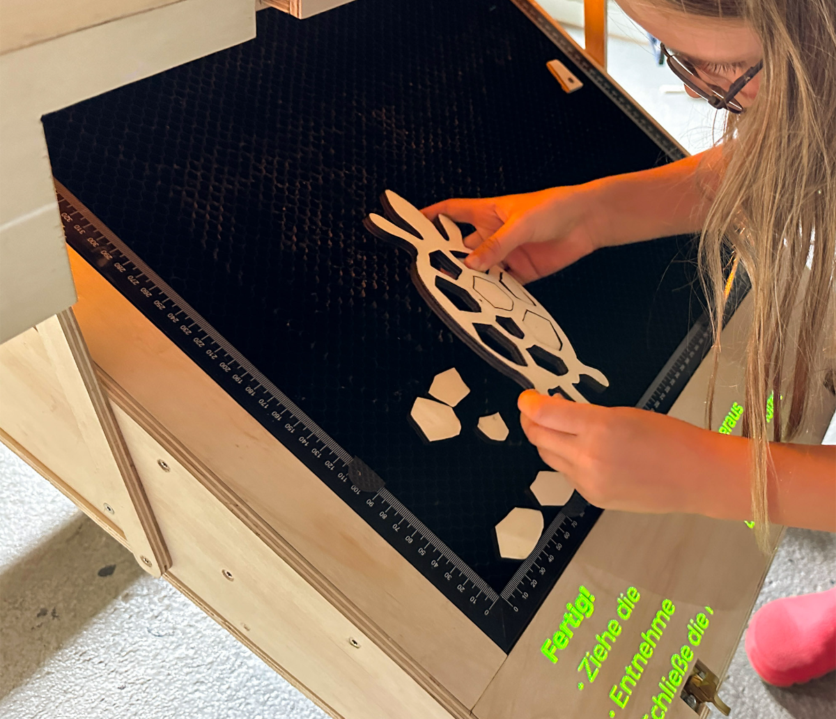 LÄISA is a mobile housing and interface for the safe, child-friendly use of laser cutters, developed for schools and children from the age of eight. Users place a hand-drawn sketch on the fold-out workspace, which is captured by a camera and projected back with guiding instructions. Wooden panels up to 12 mm can be processed without the need for professional software, making laser cutting accessible to a wide audience. The device features a lockable service hatch for tool-free filter replacement, a height-adjustable frame for different age groups or standing work, and is wheelchair-accessible and operable with one hand.