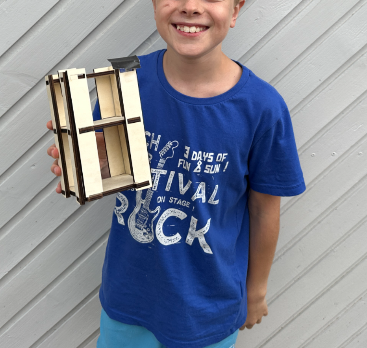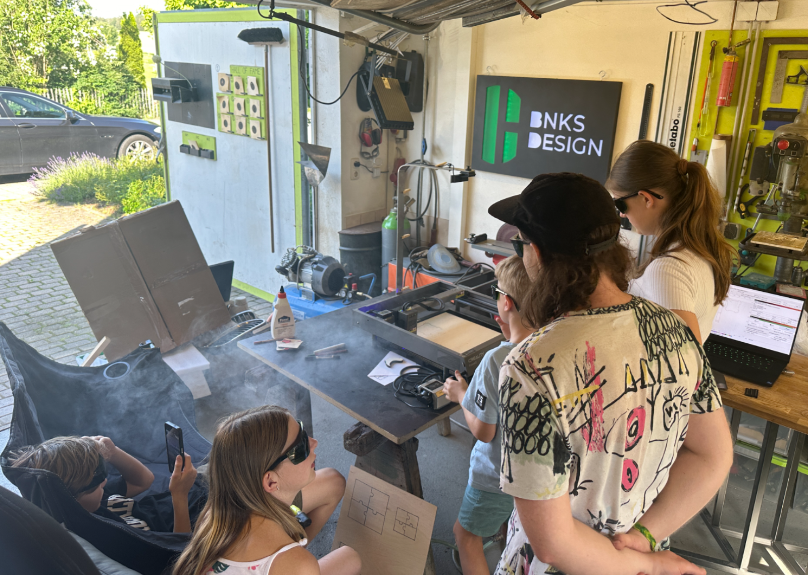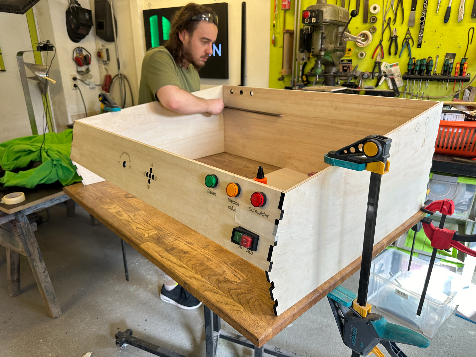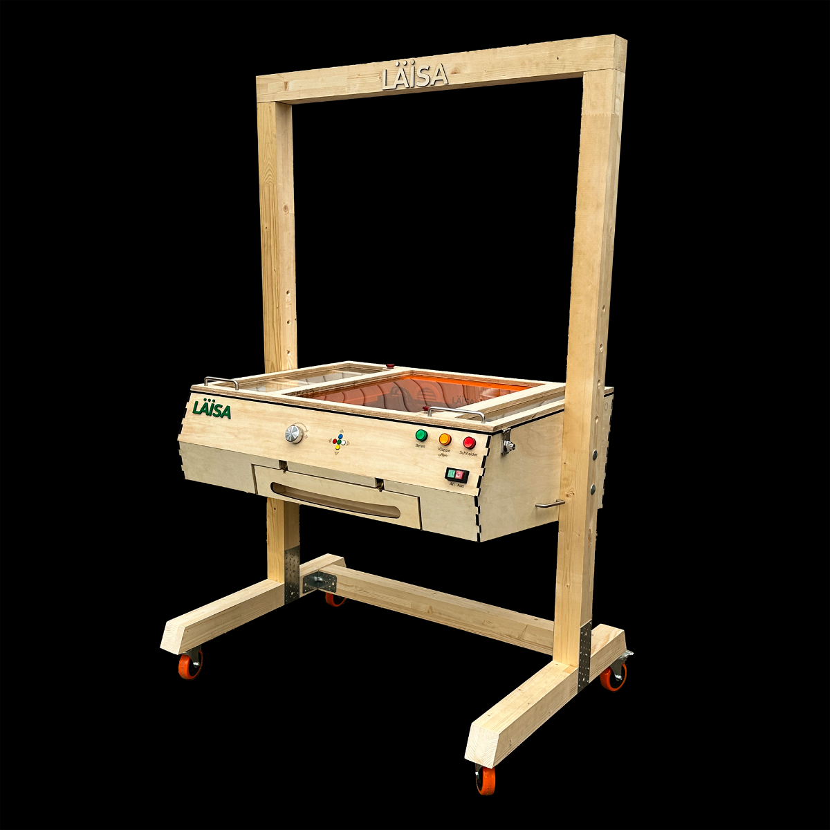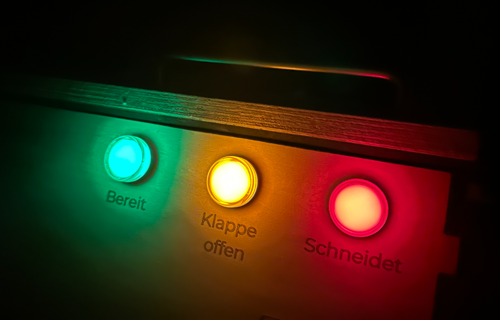 LÄISA is a mobile housing and interface for the safe, child-friendly use of laser cutters, developed for schools and children from the age of eight. Users place a hand-drawn sketch on the fold-out workspace, which is captured by a camera and projected back with guiding instructions. Wooden panels up to 12 mm can be processed without the need for professional software, making laser cutting accessible to a wide audience. The device features a lockable service hatch for tool-free filter replacement, a height-adjustable frame for different age groups or standing work, and is wheelchair-accessible and operable with one hand.