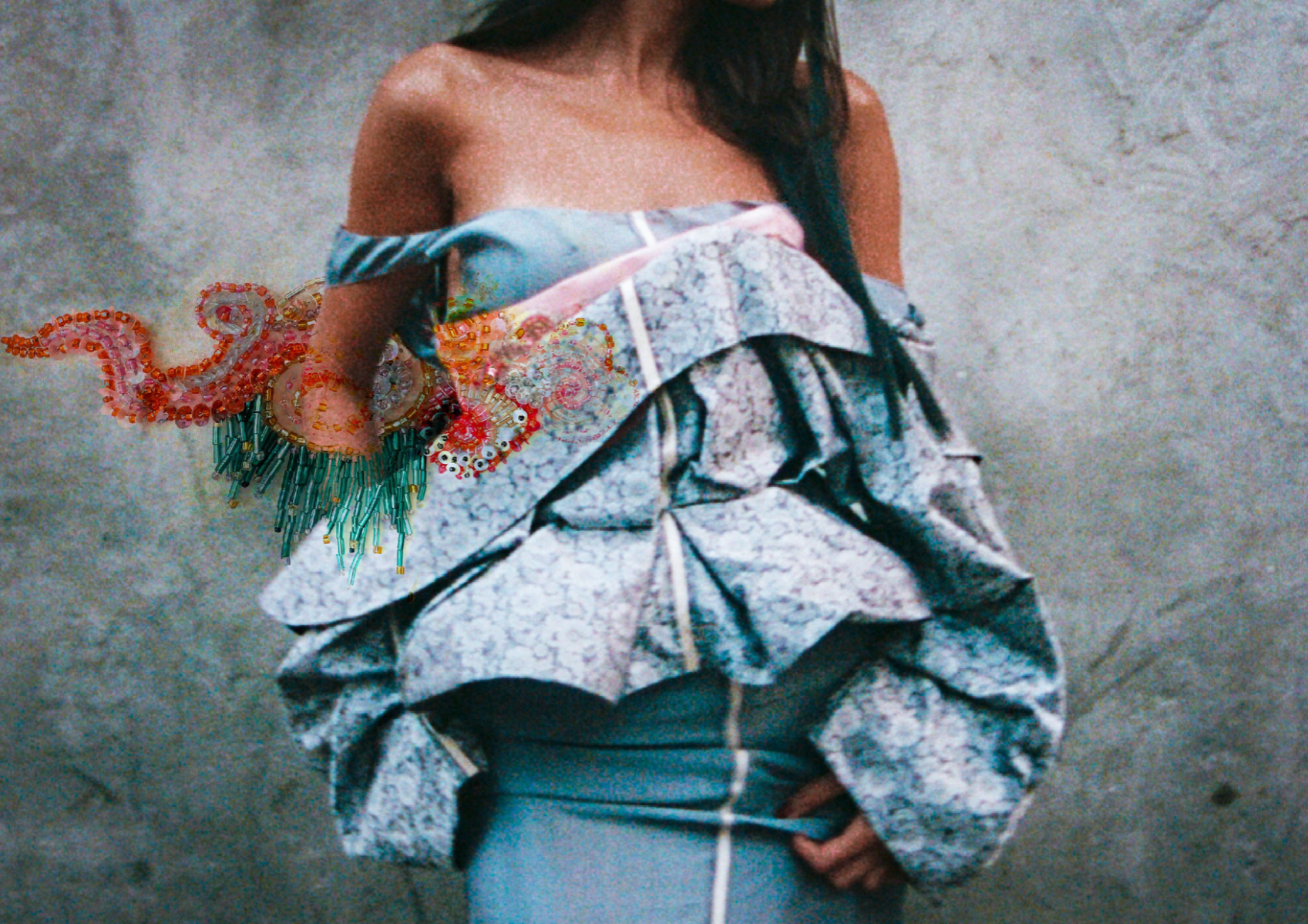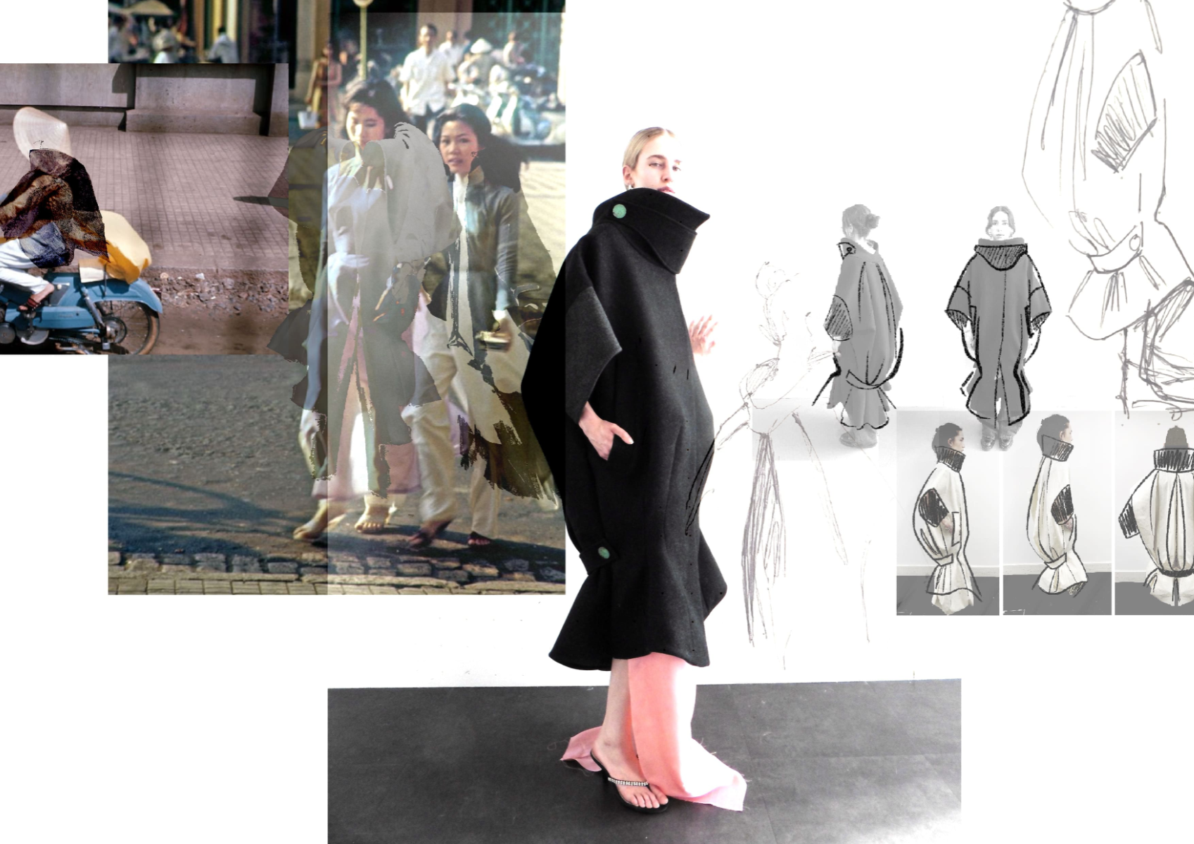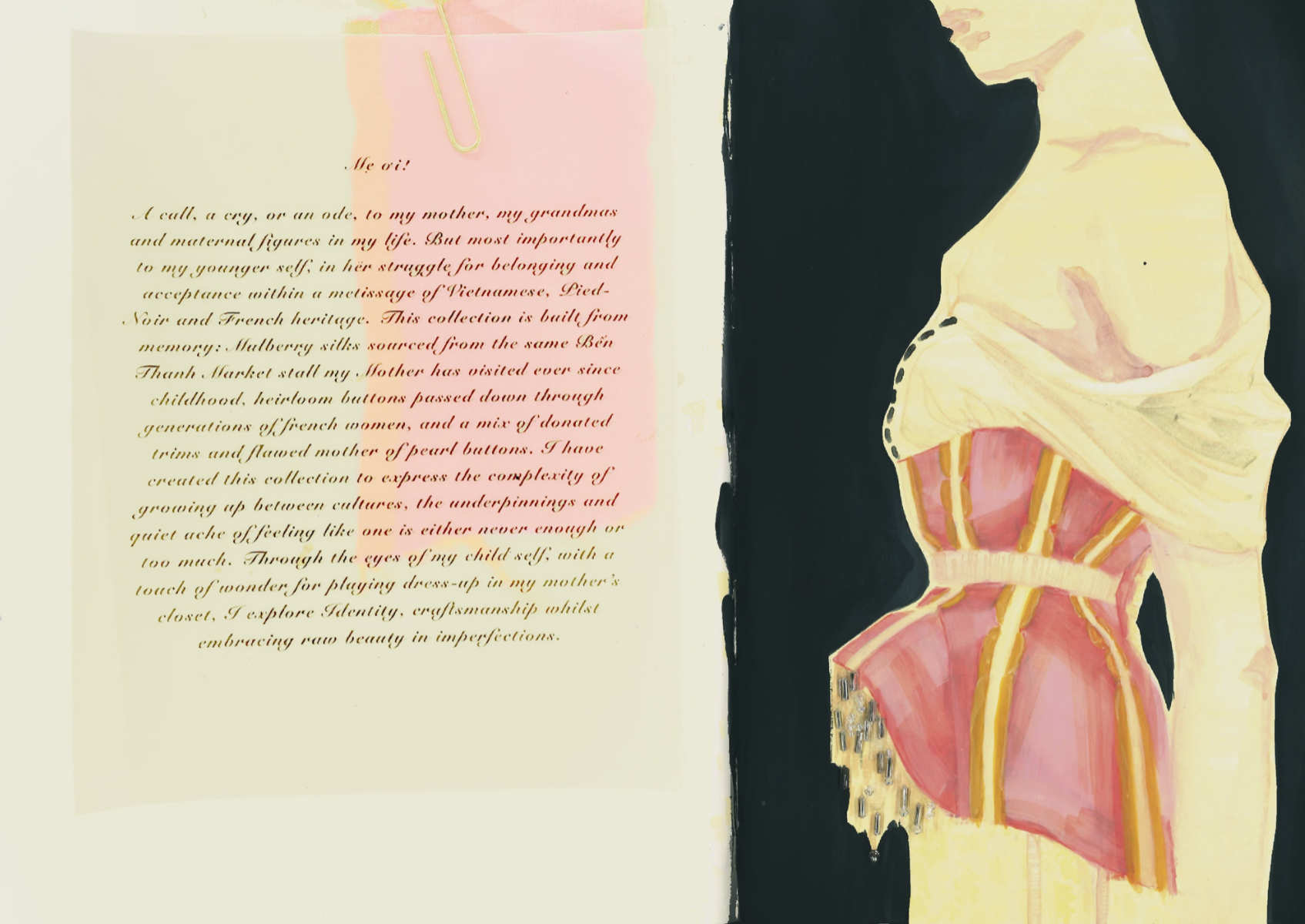 A call, a cry, or an ode, to my mother, my grandmas and maternal figures in my life. But most importantly to my younger self, in her struggle for belonging and acceptance within a metissage of Vietnamese, Pied-Noir and French heritage. This collection is built from memory: Mulberry silks sourced from the same Bến Thanh Market stall my Mother has visited ever since childhood, heirloom buttons passed down through generations of french women, and a mix of donated trims and flawed mother of pearl buttons. I have created this collection to express the complexity of growing up between cultures, the underpinnings and quiet ache of feeling like one is either never enough or too much. Through the eyes of my child self, with a touch of wonder for playing dress-up in my mother’s closet, I explore Identity, craftsmanship whilst embracing raw beauty in imperfections.