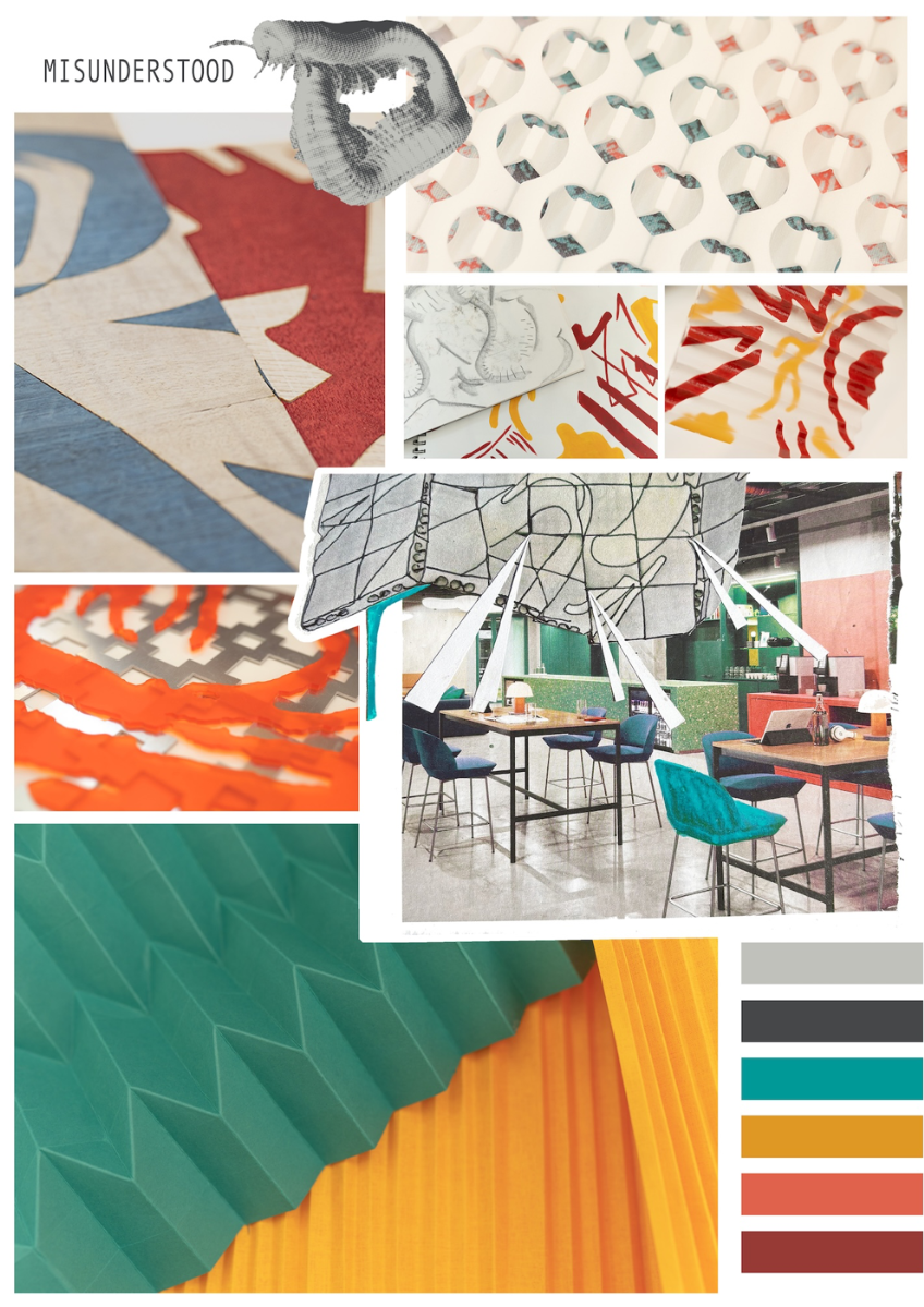 A project that’s aim is to create a greater awareness for the issues around child protection and safeguarding through the visual presentation of misunderstood creatures such as snakes, spiders and slugs; representing the children who fall victim of abuse that fly under the radar, due to lack of knowledge or sense of responsibility from the adults around them. Misunderstood animals are wrongly deemed to be scary or dangerous when this is often a learned behaviour. I have displayed this through a varied collection of surface samples for interior and exterior application. The intended space for these samples is a social hub, a space providing areas of co-working, social interaction and events, providing an alternative for establishments such as bars and cafés without the pressure to buy food or drinks to attend, alternatively gaining income with a membership or day pass. The nature of the location allows visitors to stay for long periods of time, making the location ideal for design with a talking point, allowing the project’s message to be spread. I have used a range of techniques to create a balanced material palette, including: 3D print, digital design, manipulation techniques and hard surface exploration. My design style is abstract and contemporary. To ensure my theme comes across I have used: tactility, layering and moving elements within the project. Creating samples that have to be interacted with to represent the idea that you may have to dig deeper to find what is really going on. Although my theme is of great importance, I wanted to ensure I was creating samples suitable for application, I have used a range of materials, varying in texture, softness and pattern to create a balance, allowing for a calm and comfy environment that also remains contemporary through its exciting use of pattern and colour.