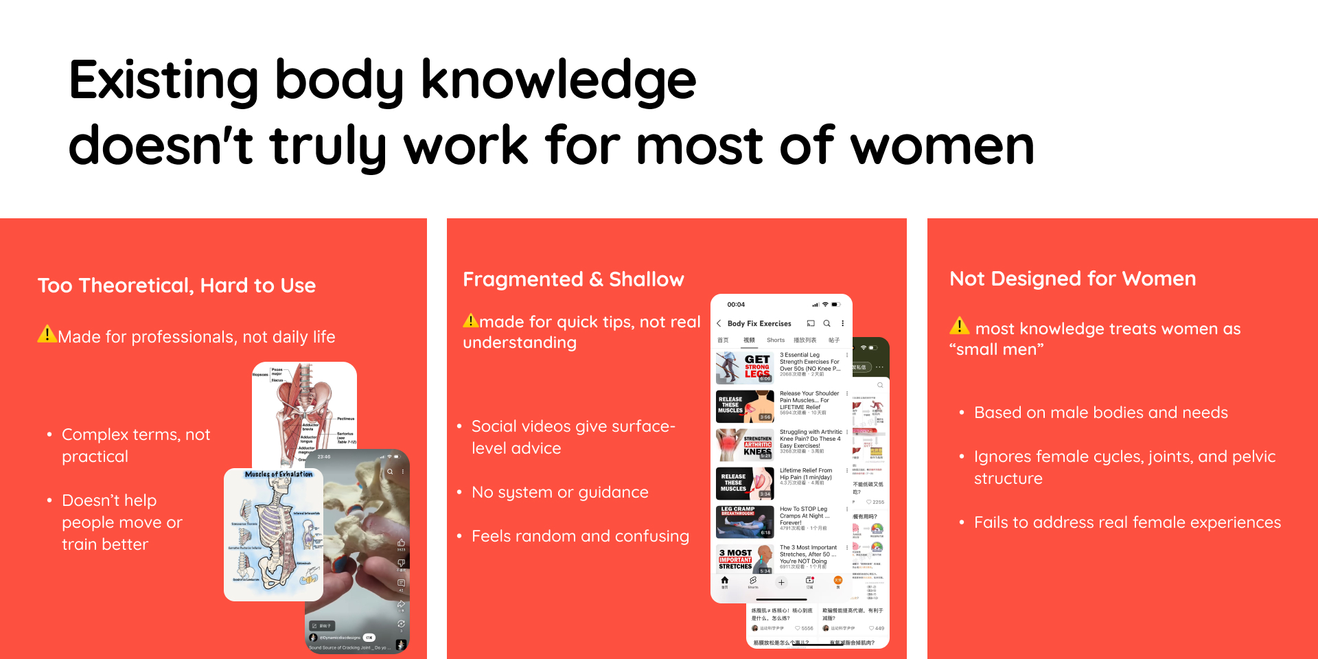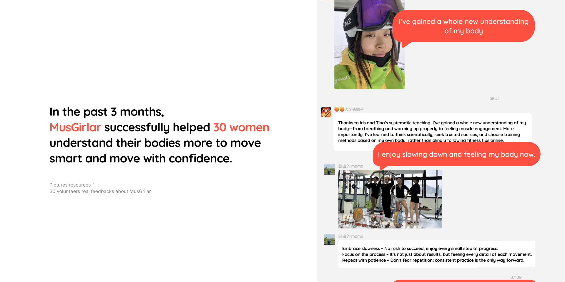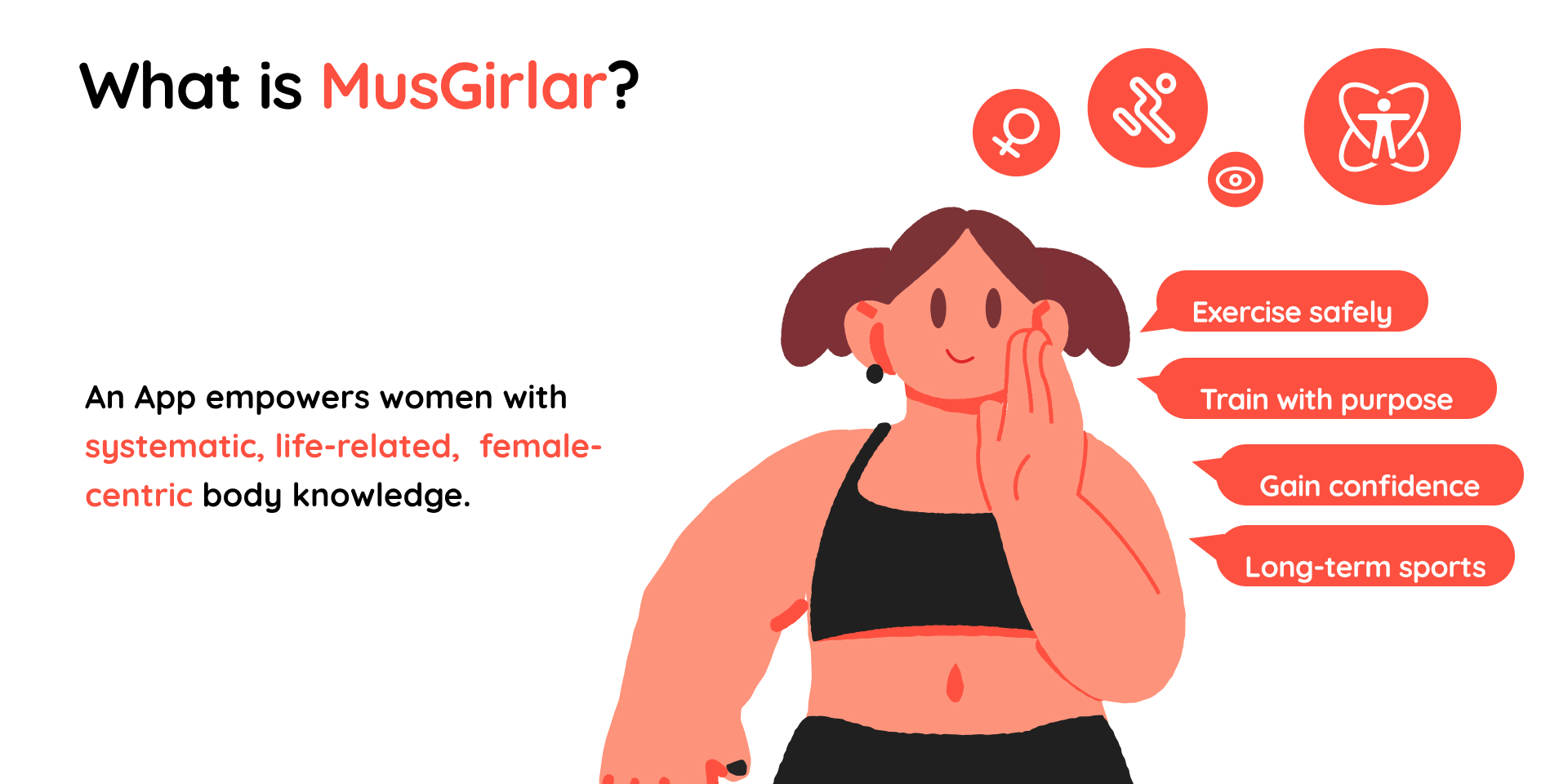 MusGirlar is a platform that helps women take back ownership of their bodies through science and awareness. Developed with a team of sports science experts, it filters and translates complex knowledge of hormones, muscles, and energy cycles into a female body-based, visualized, systematic, and reliable knowledge system. Instead of chasing body ideals, MusGirlar promotes body neutrality — redefining “feminine” as healthy, strong, and sporty. By empowering women to understand their physiology and engage in functional, fearless movement, MusGirlar envisions a future where women train with knowledge, confidence, and freedom.