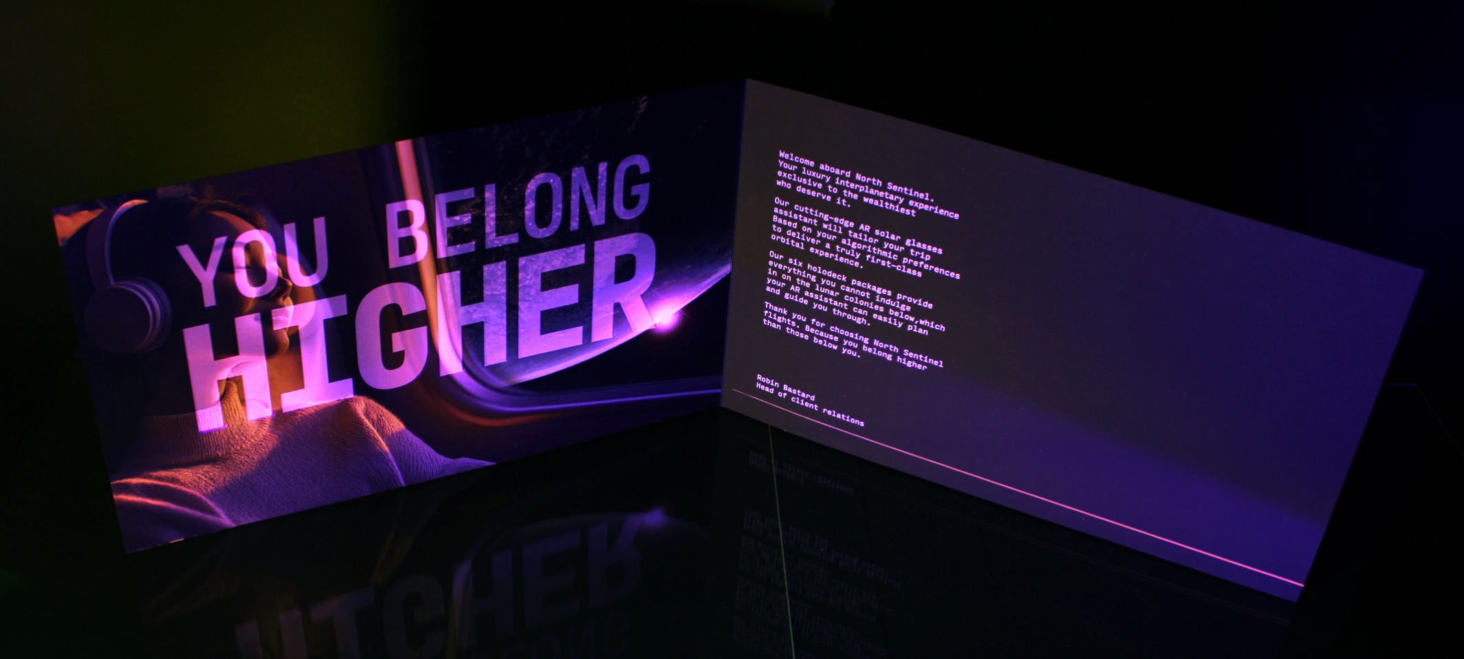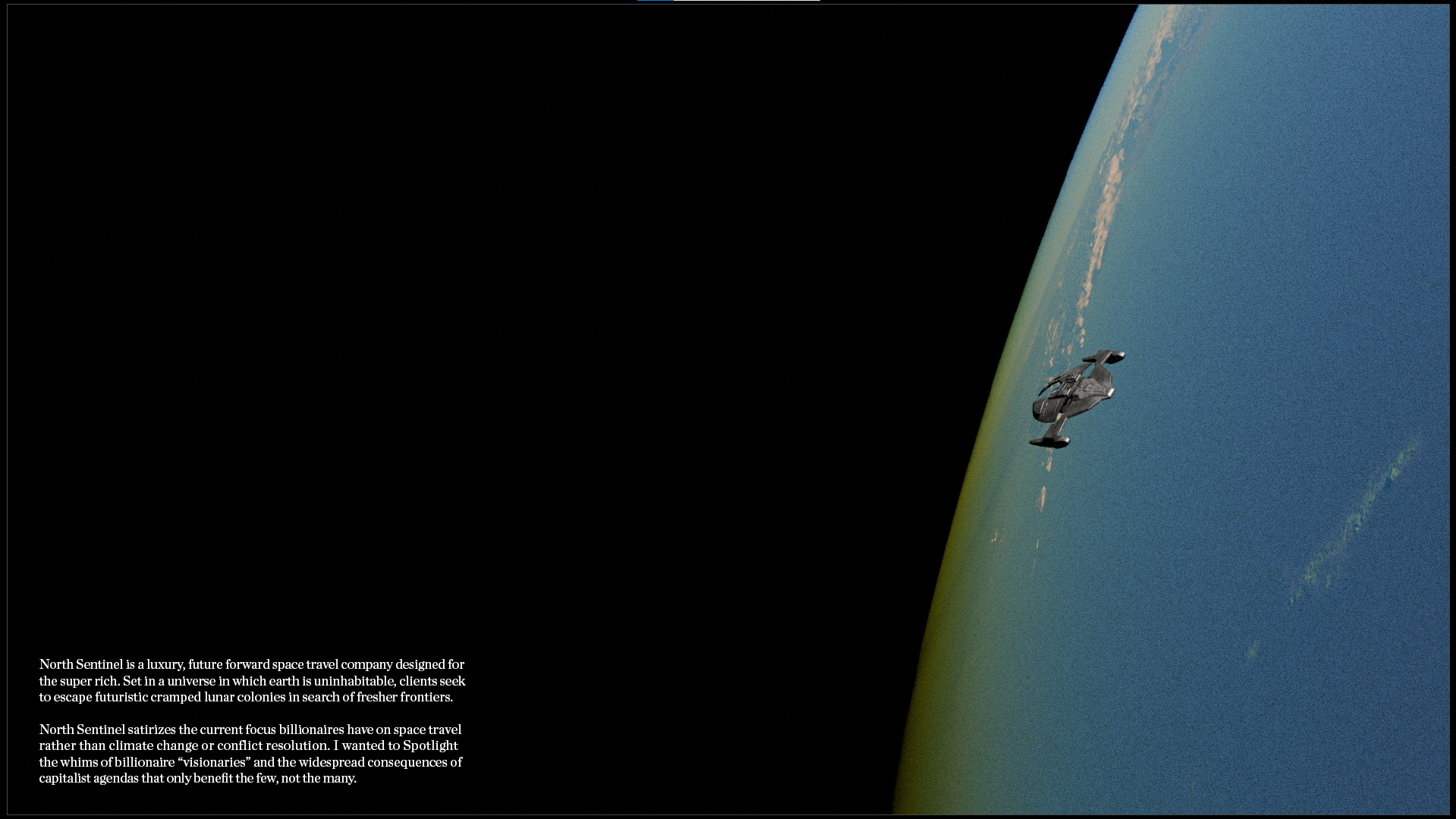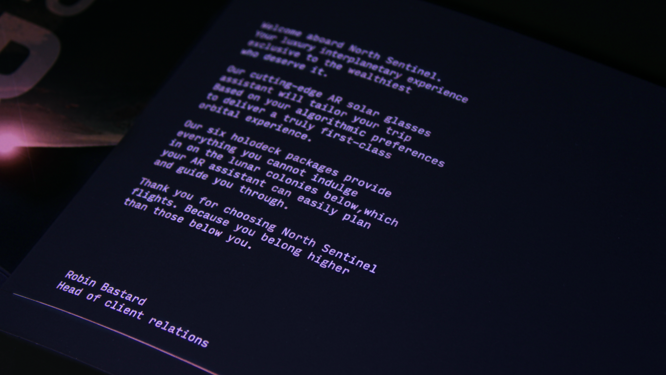 North Sentinel is a luxury, future-forward space travel company for the super-rich. Set 200 years after Earth became uninhabitable, clients seek to escape cramped lunar colonies in search of fresher frontiers. The brand identity intends to satirise the current super-rich’s focus on space travel rather than climate change, poverty or conflict resolution. North Sentinel is a possible future (and consequence) of a capitalist agenda that deliberately benefits the few, not the many. Spotlighting the whims of billionaire “visionaries” and their shameless profiteering into selfish indulgences.