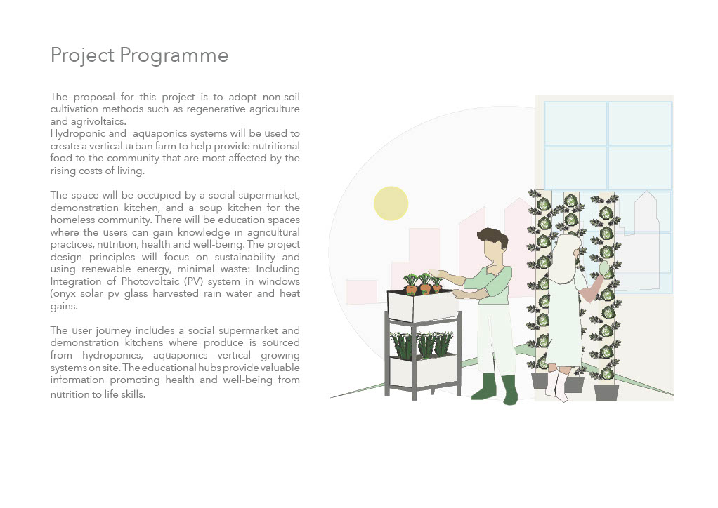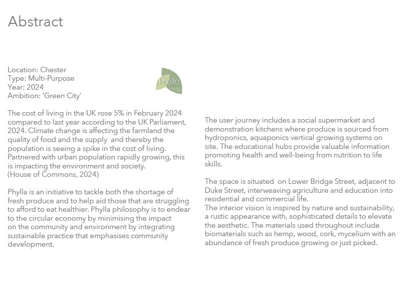 The cost of living in the UK rose 5% in February 2024 compared to last year according to the UK Parliament, 2024. Climate change is affecting the farmland, the quality of food and the supply and thereby the population is seeing a spike in the cost of living. Partnered with urban population rapidly growing, this is impacting the environment and society. Phylla is an initiative to tackle both the shortage of fresh produce and to help aid those that are struggling to afford to eat healthier. Phylla philosophy is to adhere to the circular economy by minimising the impact on the community and environment by integrating sustainable practice with emphasis on community development. To focus on generating renewable energy through PV solar panel, protecting and conserving water and optimising operational and maintenance practices.