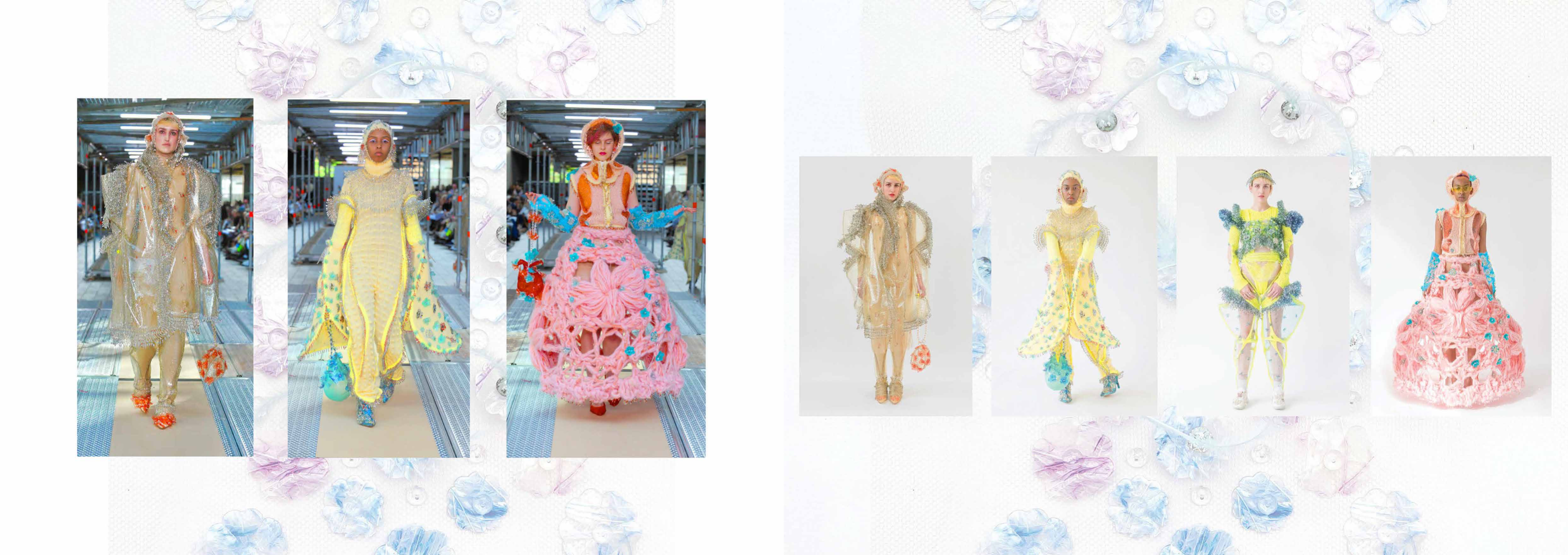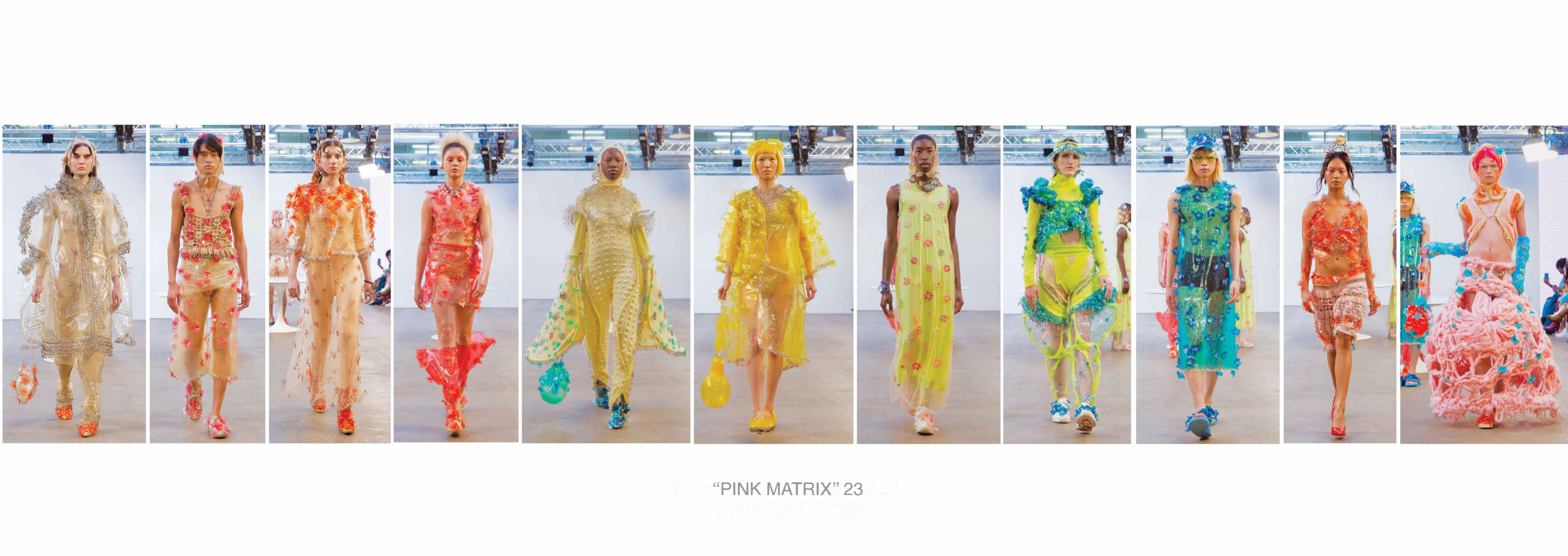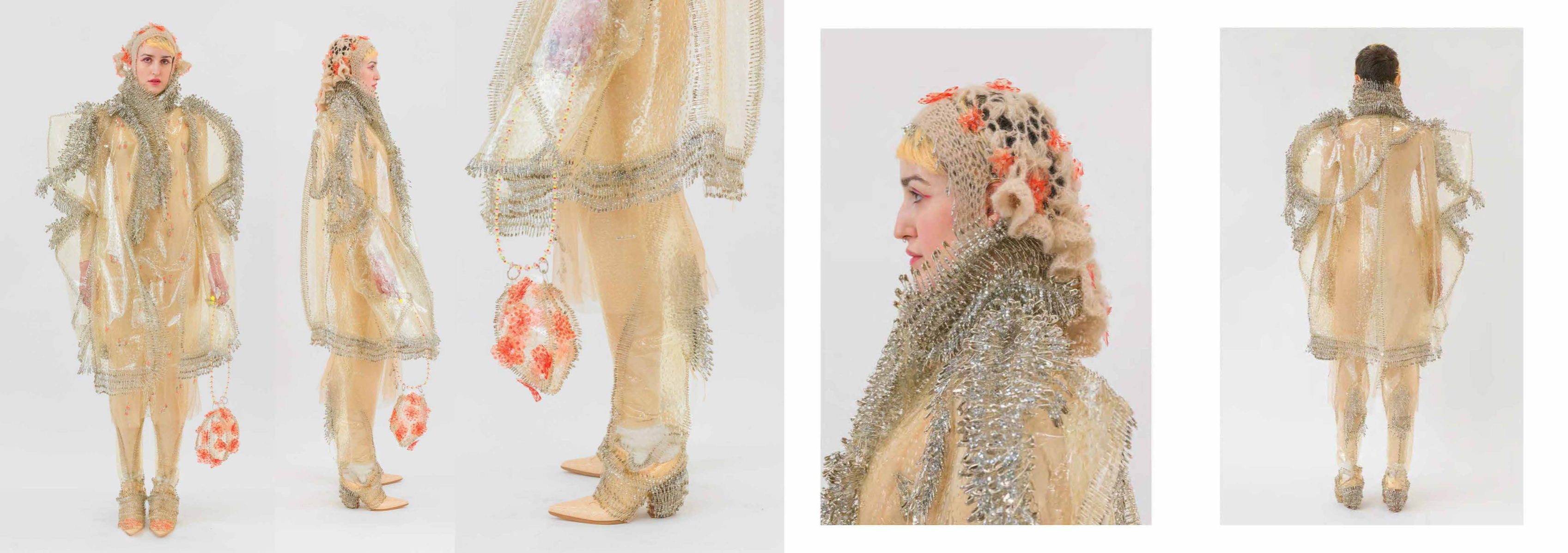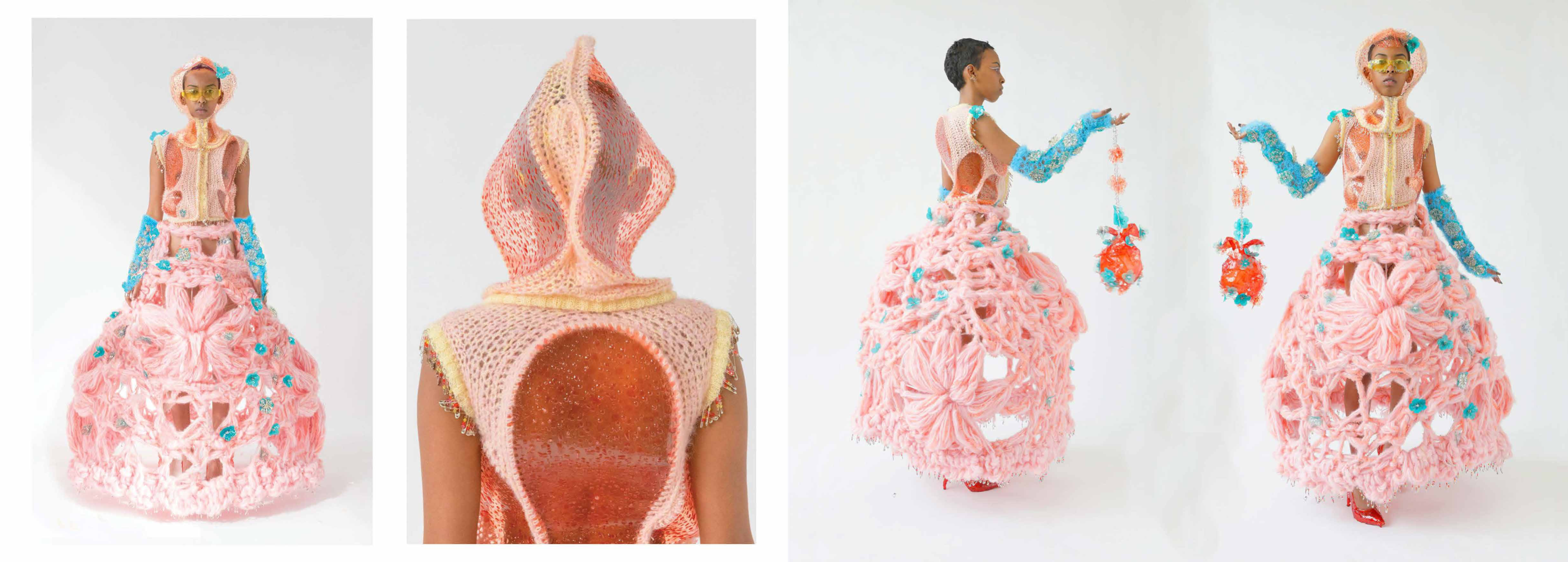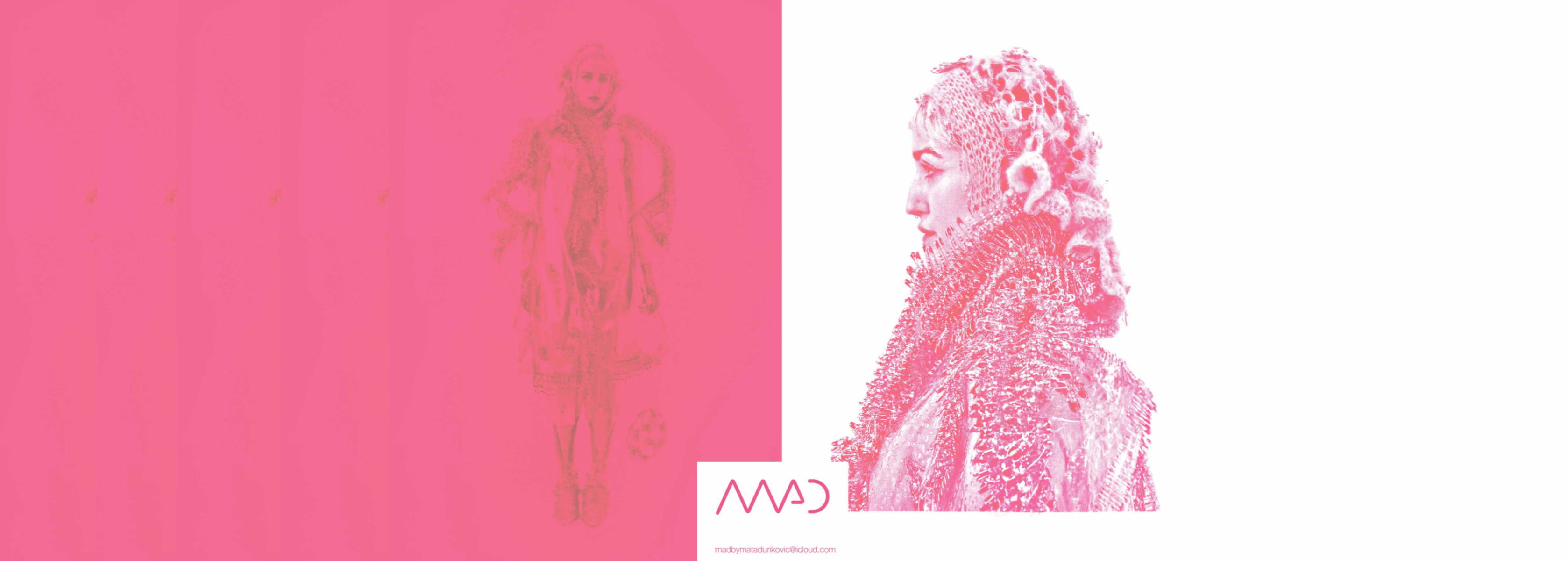 PINK MATRIX collection having motto: “Be MAD, be Bioluxury!” wants to counter the value of haute couture luxury fashion, by using “Bioplastic crystal leather”, the biomaterial, invented by the designer Mata Durikovic, used in different forms such as substitute for solid fabrics, embroidery, crochet yarns and in use with UV print. Her main inspiration comes from her grandmother's sustainable practices and their relationship. ''Cook it! Wear it! Eat it! Vitalise plants with it! ''