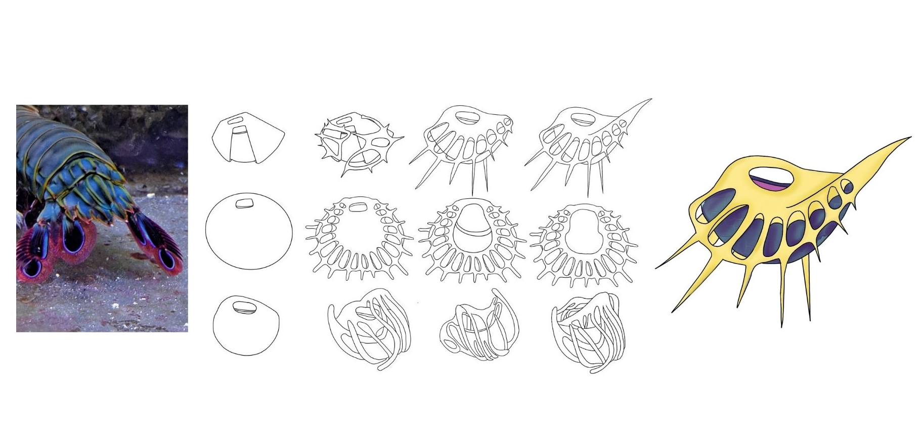 This collection visually represents a planetary life cycle of exploration, evolution, and adaptation. It begins with elemental stabilization of the environment. Followed by emergence of flora, transforming the atmosphere and enabling adaption of complex life. I was inspired by deep sea creatures and organisms for this piece. I used Rhino3D to model the first bag cage for this section.