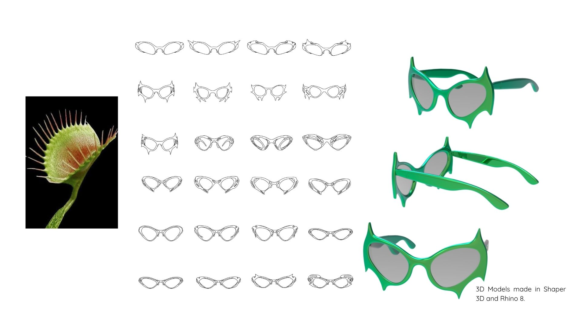 This collection visually represents a planetary life cycle of exploration, evolution, and adaptation. It begins with elemental stabilization of the environment. Followed by emergence of flora, transforming the atmosphere and enabling adaption of complex life. I used Rhino3D to model these glasses inspired by carnivorous plants.