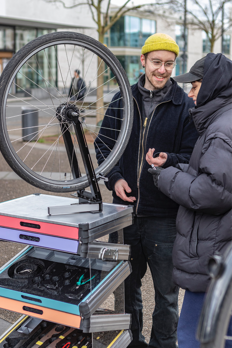 pop up FIXation is a mobile, self-help bike workshop that brings tools and repair materials into public spaces via cargo bike. Born from Offenbach’s radraum, it fosters learning, exchange, and community. With a modular design, it promotes sustainable mobility, social engagement, and urban participation.