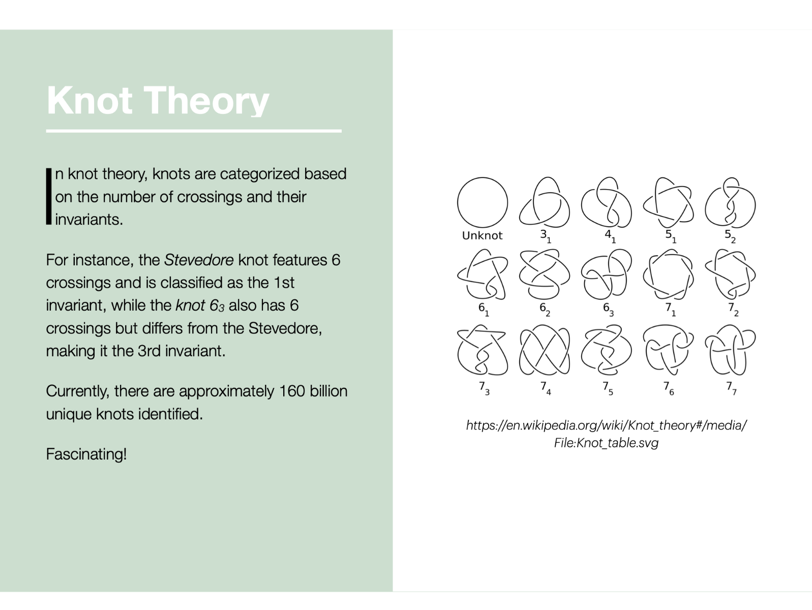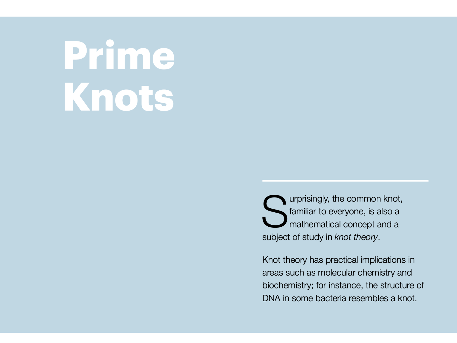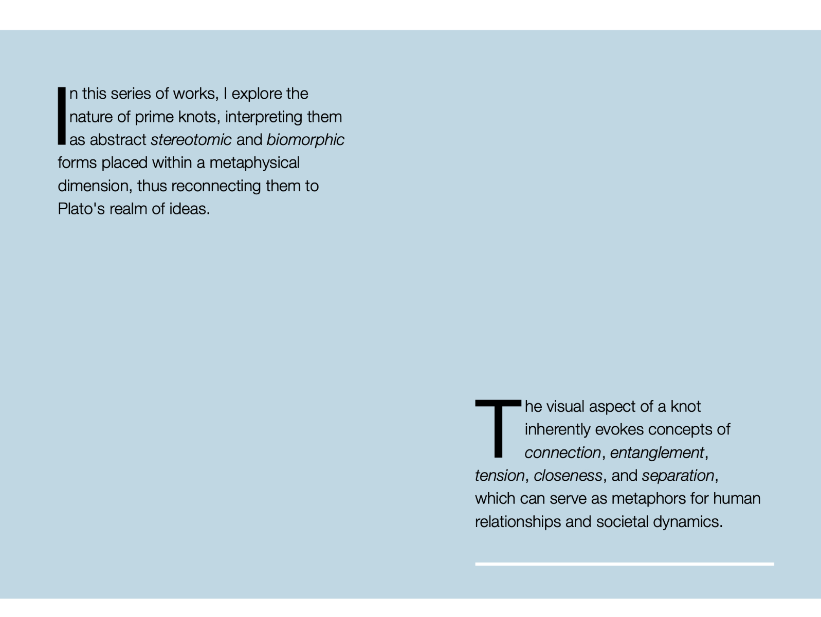 Surprisingly, the common knot, familiar to everyone, is also a mathematical concept and a subject of study in knot theory. Knot theory has practical implications in areas such as molecular chemistry and biochemistry; for instance, the structure of DNA in some bacteria resembles a knot. In this series of works, I explore the nature of prime knots, interpreting them as abstract stereotomic and biomorphic forms placed within a metaphysical dimension, thus reconnecting them to Plato's realm of ideas. The visual aspect of a knot inherently evokes concepts of connection, entanglement, tension, closeness, and separation, which can serve as metaphors for human relationships and societal dynamics.