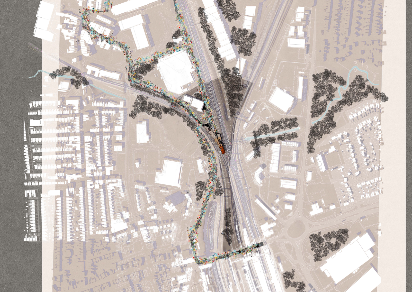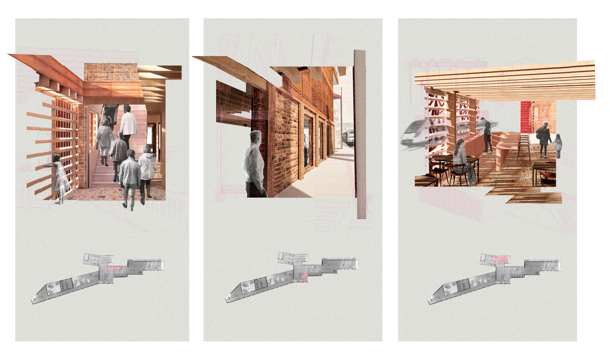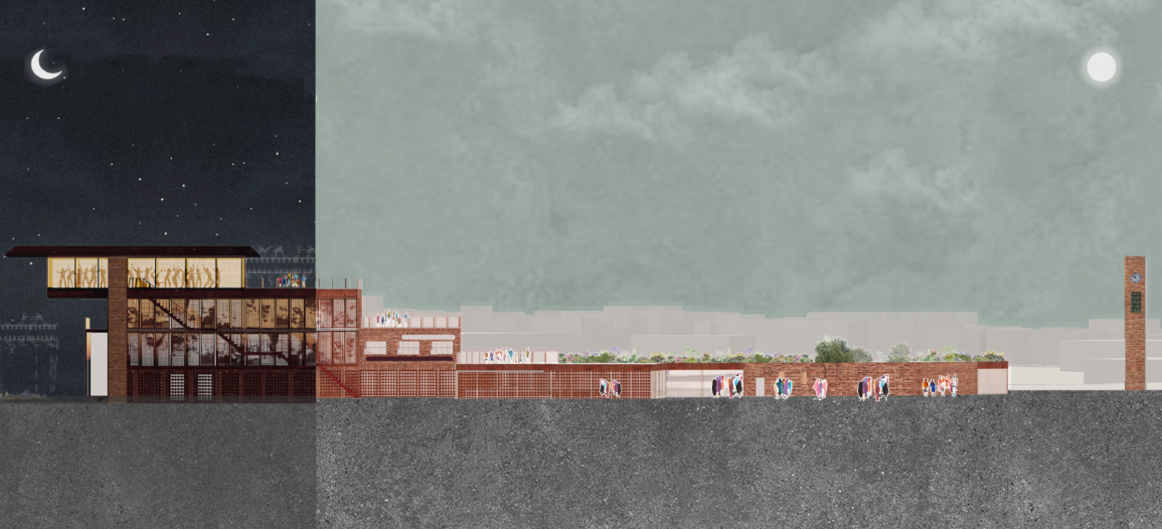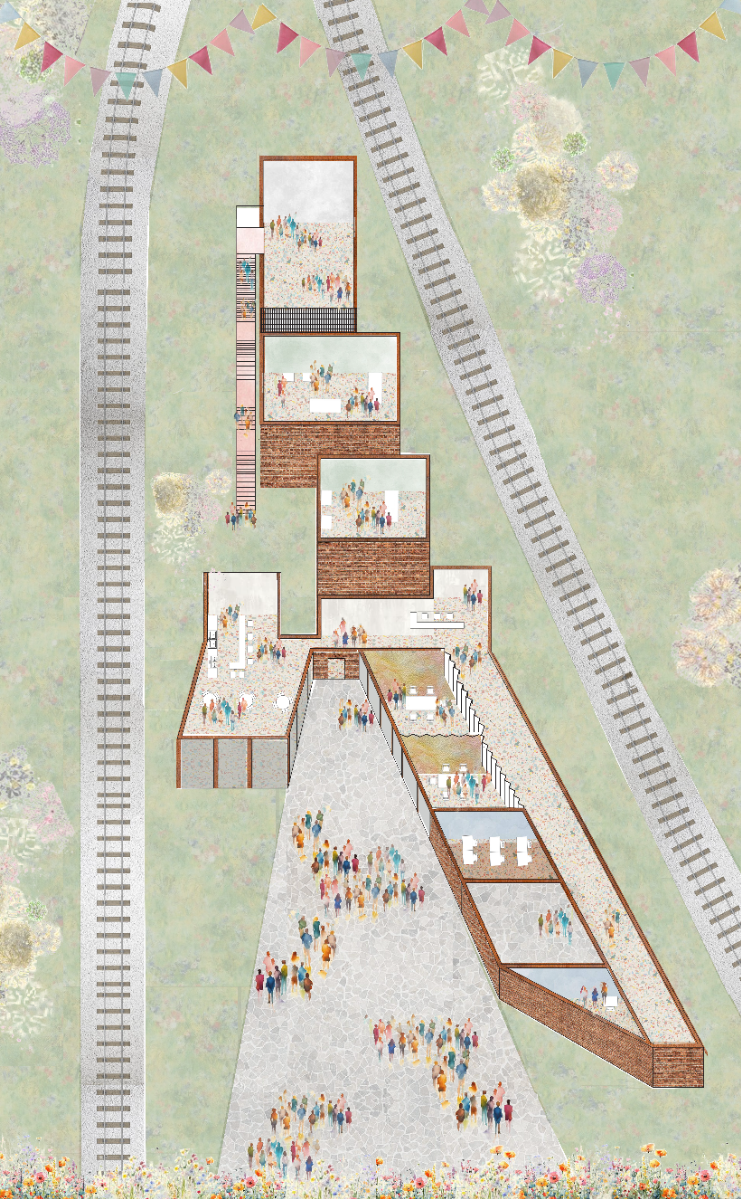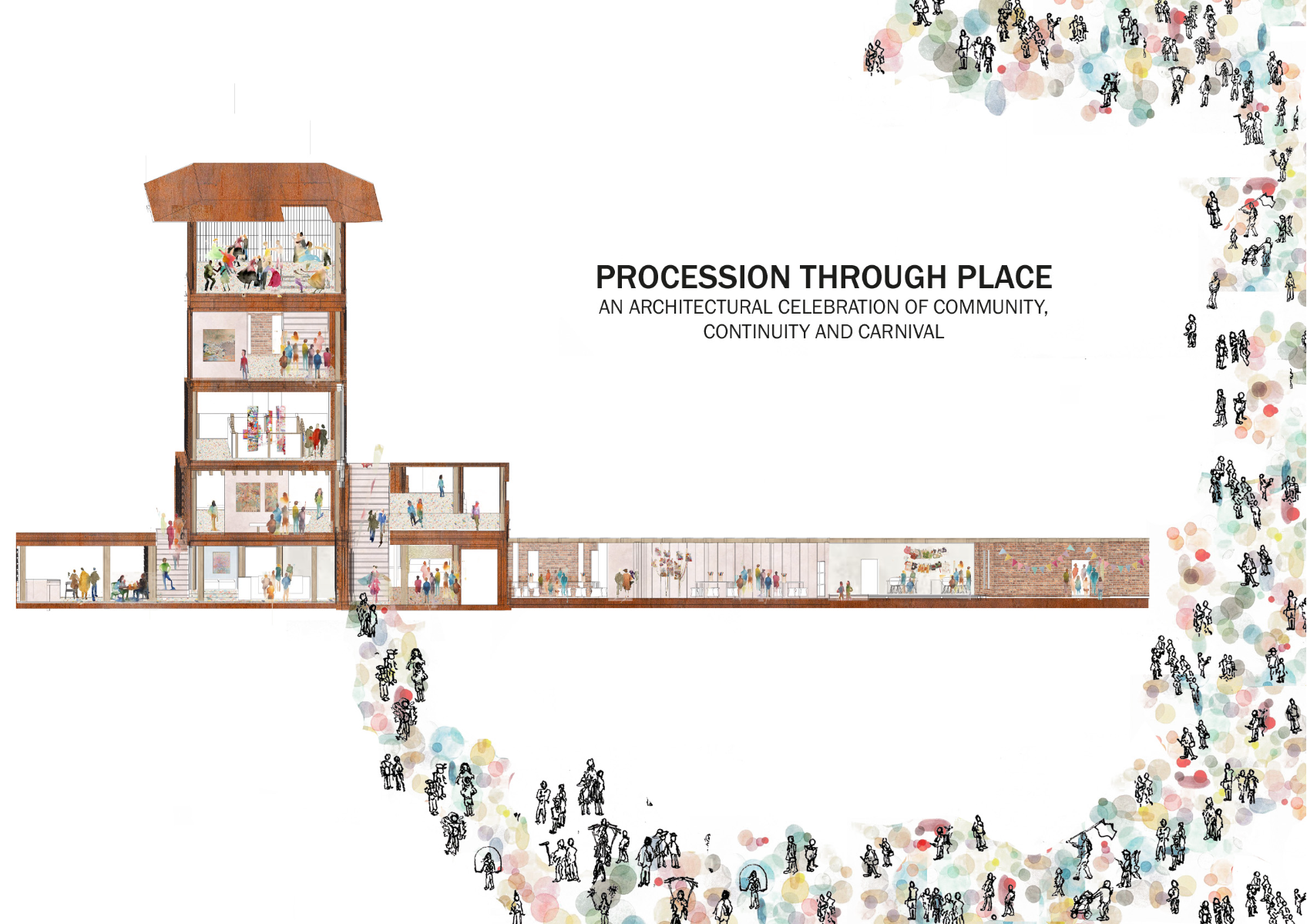 Procession Through Place is an adaptive reuse project that transforms the North Crewe Signal Box into a civic landmark, reviving the spirit of the Crewe Carnival through architecture. Rooted in the town’s industrial heritage and cultural legacy, the scheme reimagines the site as a space for connection, celebration, and continuity. At its core, the reinstated “Big Bill” clock tower stands as a symbol of memory and movement. The carnival inspired interventions blur the boundaries between old and new, audience and performer, public and private, creating an inclusive spatial experience that invites interaction, reflection, and celebration. The carnival procession continues through the building itself, winding upward along a central staircase that forms the project’s vertical spine. Above this stairwell, a series of skylights creates a procession of light, drawing people up through the structure and leading them toward a performance space crowning the scheme. Made from paper and timber, this lightweight room glows from within, allowing silhouettes of the carnival to emerge and animate its translucent walls. The façade itself becomes a key performer in this celebration. Bespoke Corten panels, patterned from archival 1960s imagery of the Crewe Carnival, animate the elevations. Like a carnival in motion, the building dances with its users, continually adapting to their rhythms and rituals, transforming the signal box into a living monument of collective memory and imagination.