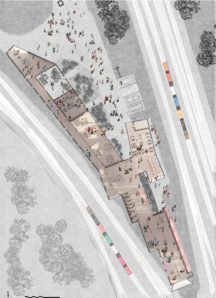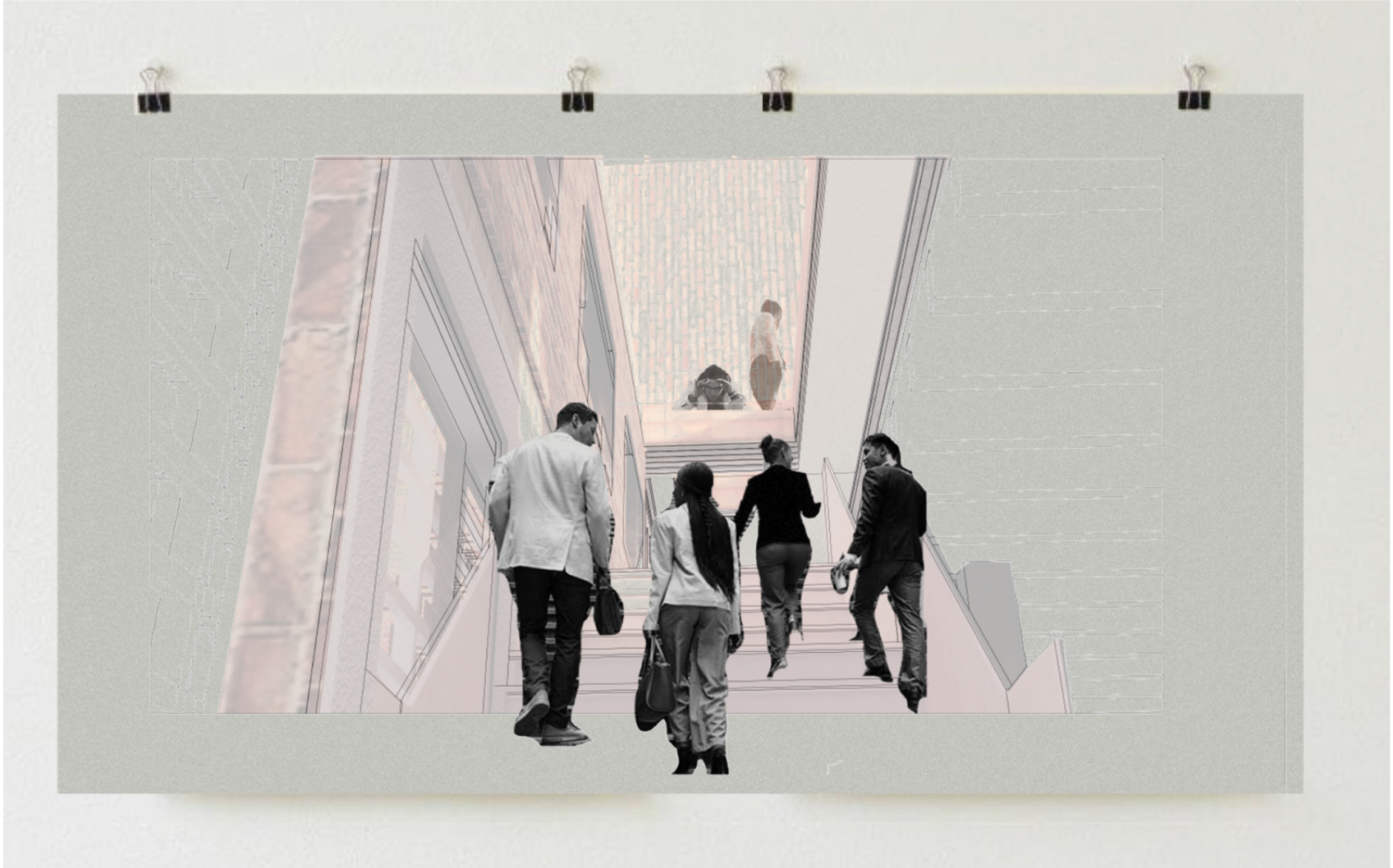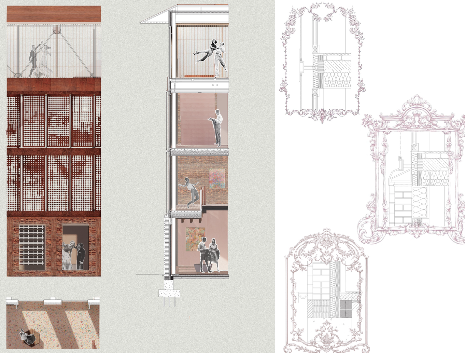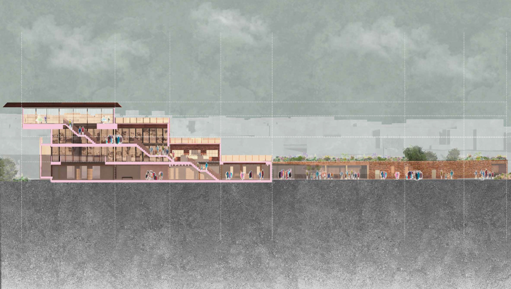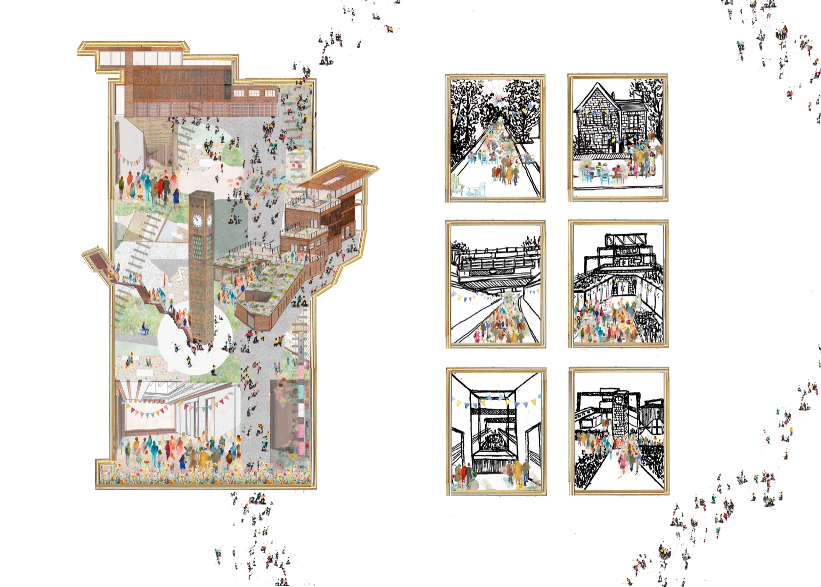 Procession Through Place is an adaptive reuse project that transforms the North Crewe Signal Box into a civic landmark, reviving the spirit of the Crewe Carnival through architecture. Rooted in the town’s industrial heritage and cultural legacy, the scheme reimagines the site as a space for connection, celebration, and continuity. At its core, the reinstated “Big Bill” clock tower stands as a symbol of memory and movement. The carnival inspired interventions blur the boundaries between old and new, audience and performer, public and private, creating an inclusive spatial experience that invites interaction, reflection, and celebration. The carnival procession continues through the building itself, winding upward along a central staircase that forms the project’s vertical spine. Above this stairwell, a series of skylights creates a procession of light, drawing people up through the structure and leading them toward a performance space crowning the scheme. Made from paper and timber, this lightweight room glows from within, allowing silhouettes of the carnival to emerge and animate its translucent walls. The façade itself becomes a key performer in this celebration. Bespoke Corten panels, patterned from archival 1960s imagery of the Crewe Carnival, animate the elevations. Like a carnival in motion, the building dances with its users, continually adapting to their rhythms and rituals, transforming the signal box into a living monument of collective memory and imagination.