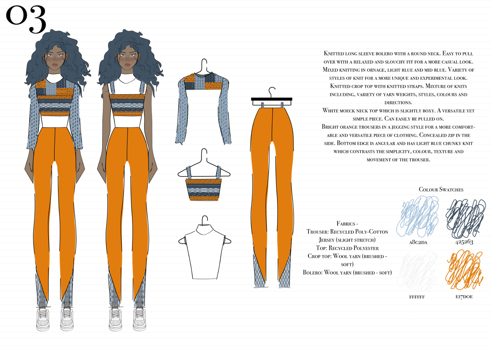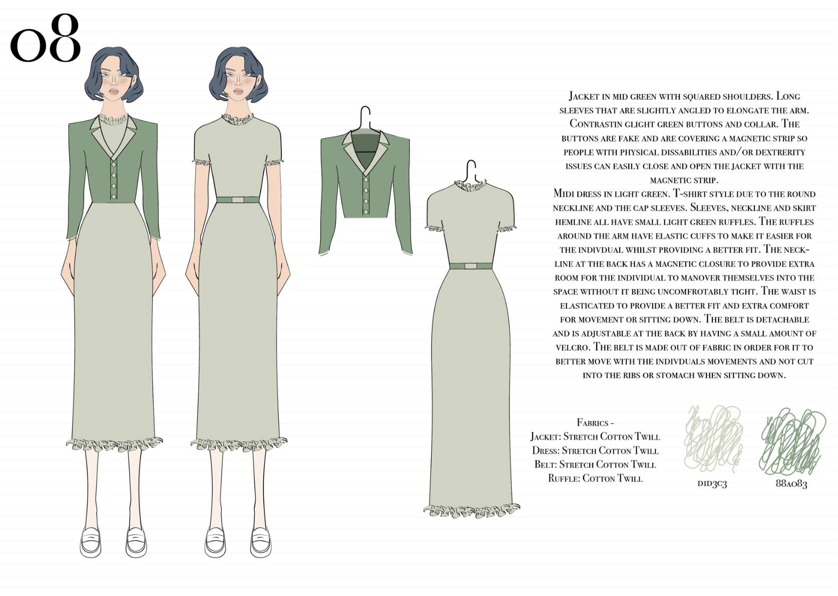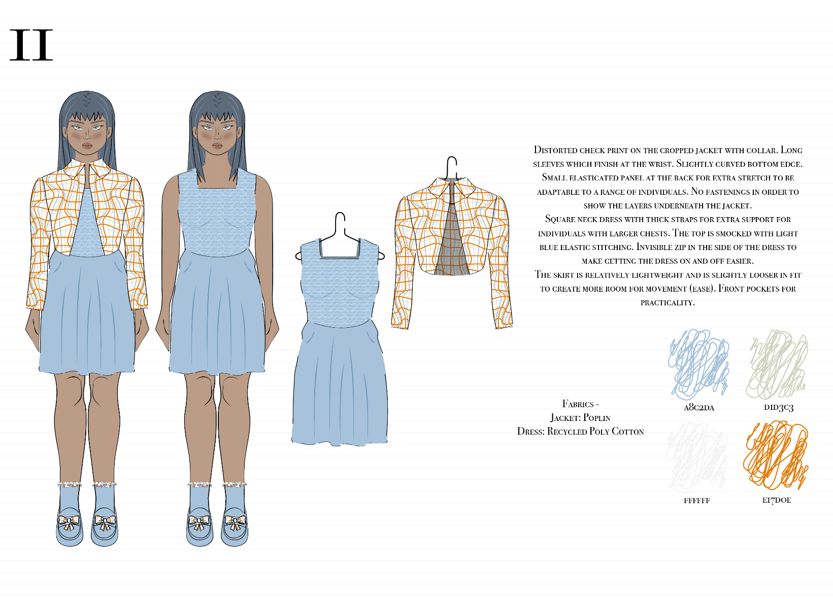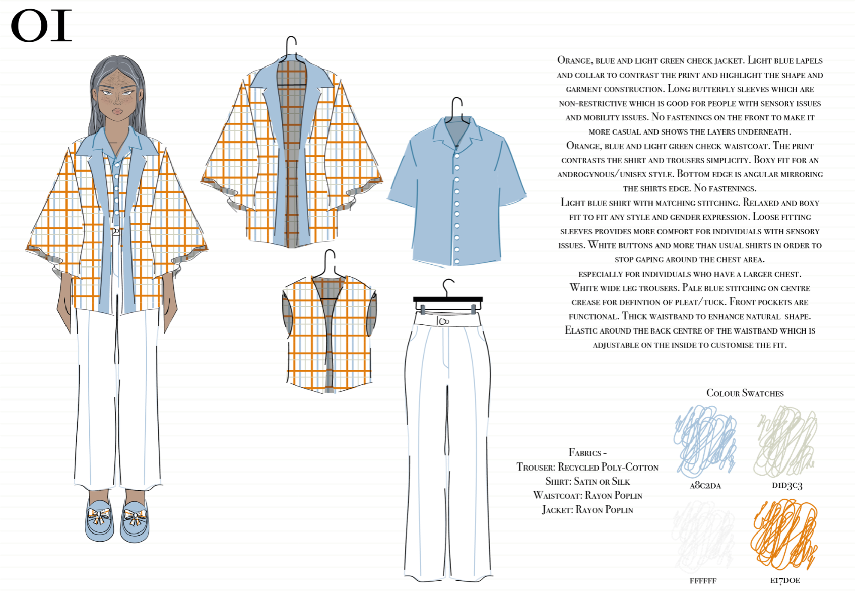 Hugo Boss Competition (ArtsThread) - Re-Invent, Re-Design, Re-Define Looking at all the variables and individuals that make up the work industry as it is important to create garments that serve a purpose, fit the individual and look fashionable as work clothing has no need to be boring! Highlighting the importance of creating garments that are inclusive for example; fabric finish, fit, sizing, consider different aspects of inclusive disabled clothing - physical disabilities and tactile considerations, gender identities, environmentally friendly fabrics whilst re-shaping the idea of business clothing into something exciting, expressive and individual.