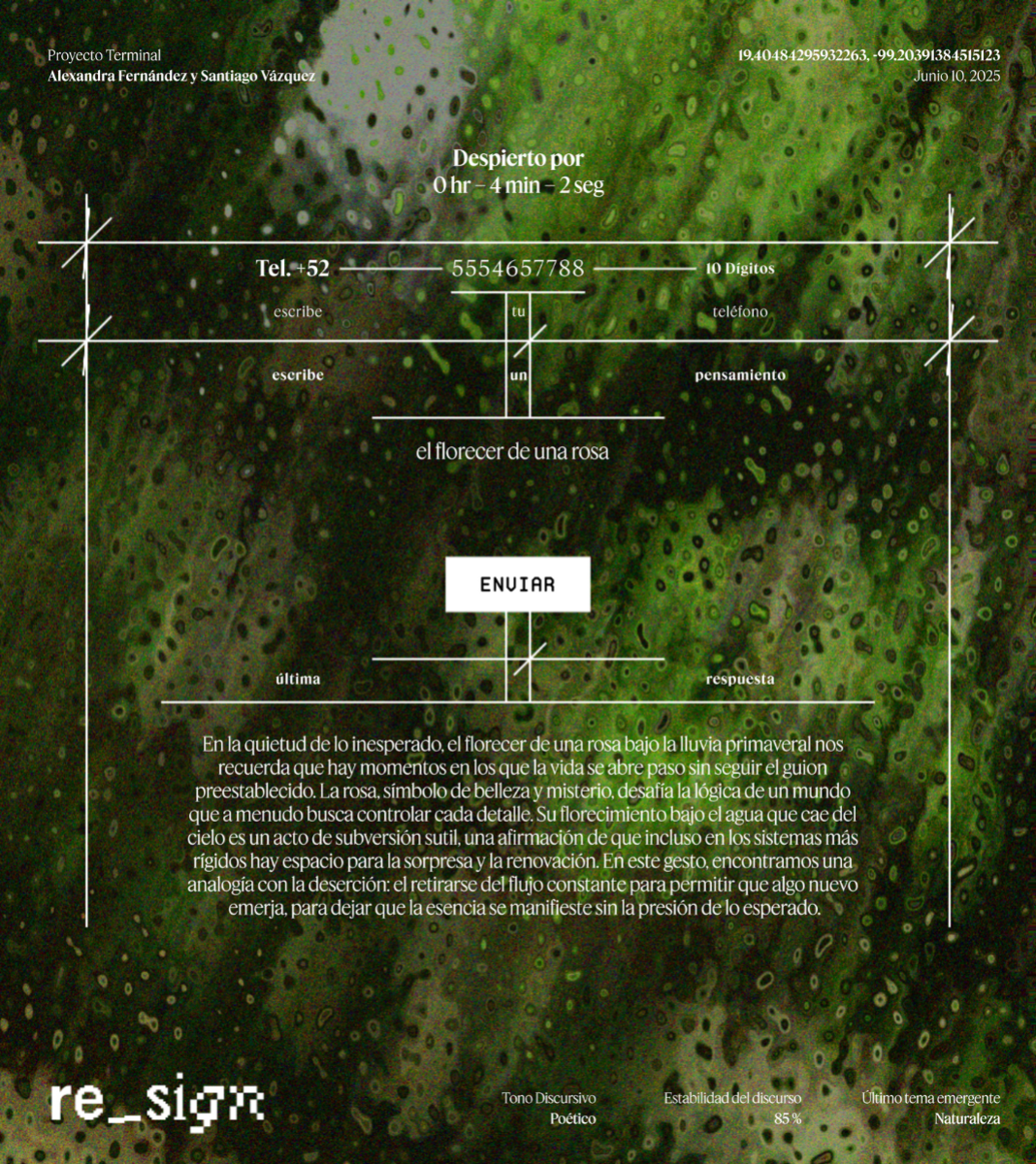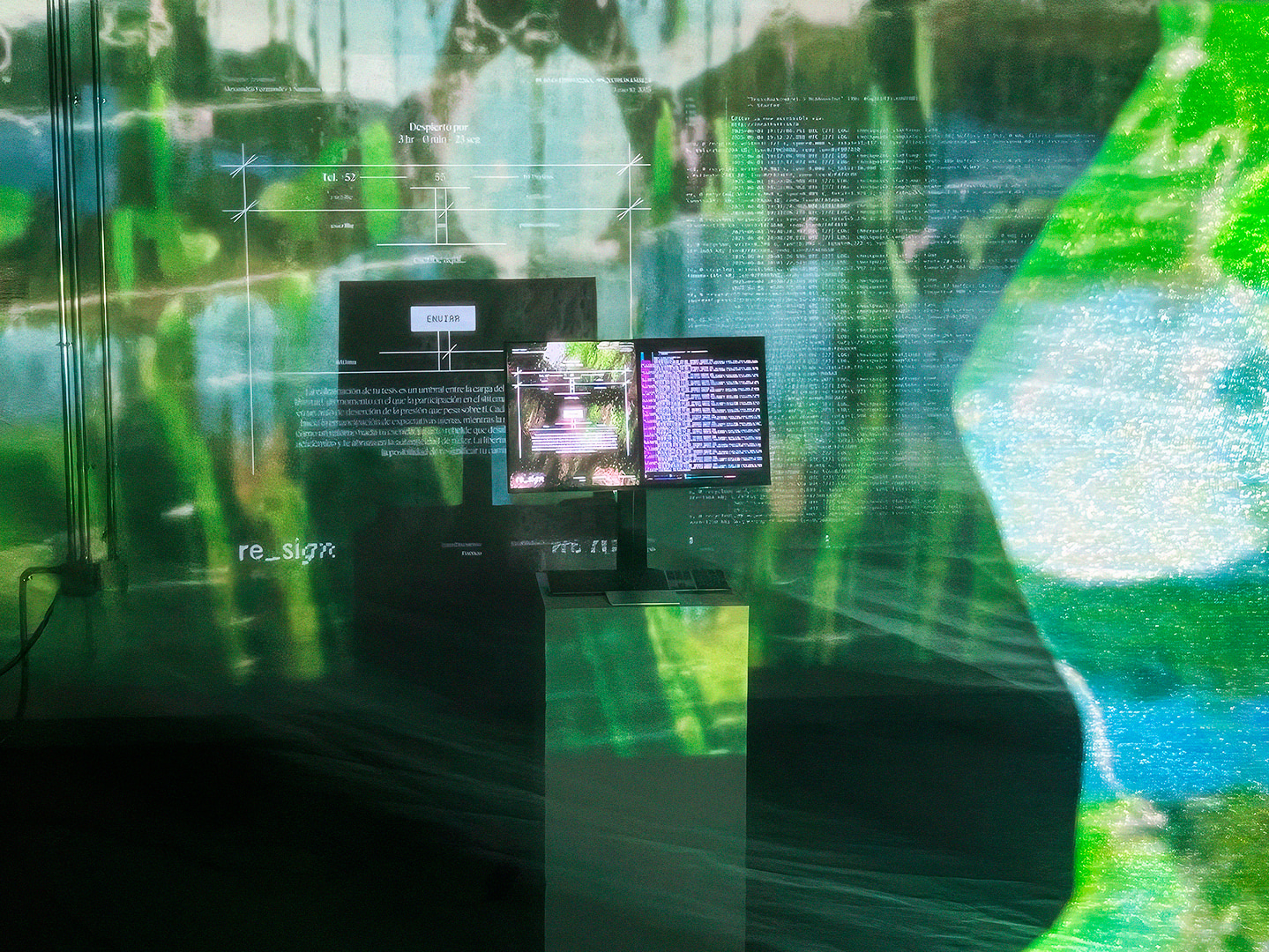 re_sign is an immersive AI-driven installation born from the tension between technological alienation and the longing for collective presence. In a moment defined by the rapid rise of artificial intelligence, instead of allowing us to “resign” to passive acceptance of pre-scripted futures that flatten complexity, it insists we “re-signify”—assign new meanings to old thoughts. Visitors contribute words or phrases through a conversational interface; AI agents respond with text while simultaneously transforming the input into evolving soundscapes and generative visuals. Each interaction is stored in a growing database, turning the room into a living memory that remembers, mutates, and carries forward every encounter. Addressing themes of desertion, alienation, emancipation, and mutability, re_sign becomes more than an installation: it is a living environment where language, technology, and reflection converge into shared memory and collective transformation. A project by Alexandra Fernández and Santiago Vázquez
