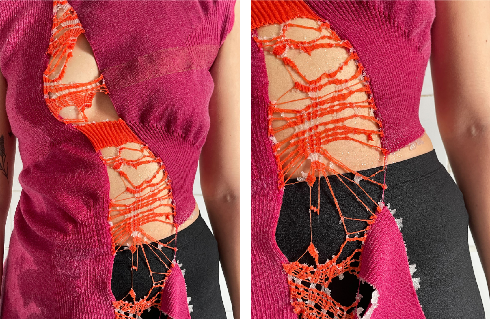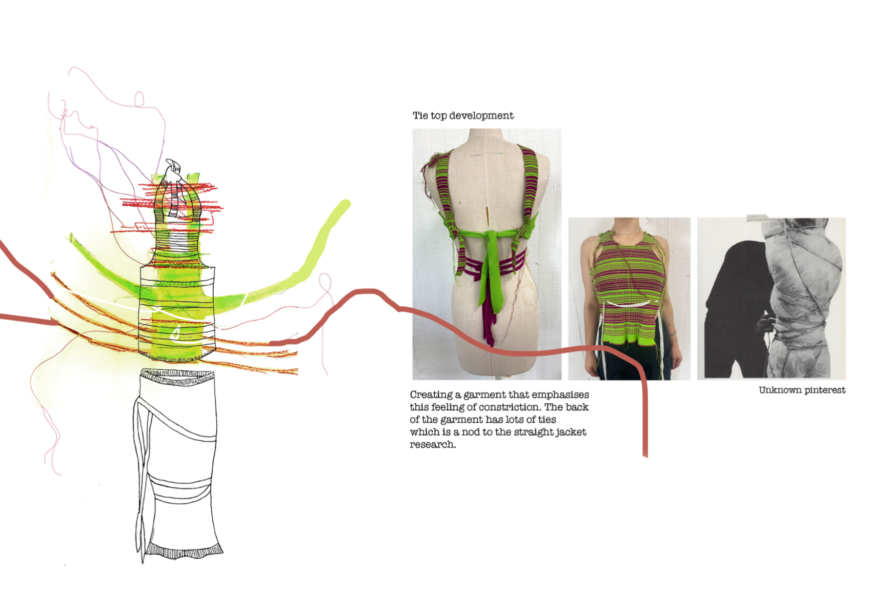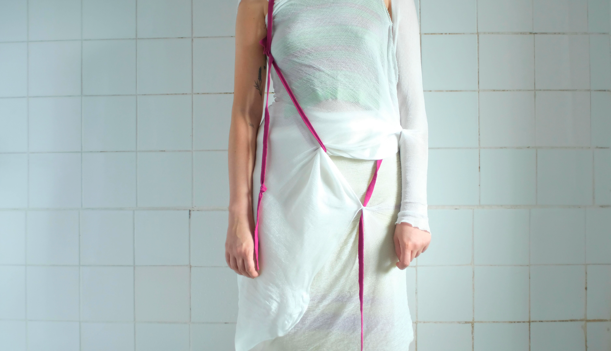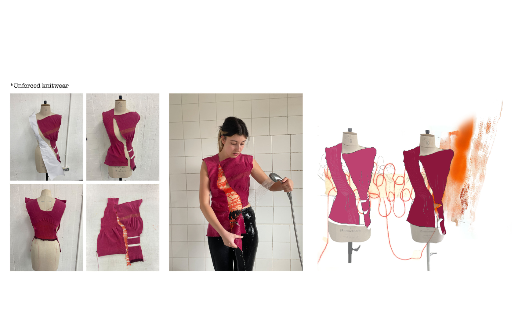 The aim of my project is to create a performance piece using knitwear that has a sense of movement and vulnerability. I touch upon the key themes of constriction and release and how this affects people’s emotions and movements. I feel it is imperative that within my work I talk about the problems of mental health and how this can have different effects on different people. Within the project, I use Solvron (dissolvable) yarn combined with my knitwear pieces to create work that tells my story and my relationship with my mindset. The work symbolises how people often go around their day with a protective layer shielding themselves through the stress of life. This changes when they step into the shower shedding this skin-like layer revealing their true selves and vulnerabilities.