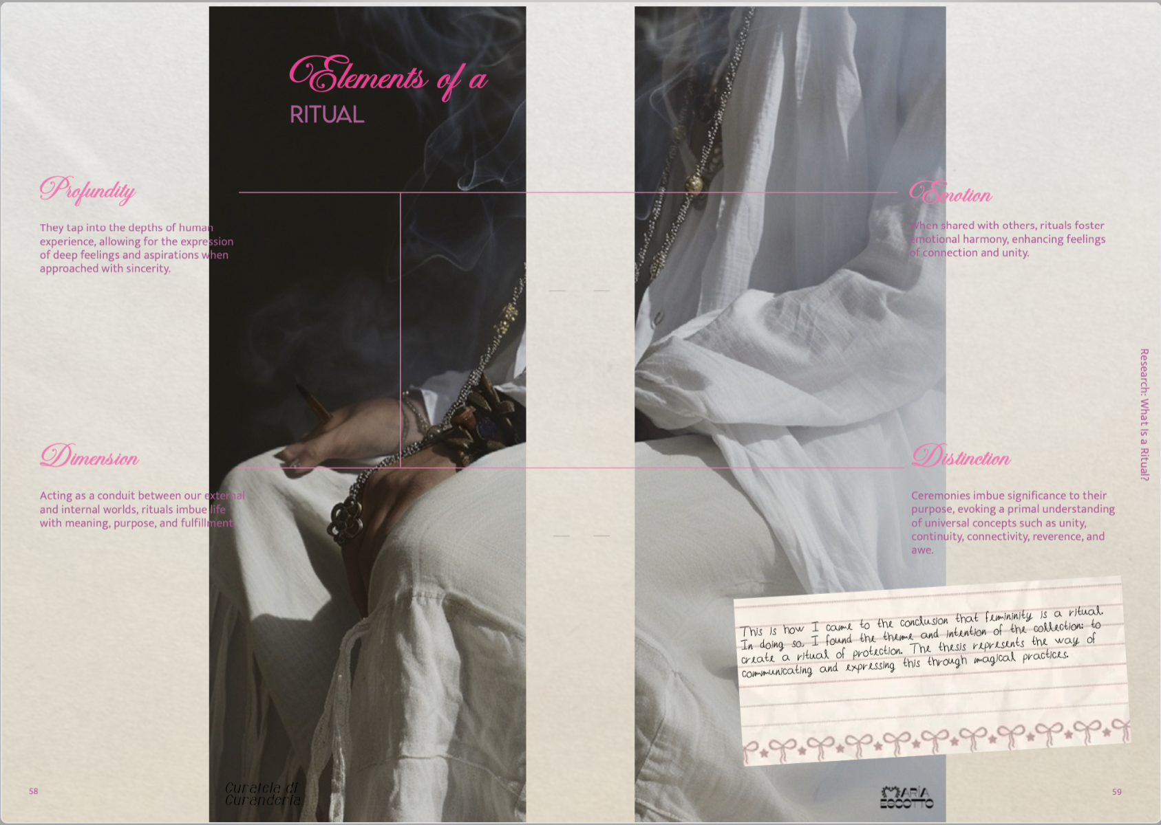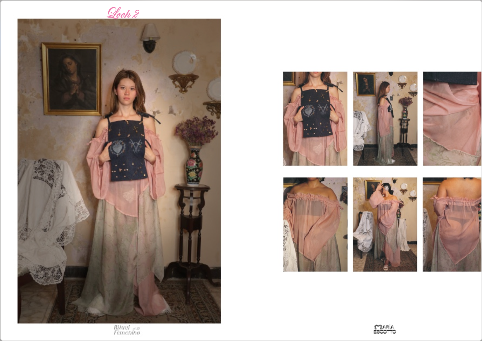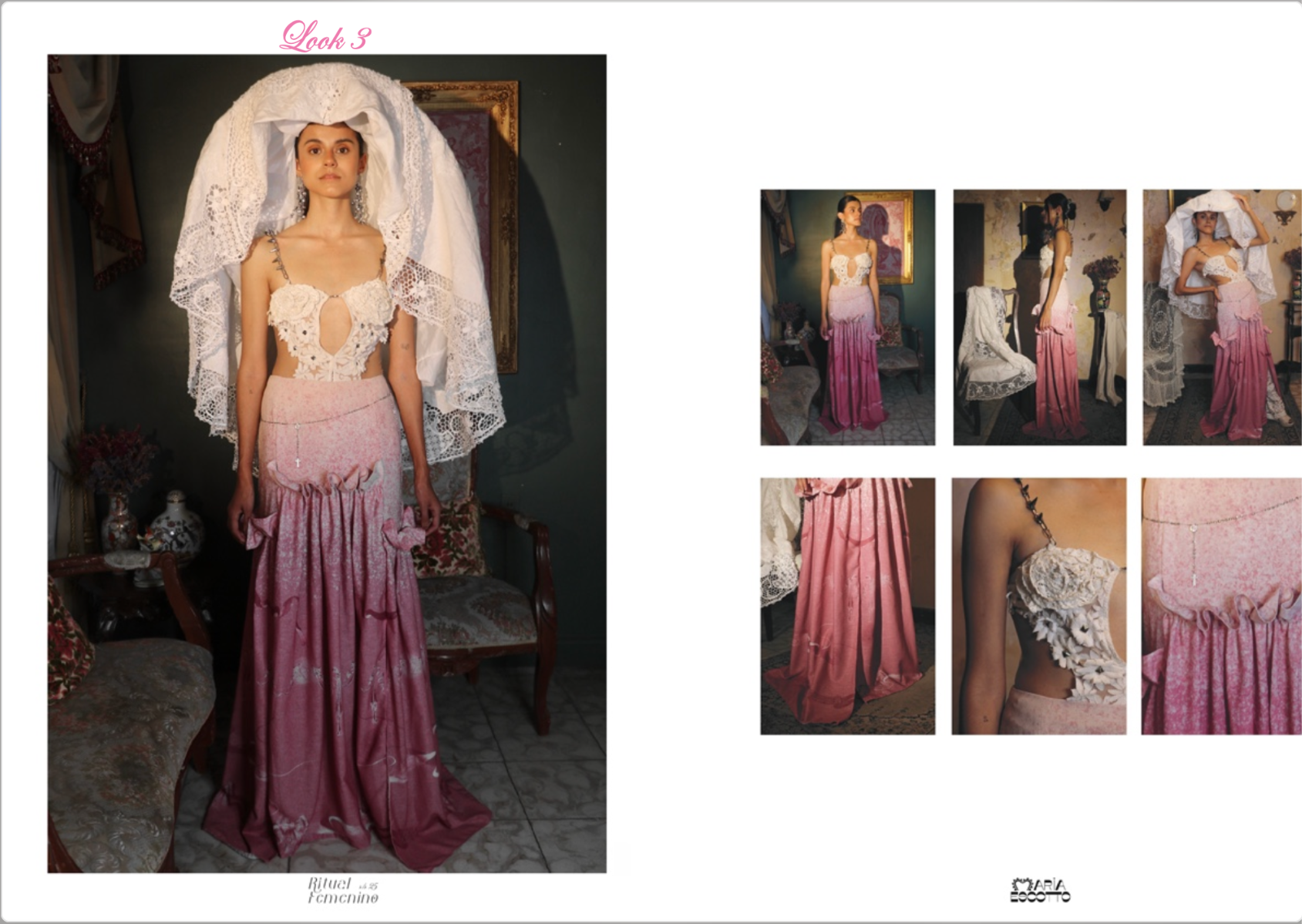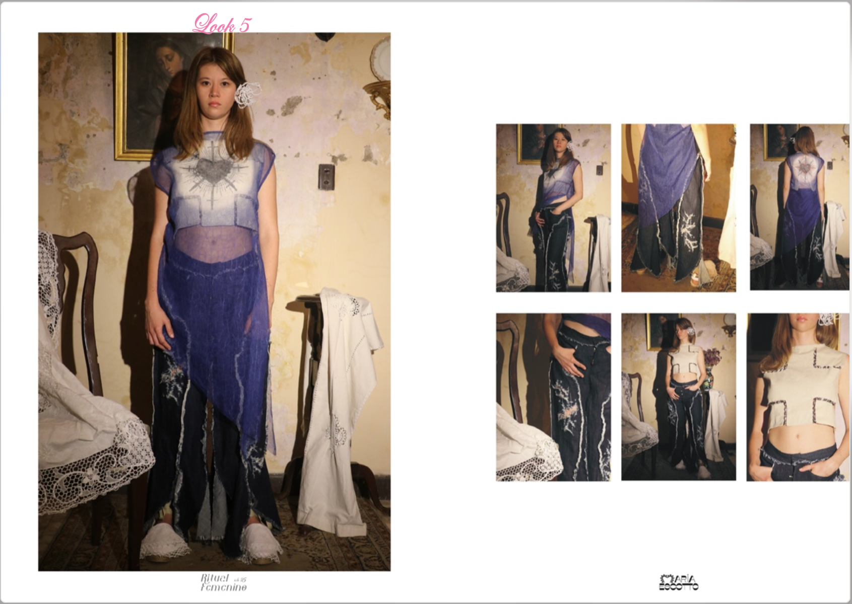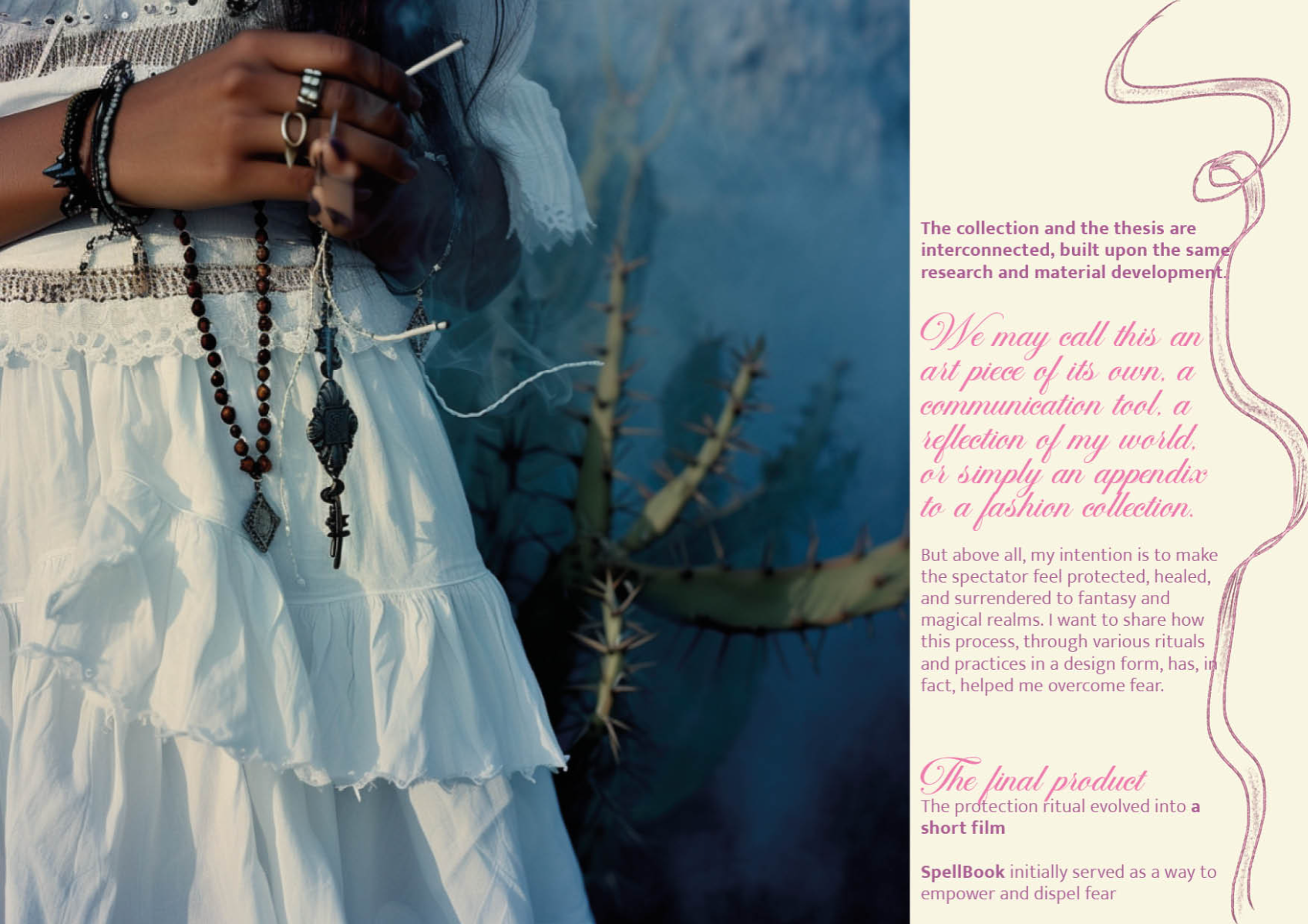 Ritual Femenino is a womenswear collection exploring the intersection between the ritual of being a woman and spiritual protection rooted in my Mexican culture. Women, considered the weak sex in society, hold the spiritual power to bless or curse, embodying hidden strength. Inspired by this duality and the ongoing lack of safety, I created protections through a graphic language of textile manipulation, embroidery, prints and charms. Textiles, both sheer and rigid, express vulnerability and concealment. The ritual culminates in a fashion film where house and light are protagonists, extending into a spellbook of ten protective spells with textile pages and artifacts.