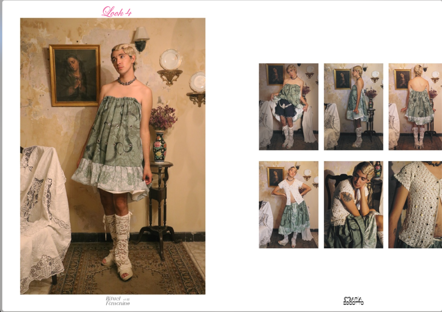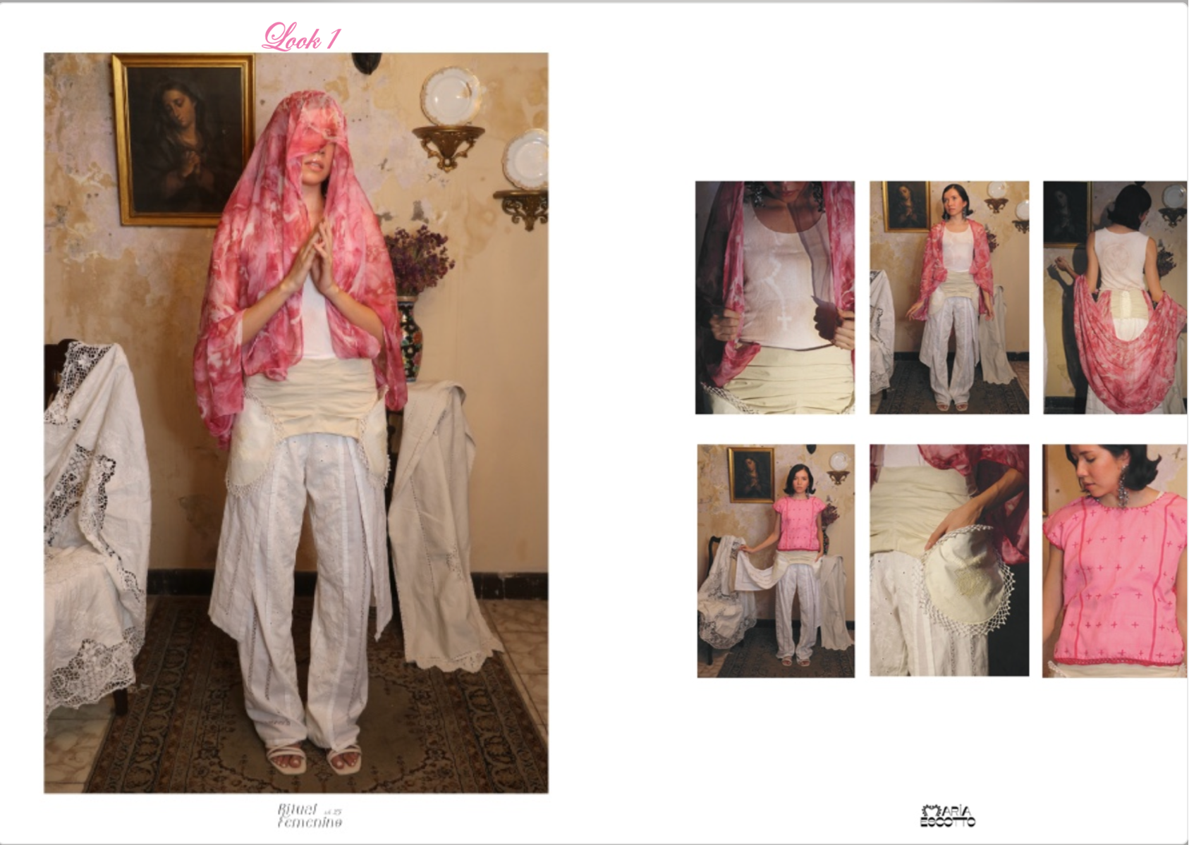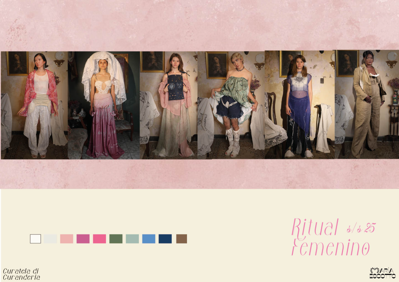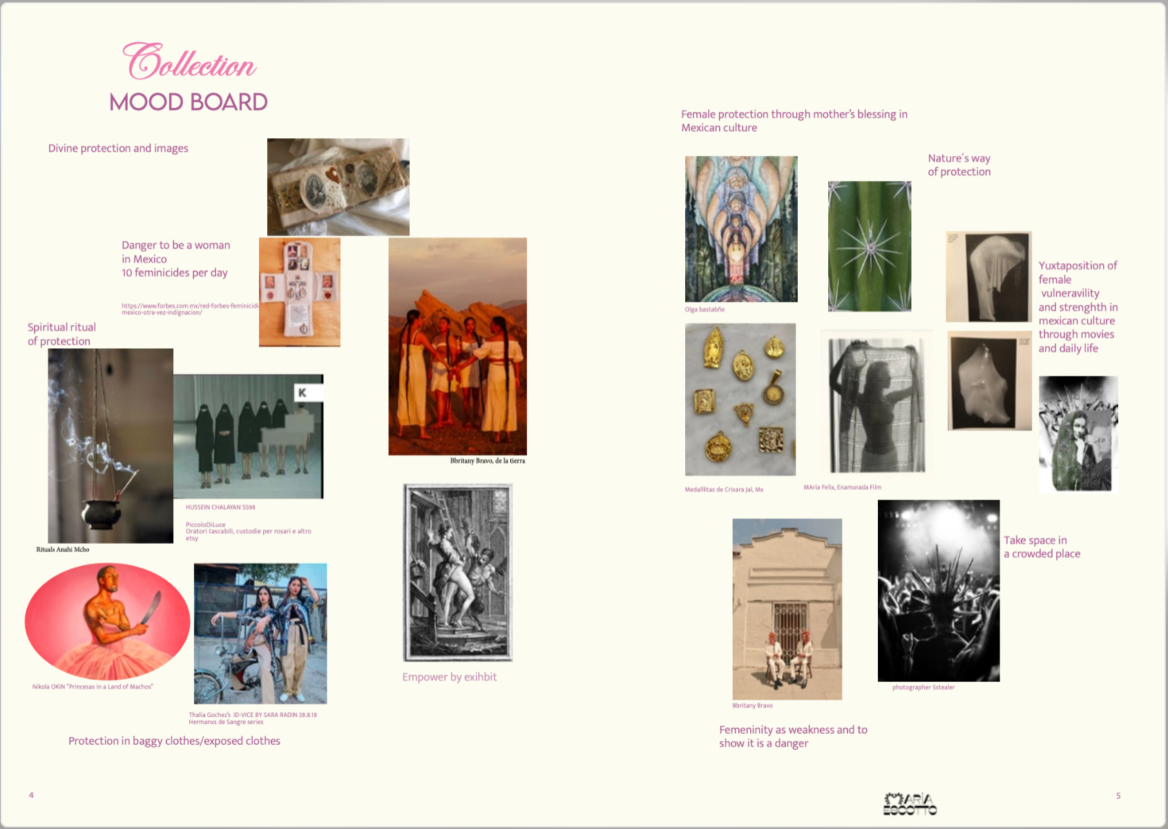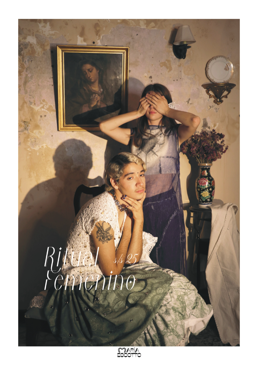 Ritual Femenino is a womenswear collection exploring the intersection between the ritual of being a woman and spiritual protection rooted in my Mexican culture. Women, considered the weak sex in society, hold the spiritual power to bless or curse, embodying hidden strength. Inspired by this duality and the ongoing lack of safety, I created protections through a graphic language of textile manipulation, embroidery, prints and charms. Textiles, both sheer and rigid, express vulnerability and concealment. The ritual culminates in a fashion film where house and light are protagonists, extending into a spellbook of ten protective spells with textile pages and artifacts.