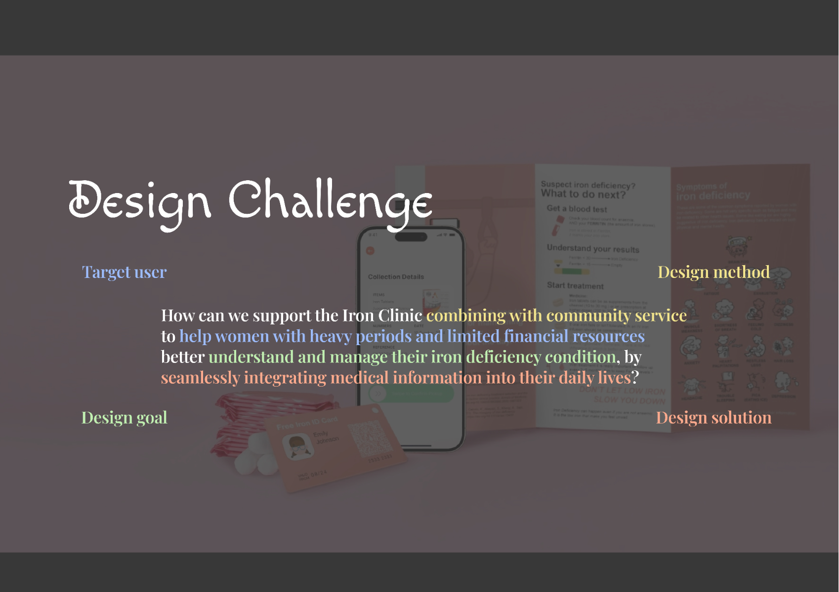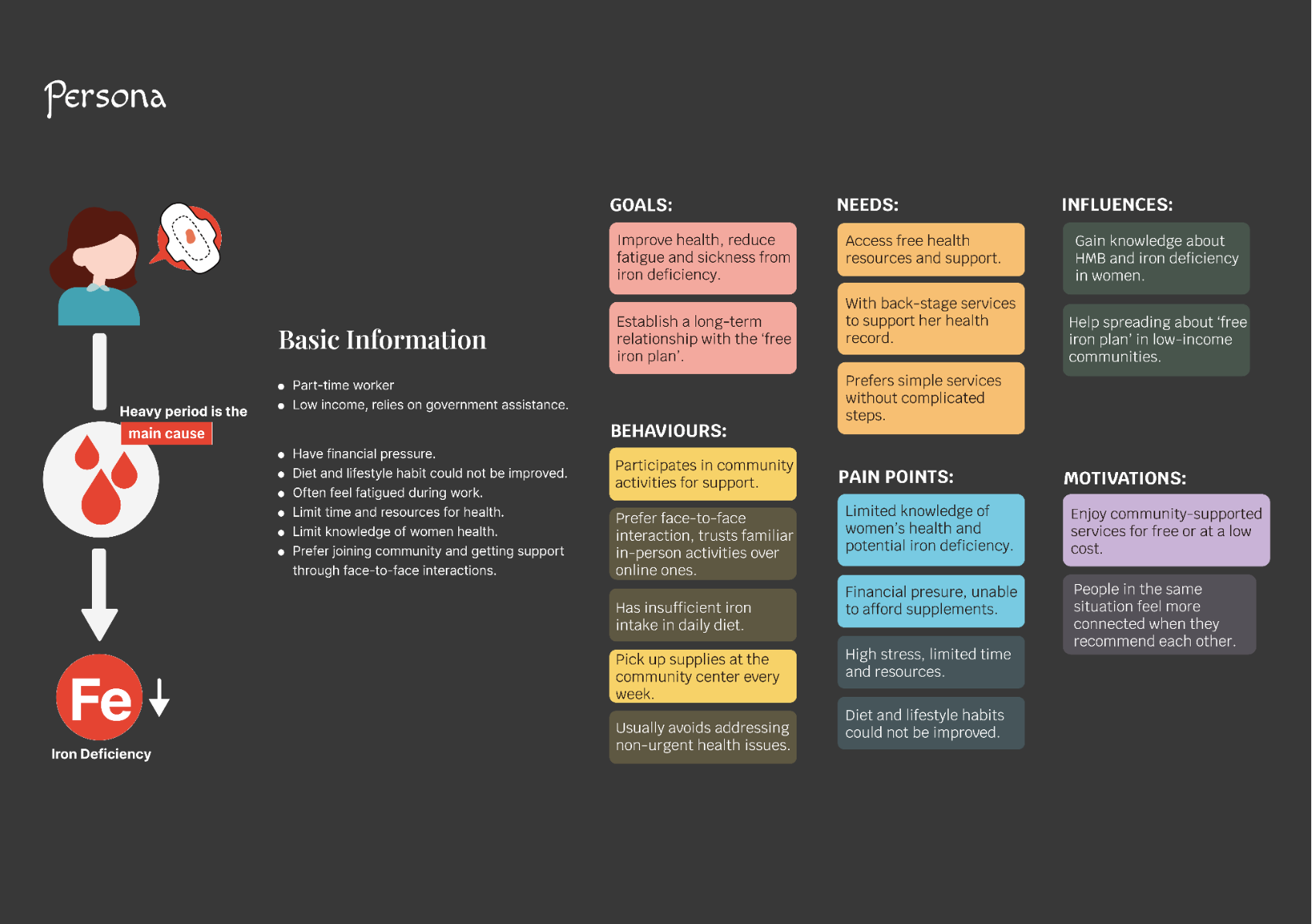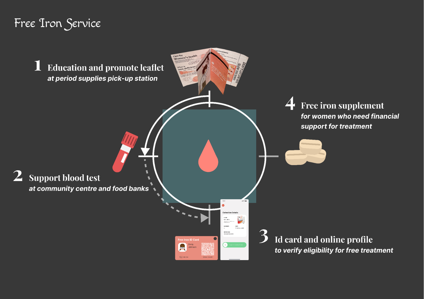 This service design project tackles the prevalent issue of iron deficiency among women, particularly those from low-income backgrounds who experience heavy menstrual bleeding (HMB). In collaboration with The Iron Clinic and the free period product service in Scotland, the project proposes the "Free Iron Plan." This initiative integrates health education, free blood testing, and iron supplements into existing community touchpoints, such as food banks and community centres. By redesigning product packaging to include self-assessment cues and developing a supportive app (FeBloom), the service seamlessly connects women to medical resources, making health management accessible and destigmatised.