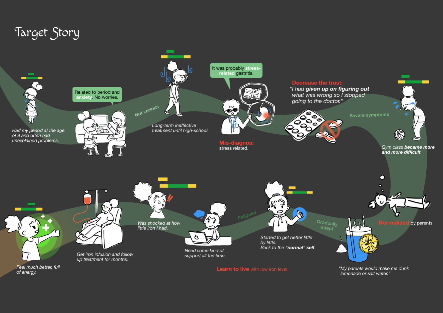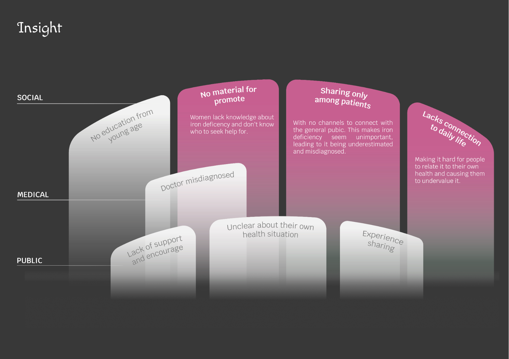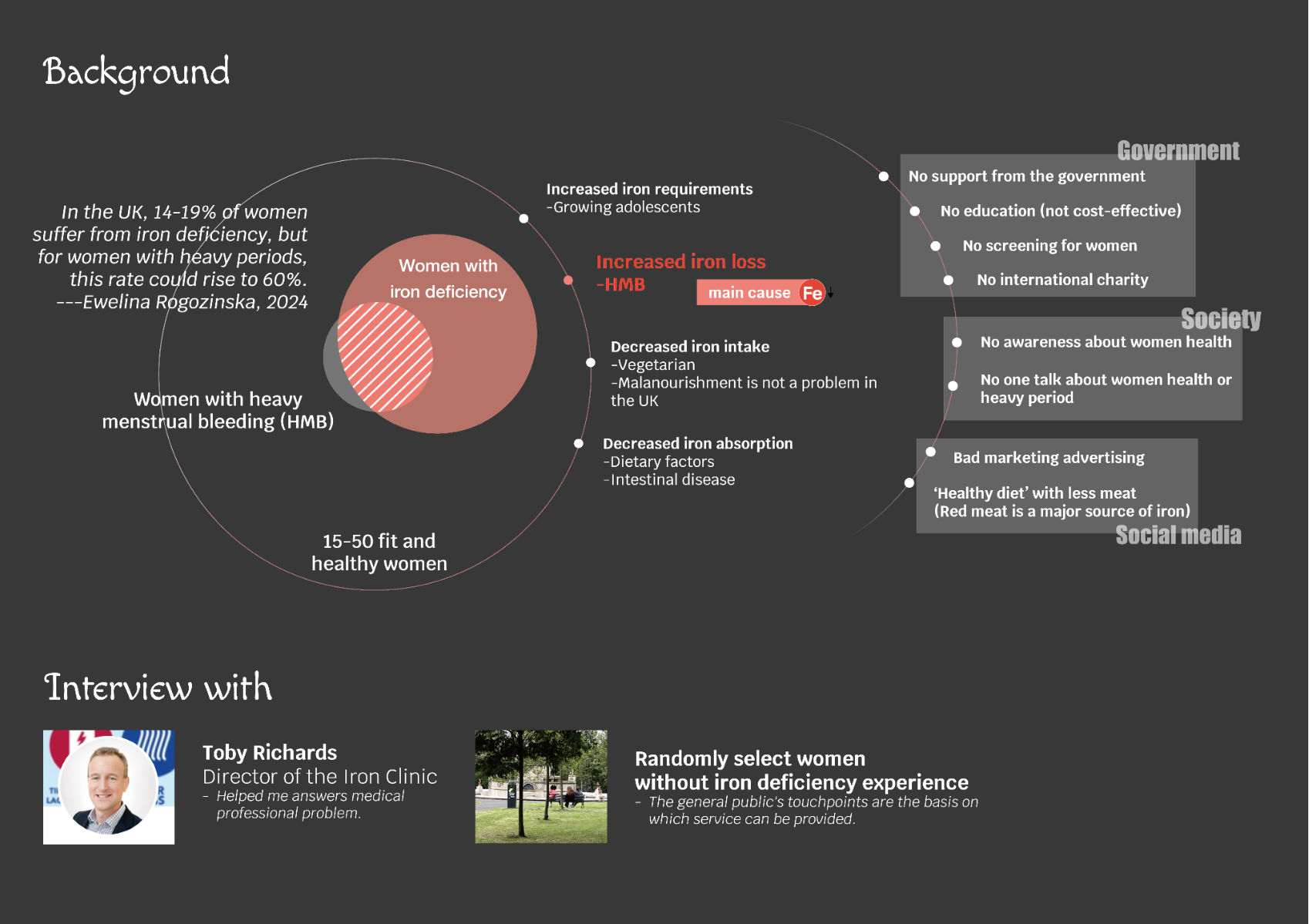 This service design project tackles the prevalent issue of iron deficiency among women, particularly those from low-income backgrounds who experience heavy menstrual bleeding (HMB). In collaboration with The Iron Clinic and the free period product service in Scotland, the project proposes the "Free Iron Plan." This initiative integrates health education, free blood testing, and iron supplements into existing community touchpoints, such as food banks and community centres. By redesigning product packaging to include self-assessment cues and developing a supportive app (FeBloom), the service seamlessly connects women to medical resources, making health management accessible and destigmatised.