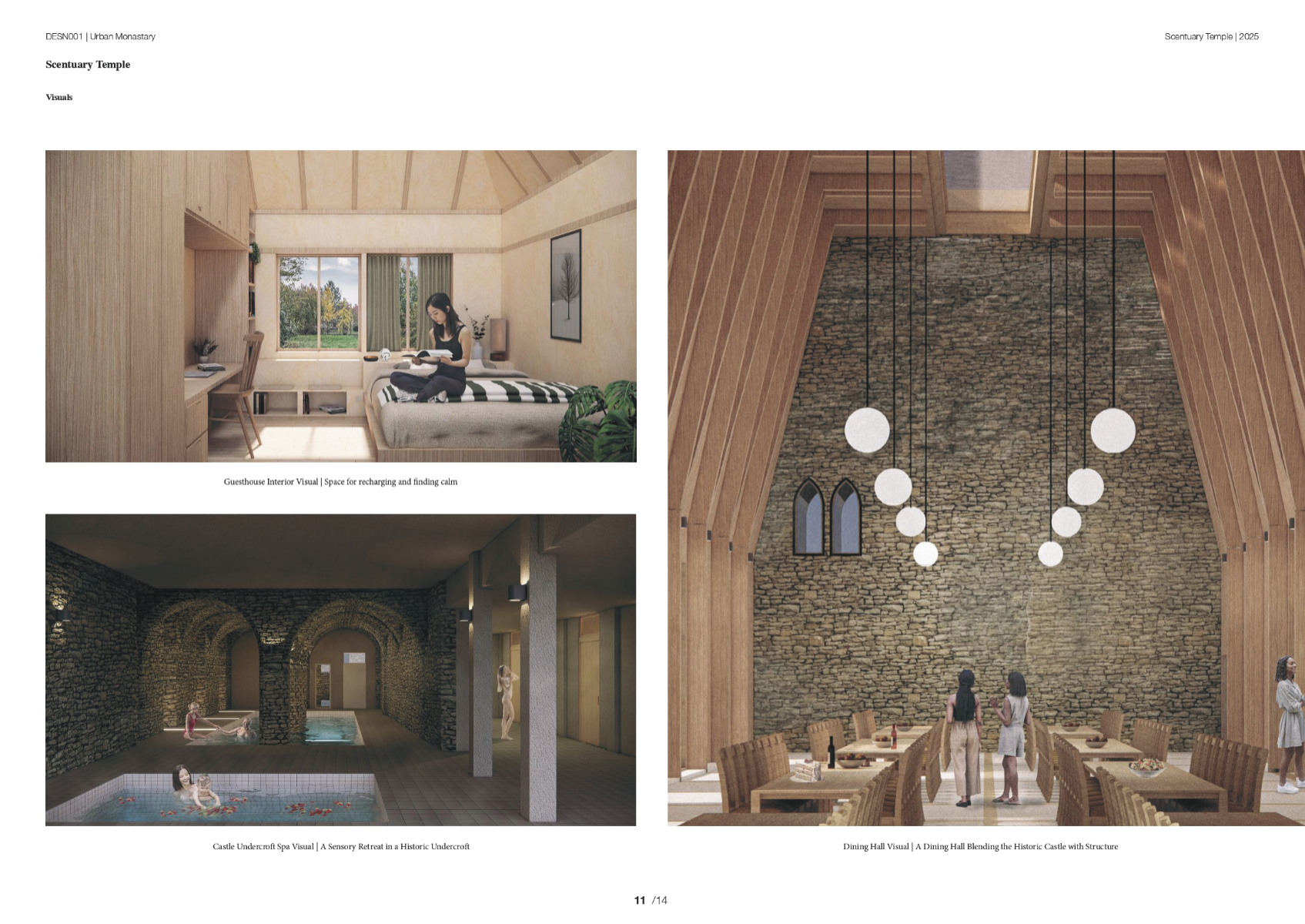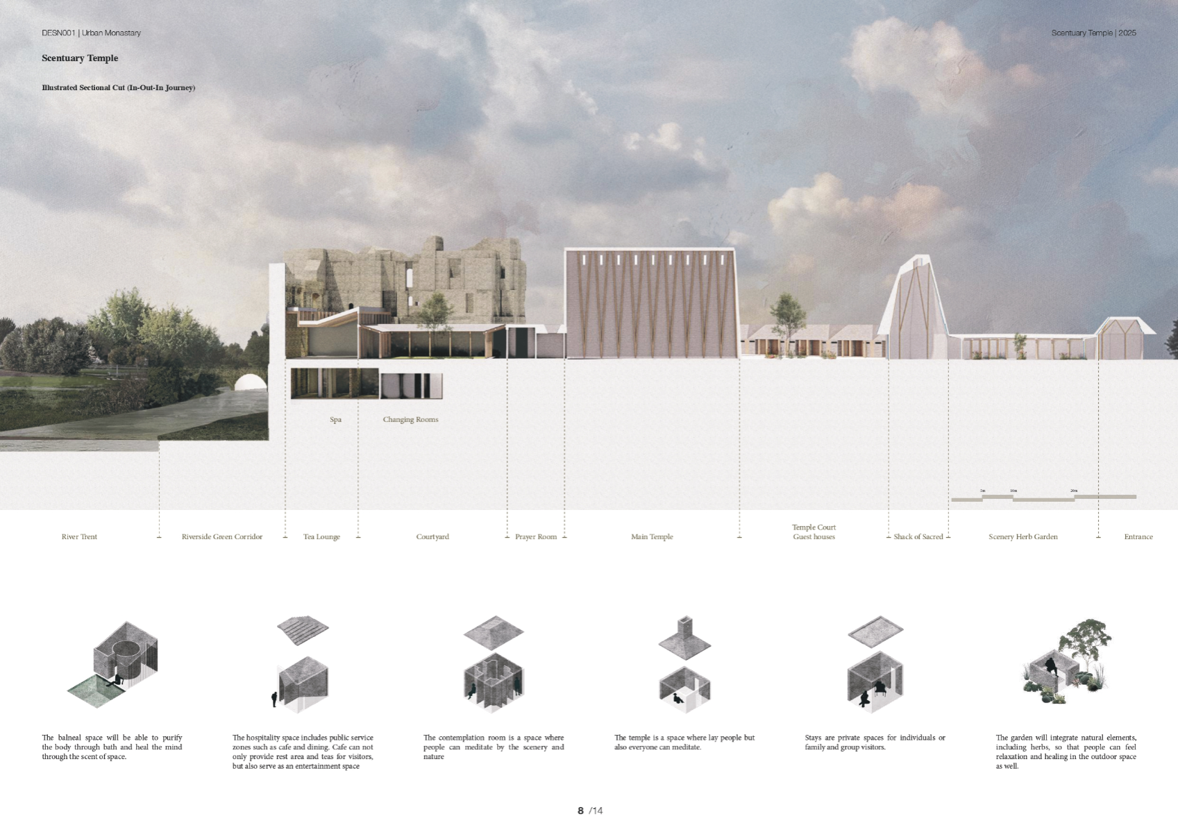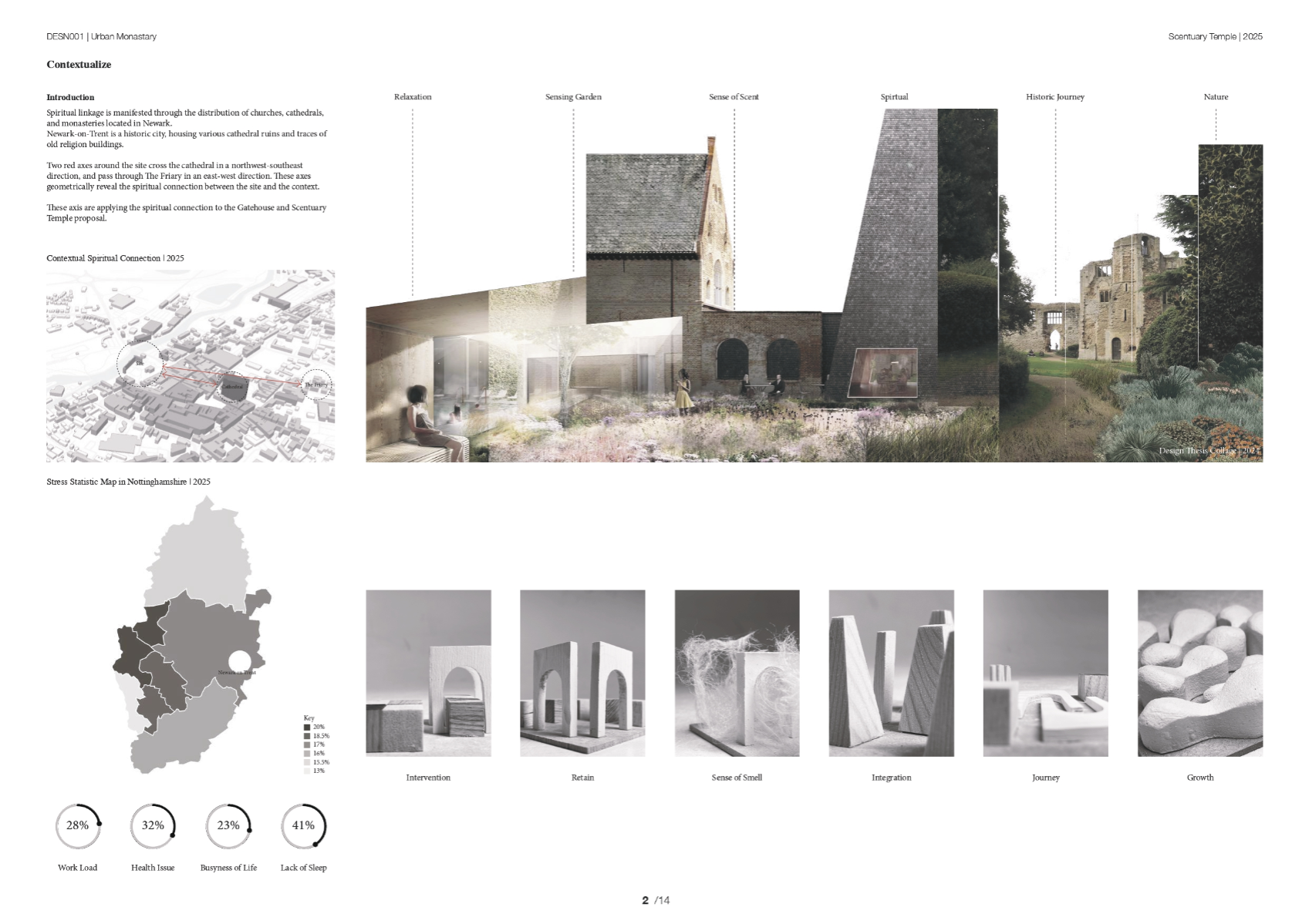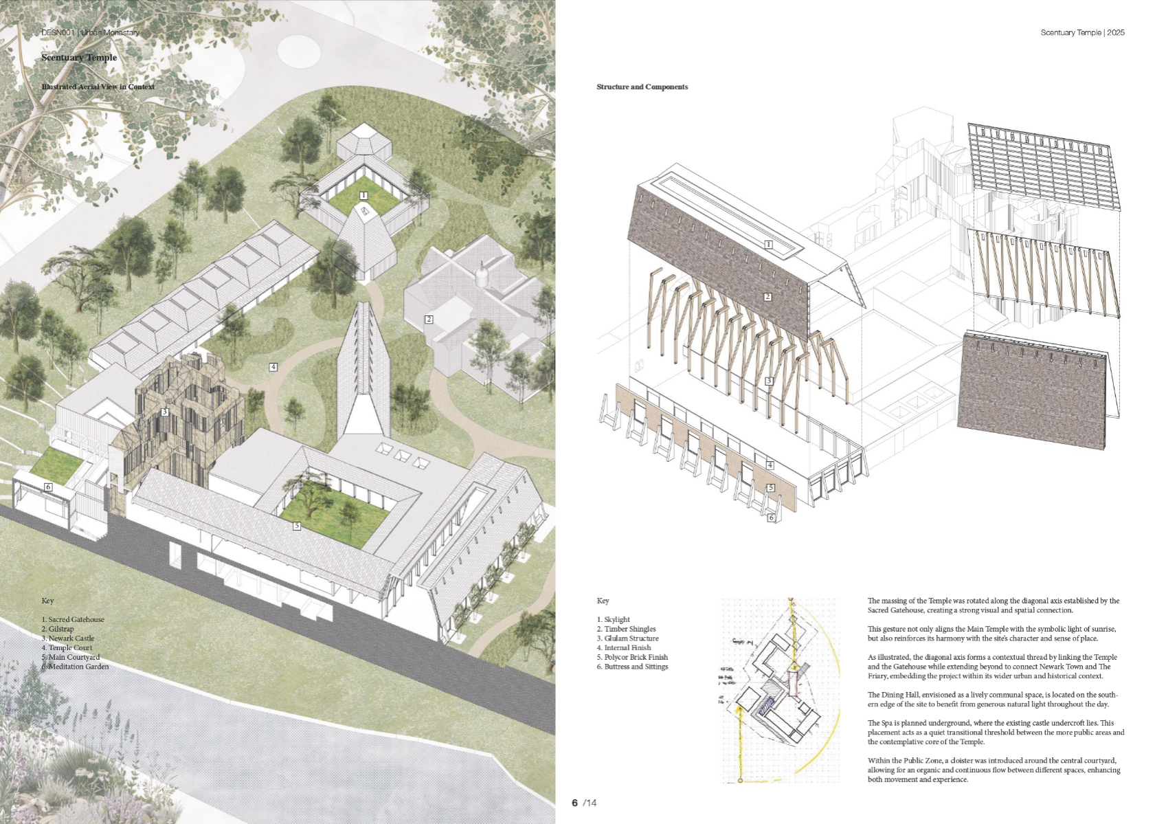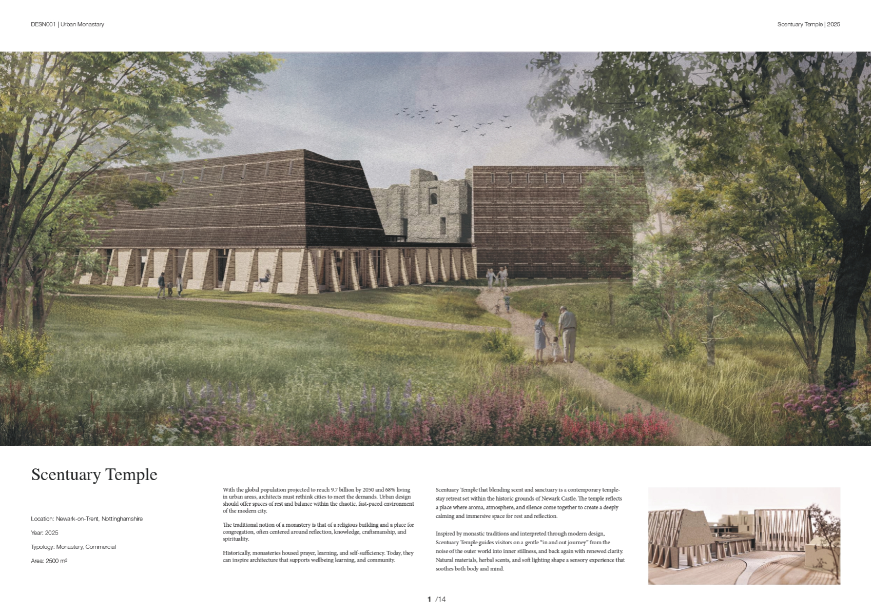 The Temple Stay project envisions a healing architectural framework within Newark Castle, offering sanctuary for rest, reflection, and reconnection with nature. Integrating six key elements: olfaction, space, nature, humanity, modernity, and history, the design emphasizes the deep bond between humans and their environment. Olfactory experiences serve as a medium for emotional healing, engaging primal sensory responses beyond words. The spatial strategy develops through three interrelationships: scent and space beginning at the Sacred Gatehouse, harmony of movement within the landscape, and dialogue between past and present. The result is a culturally rooted, contemporary architecture that nurtures well-being and contemplation.