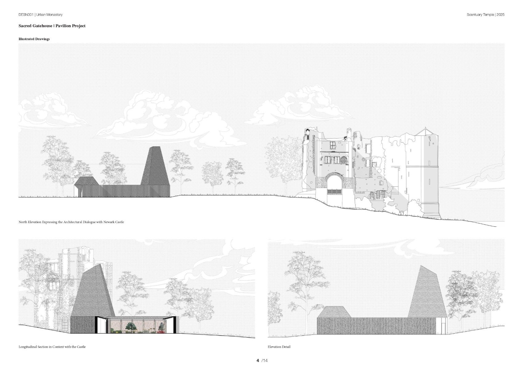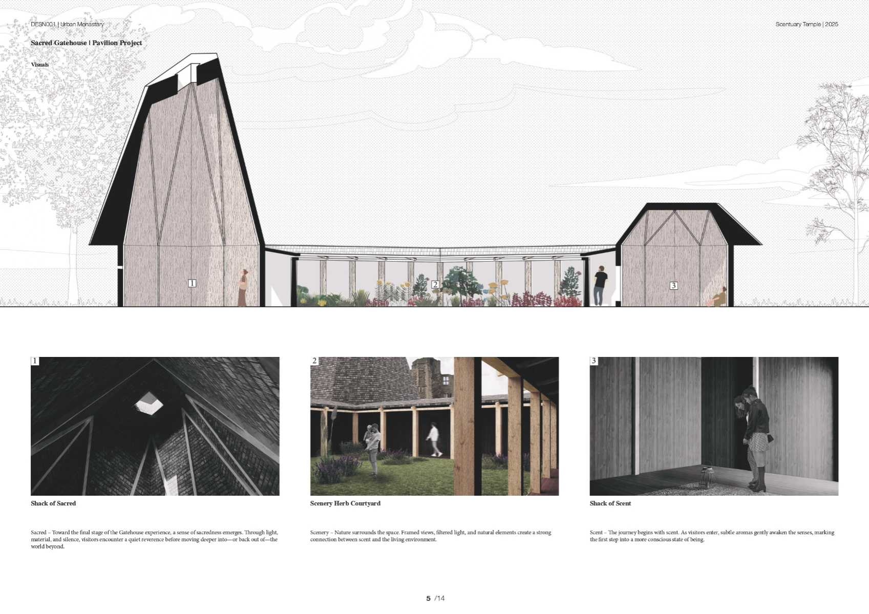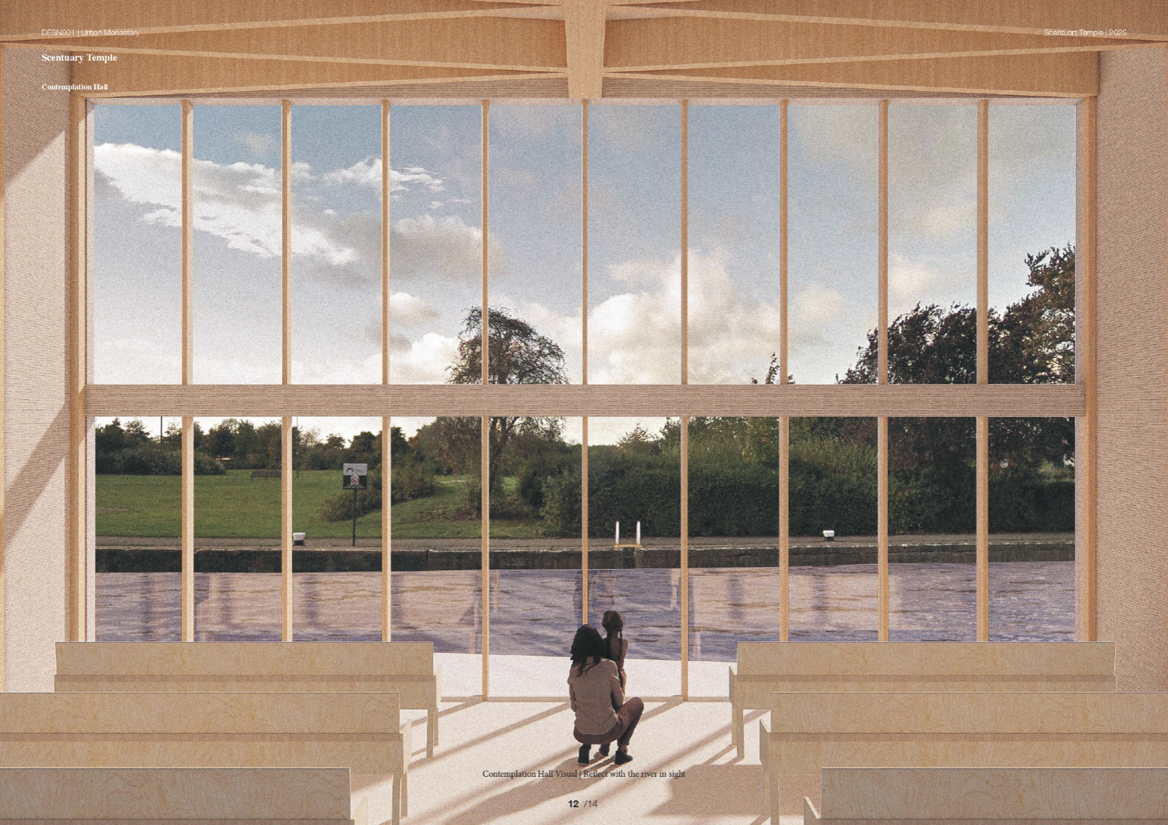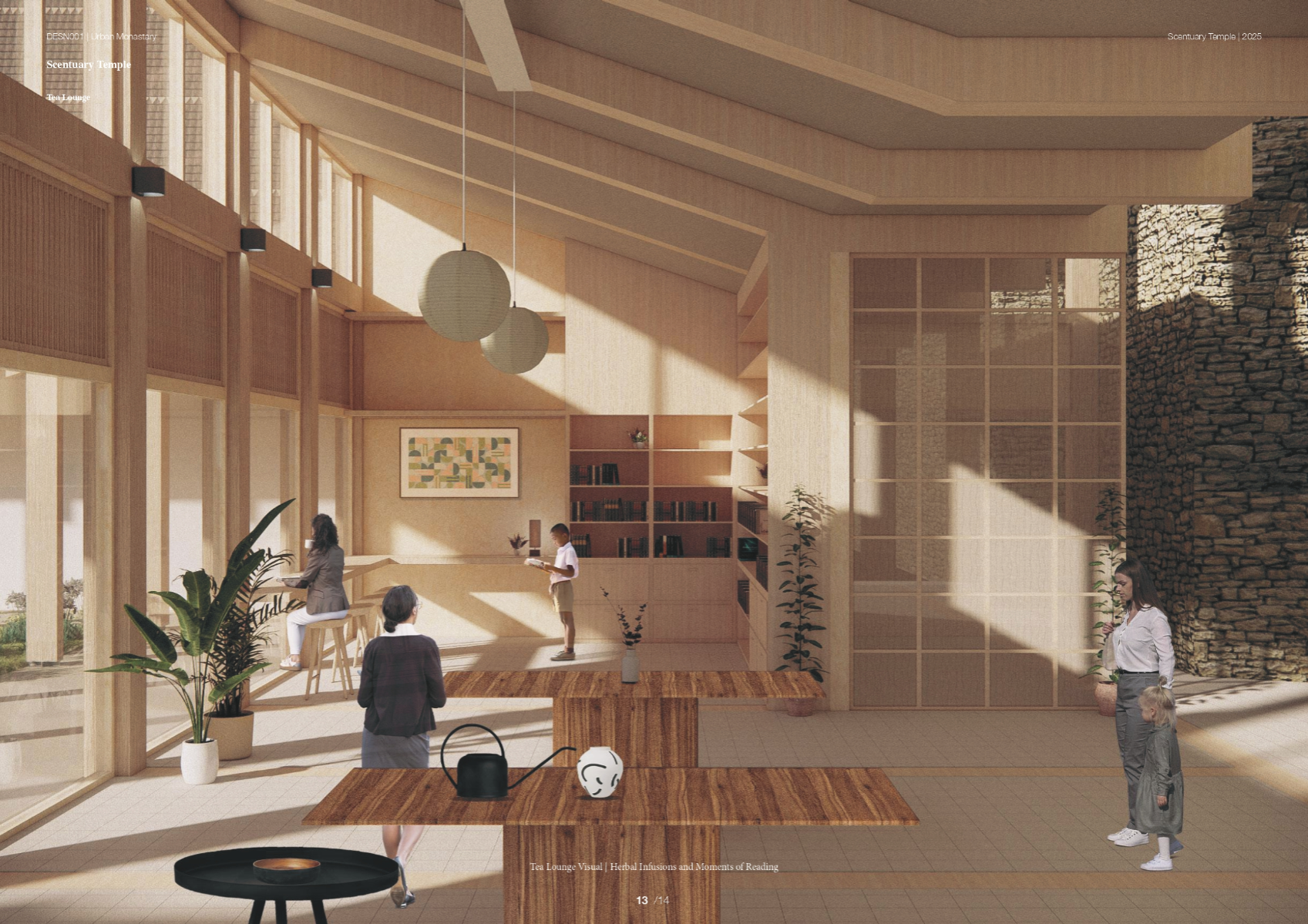 The Temple Stay project envisions a healing architectural framework within Newark Castle, offering sanctuary for rest, reflection, and reconnection with nature. Integrating six key elements: olfaction, space, nature, humanity, modernity, and history, the design emphasizes the deep bond between humans and their environment. Olfactory experiences serve as a medium for emotional healing, engaging primal sensory responses beyond words. The spatial strategy develops through three interrelationships: scent and space beginning at the Sacred Gatehouse, harmony of movement within the landscape, and dialogue between past and present. The result is a culturally rooted, contemporary architecture that nurtures well-being and contemplation.