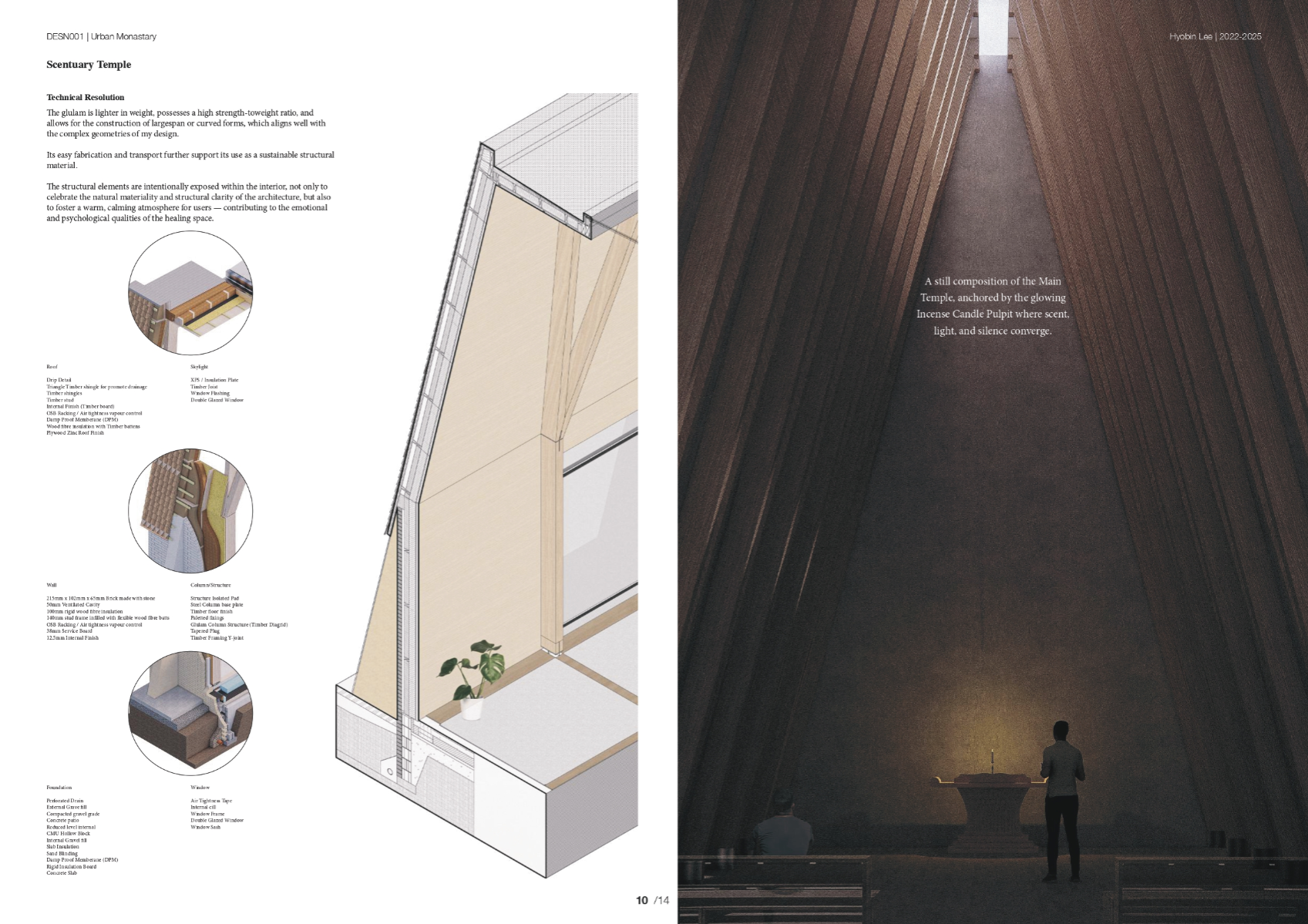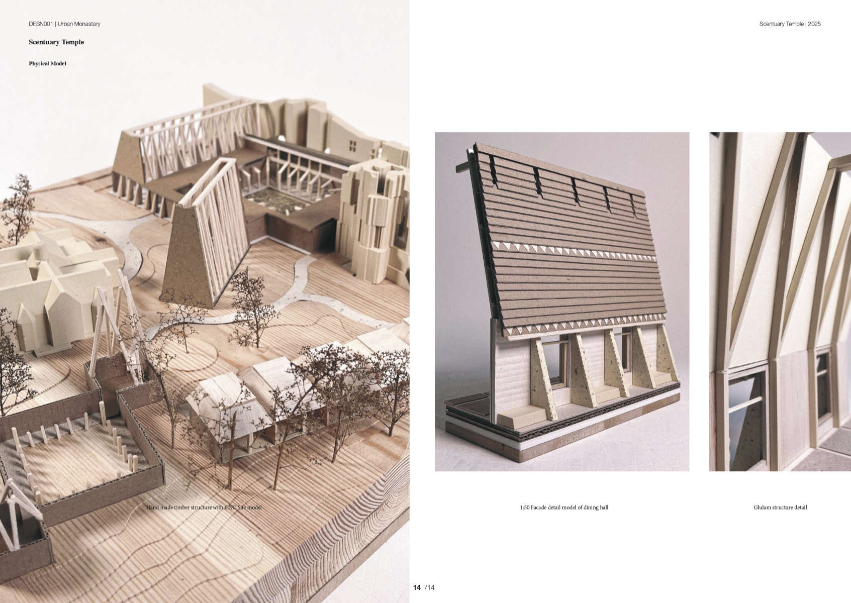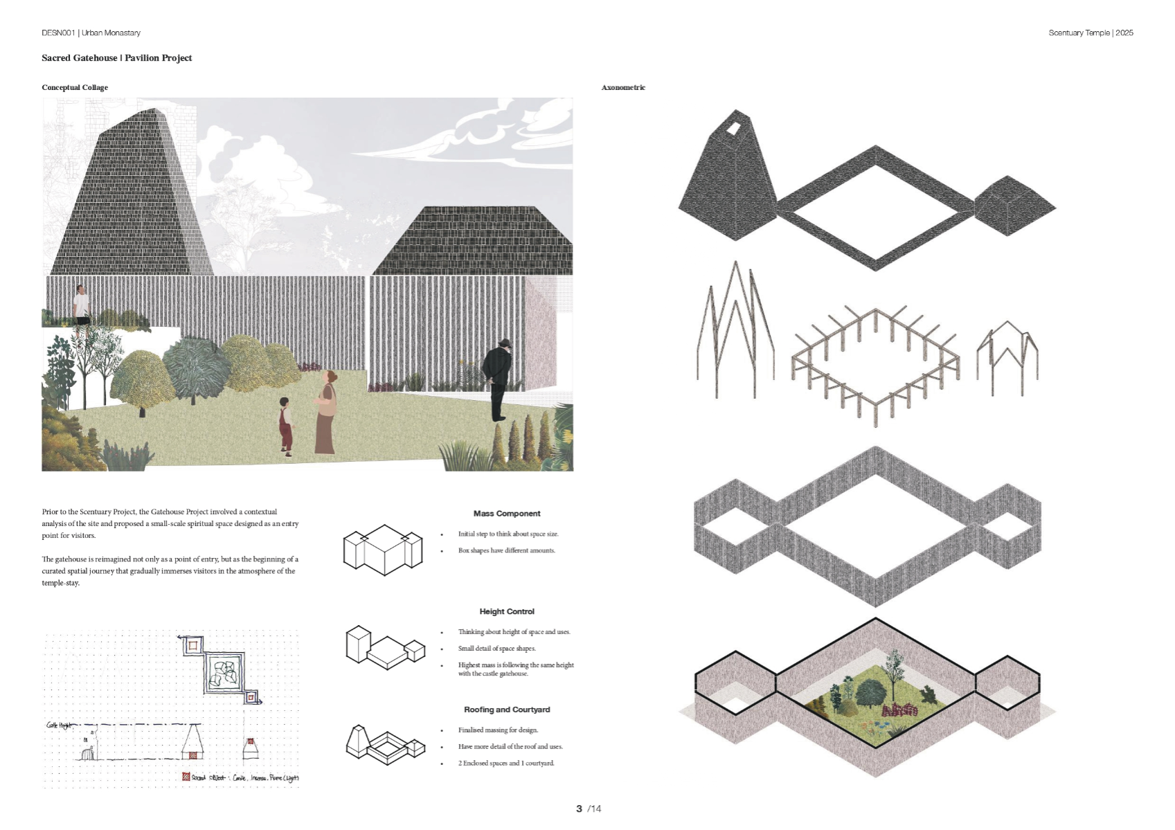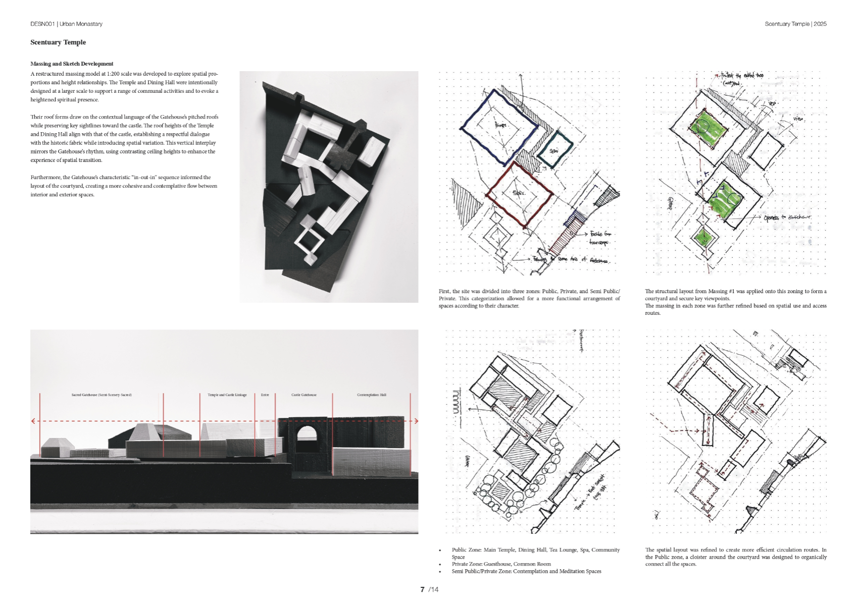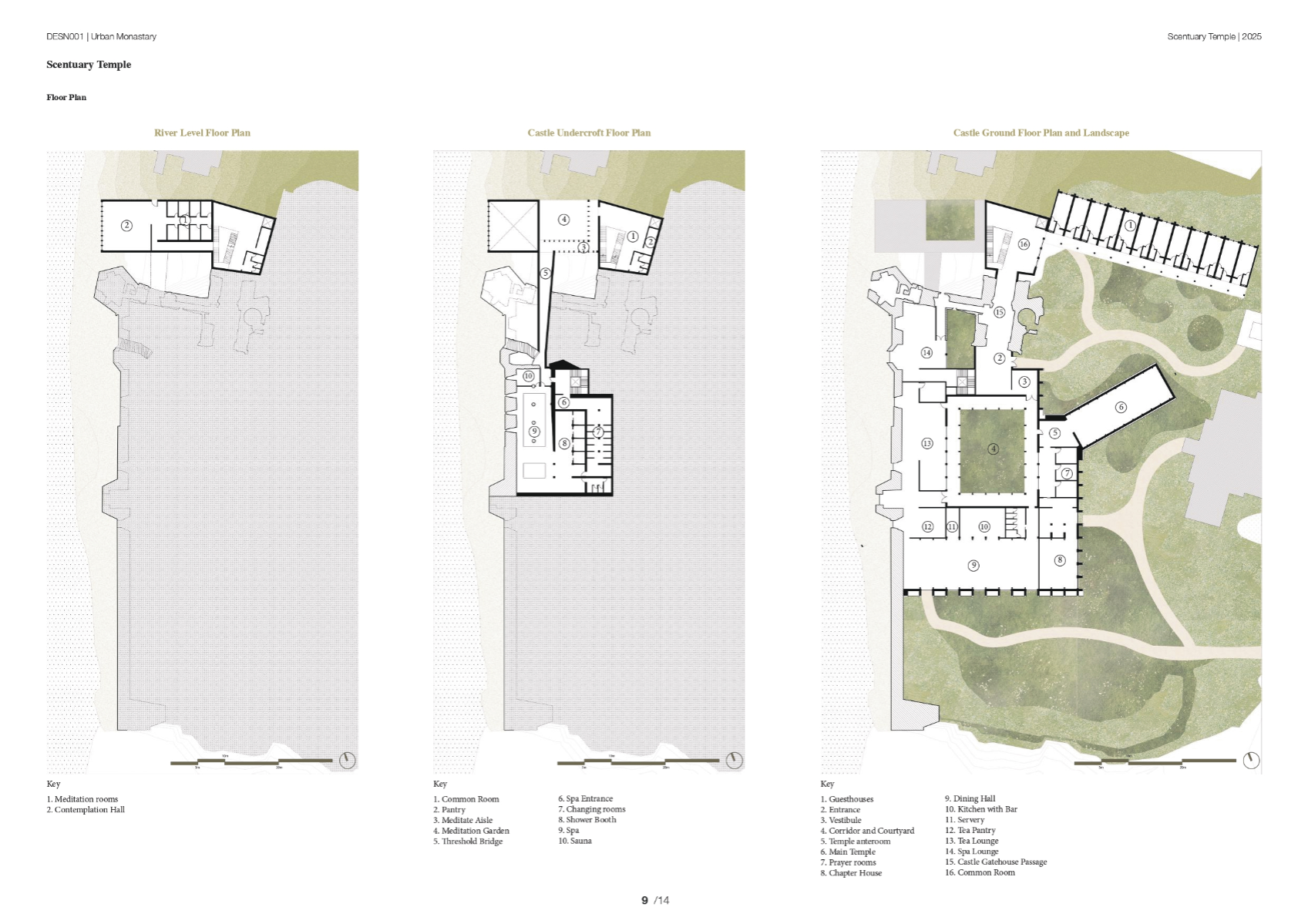 The Temple Stay project envisions a healing architectural framework within Newark Castle, offering sanctuary for rest, reflection, and reconnection with nature. Integrating six key elements: olfaction, space, nature, humanity, modernity, and history, the design emphasizes the deep bond between humans and their environment. Olfactory experiences serve as a medium for emotional healing, engaging primal sensory responses beyond words. The spatial strategy develops through three interrelationships: scent and space beginning at the Sacred Gatehouse, harmony of movement within the landscape, and dialogue between past and present. The result is a culturally rooted, contemporary architecture that nurtures well-being and contemplation.