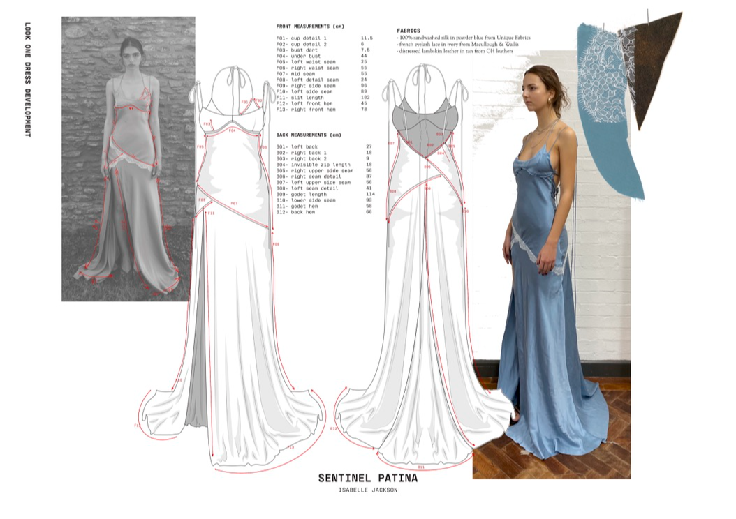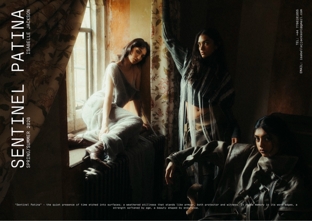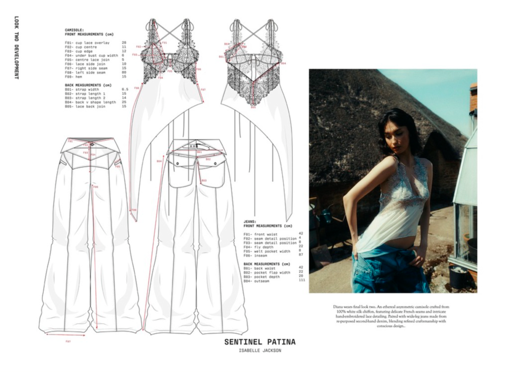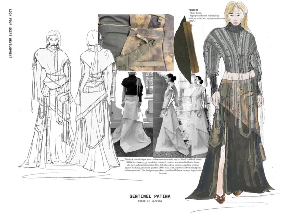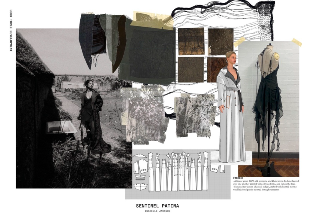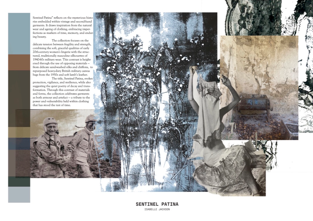 "Sentinel Patina" is a womenswear collection that explores the poetic contrast between fragility and strength. Inspired by the hidden histories of vintage garments, it combines delicate sand-washed silks, chiffon, and georgette with repurposed military canvas and lamb’s leather. Referencing 20th-century lingerie and 1940s British military wear, the collection investigates the tension between softness and structure, femininity and utility. Through fabric manipulation and careful material sourcing, Sentinel Patina celebrates ageing, imperfection, and resilience, reflecting garments as both armour and artefact. This collection forms part of a broader practice rooted in sustainability, textile experimentation, and emotionally resonant design.