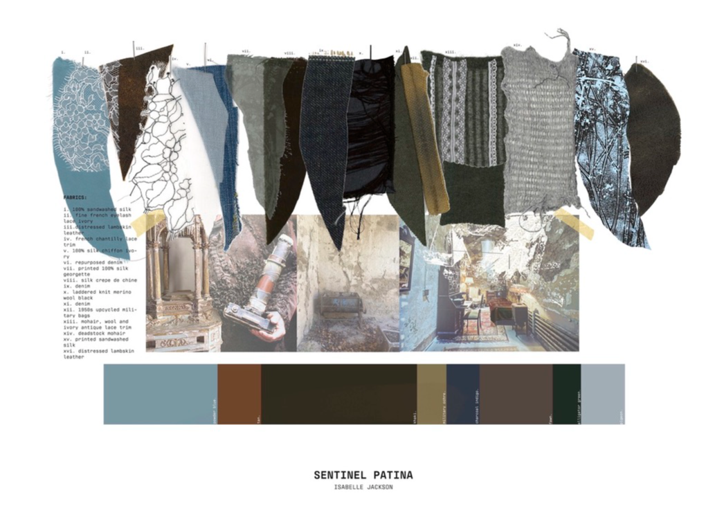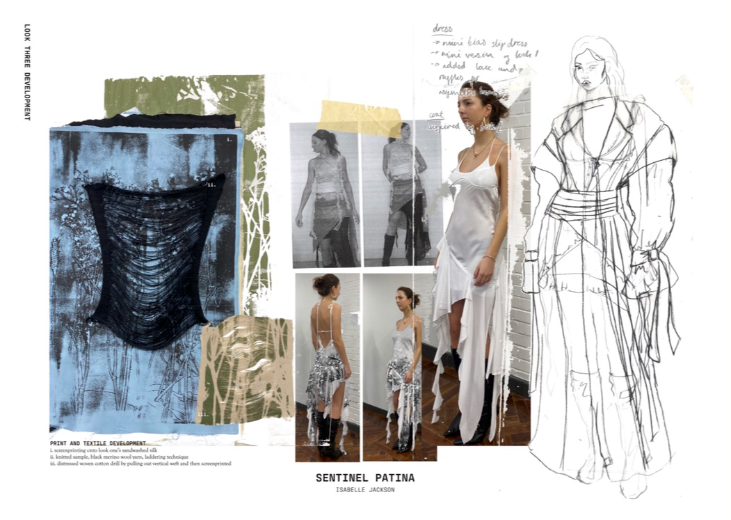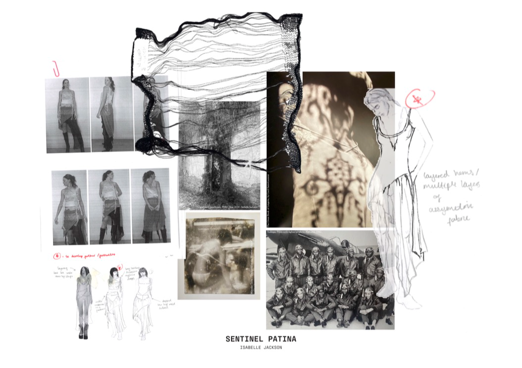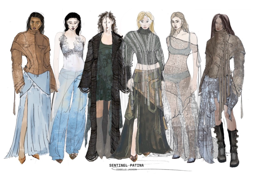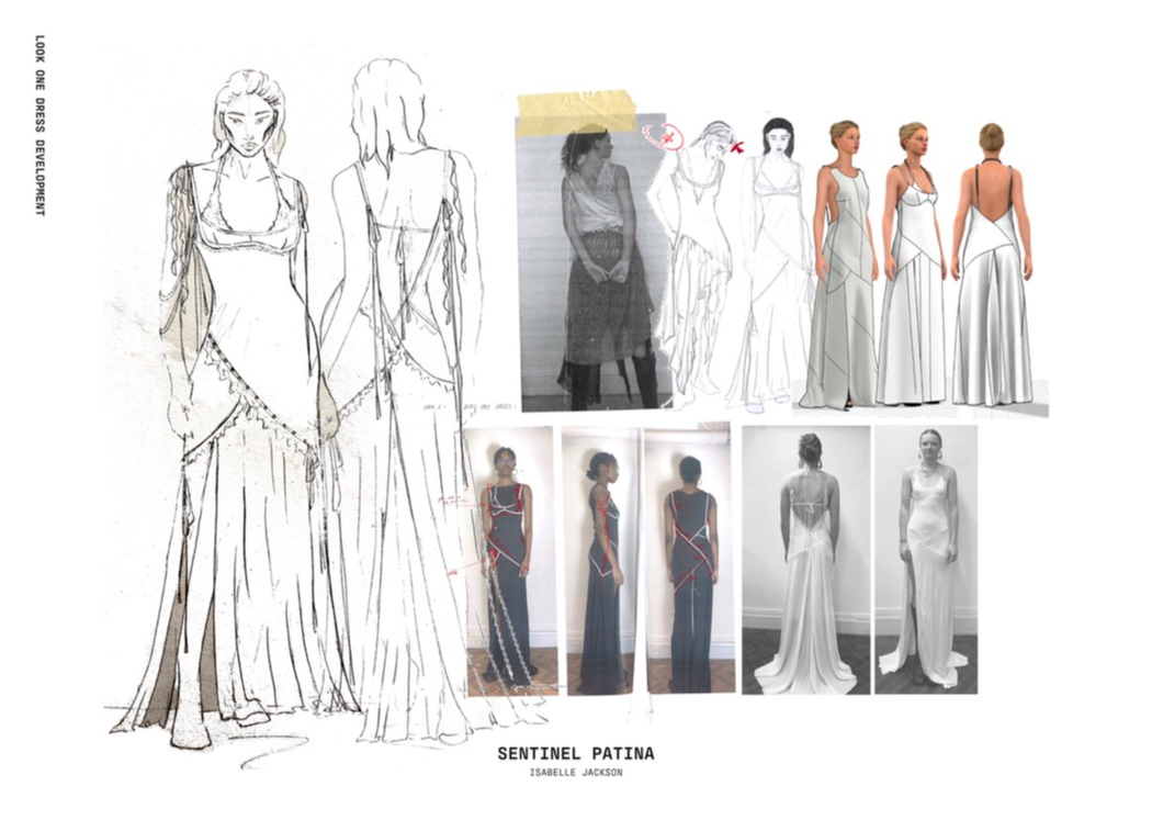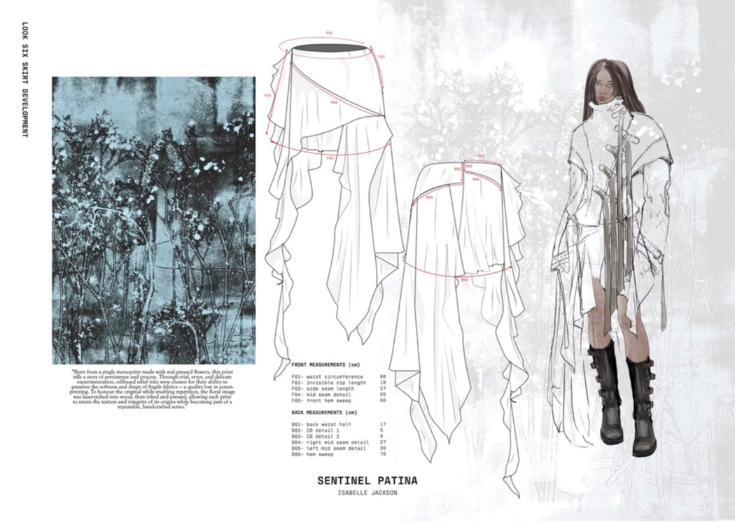 "Sentinel Patina" is a womenswear collection that explores the poetic contrast between fragility and strength. Inspired by the hidden histories of vintage garments, it combines delicate sand-washed silks, chiffon, and georgette with repurposed military canvas and lamb’s leather. Referencing 20th-century lingerie and 1940s British military wear, the collection investigates the tension between softness and structure, femininity and utility. Through fabric manipulation and careful material sourcing, Sentinel Patina celebrates ageing, imperfection, and resilience, reflecting garments as both armour and artefact. This collection forms part of a broader practice rooted in sustainability, textile experimentation, and emotionally resonant design.