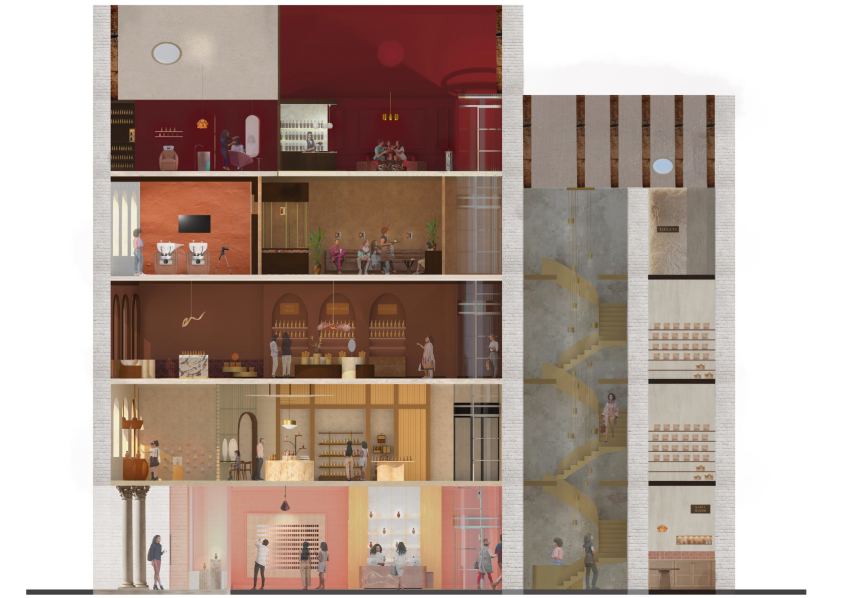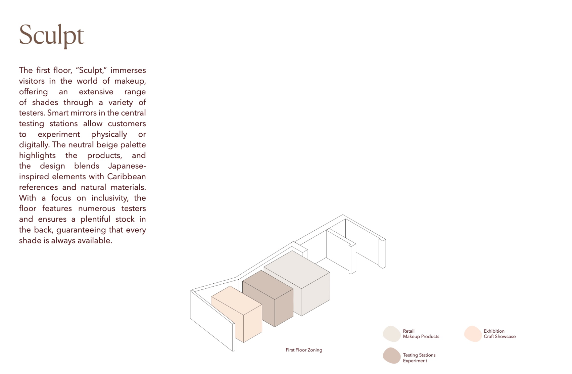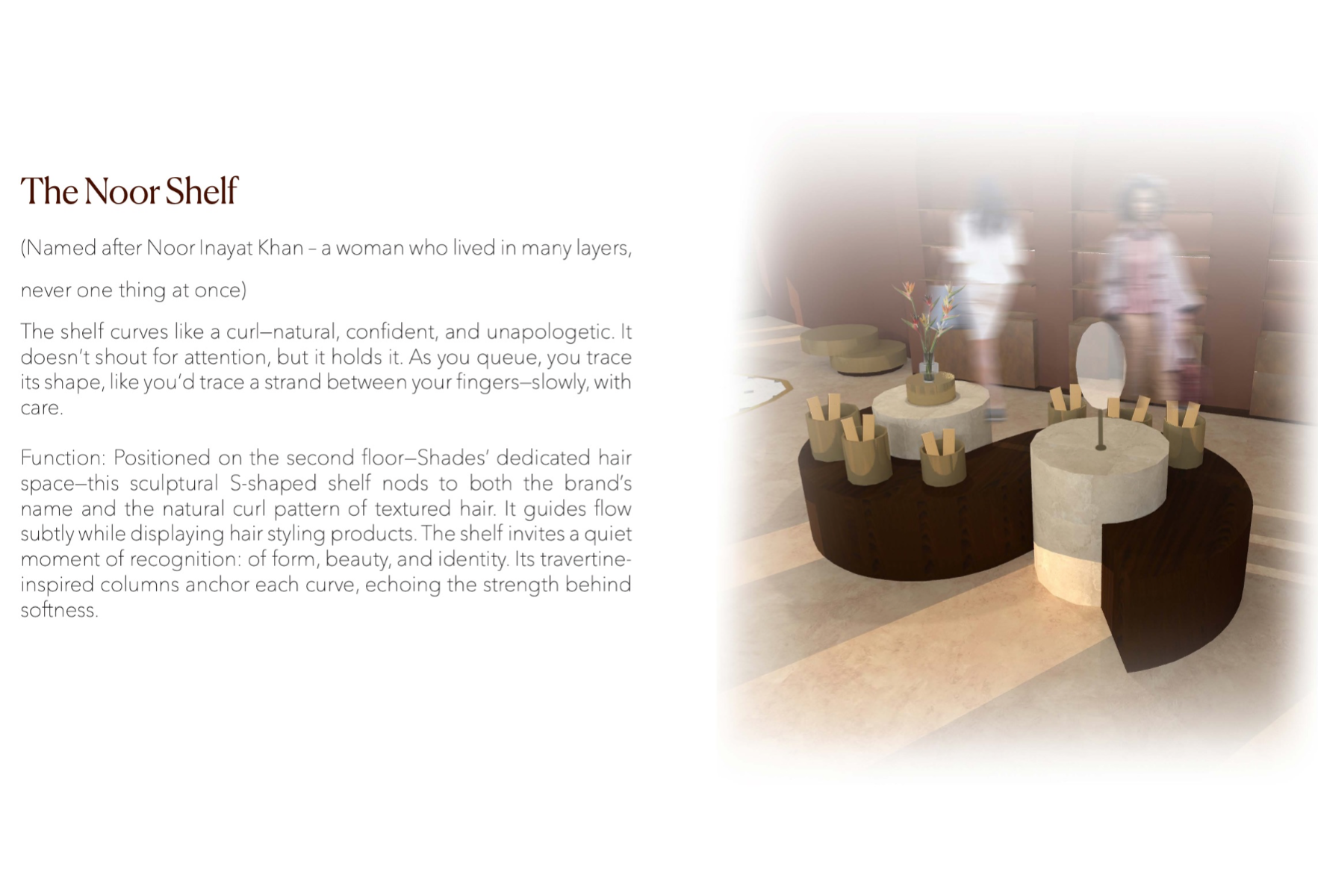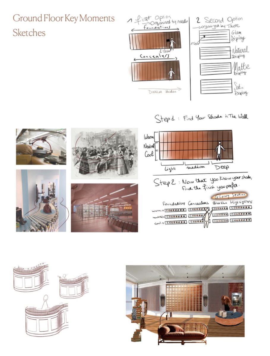 Shades is a beauty retail concept that celebrates multiculturalism and inclusivity, with a focus on people of colour and those of mixed heritage. The design reimagines the beauty store as a space centred on identity, connection, and confidence. Spread across five themed floors, it offers immersive experiences like smart mirrors, swatch-matching tools, workshops, and a multicultural tea bar. Every material, texture, and furniture piece draws from global craft traditions. Rooted in warm, earthy tones, Shades creates an environment where the customer is at the centre — a place where individuality is embraced and everyone feels seen.
