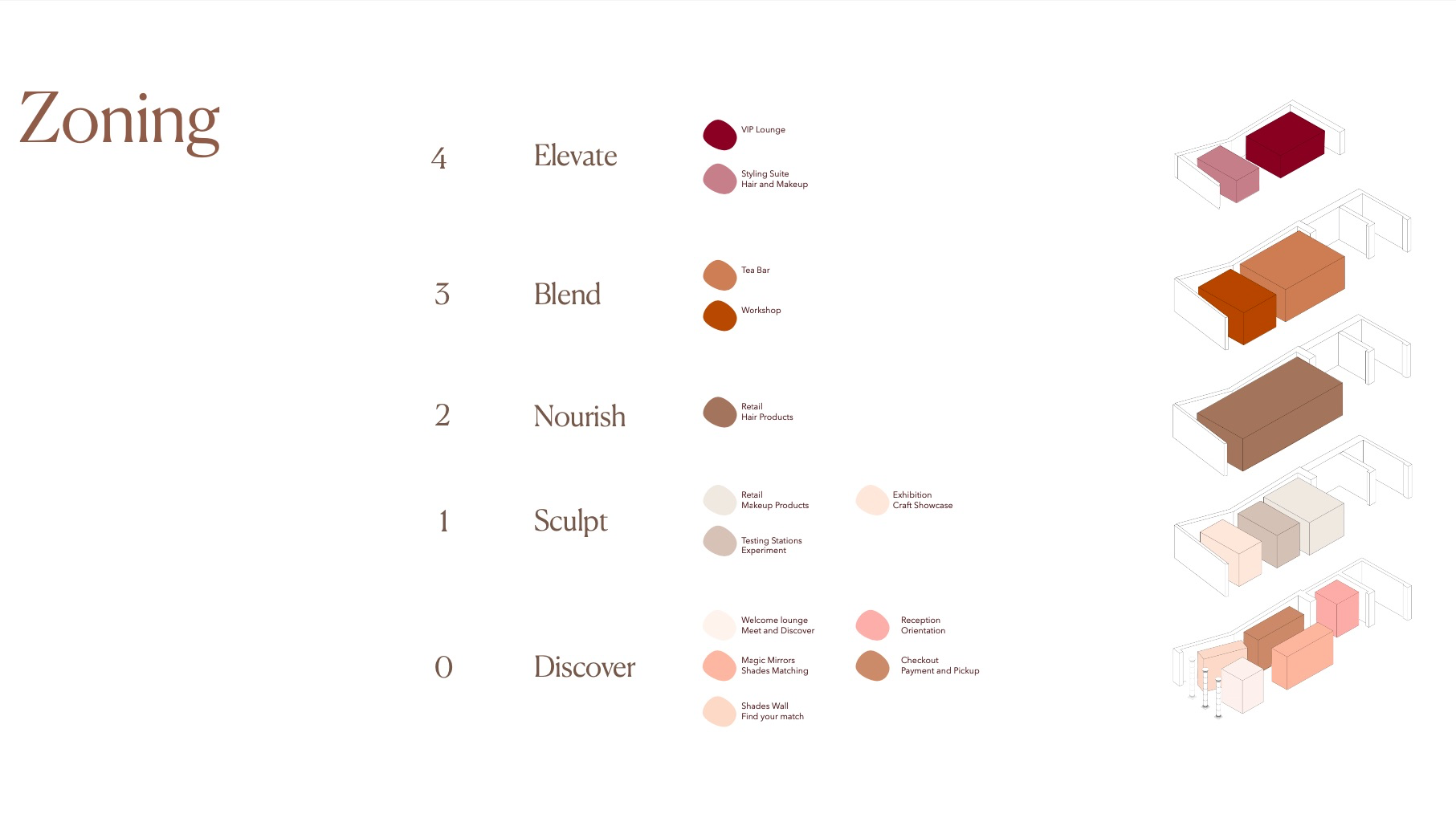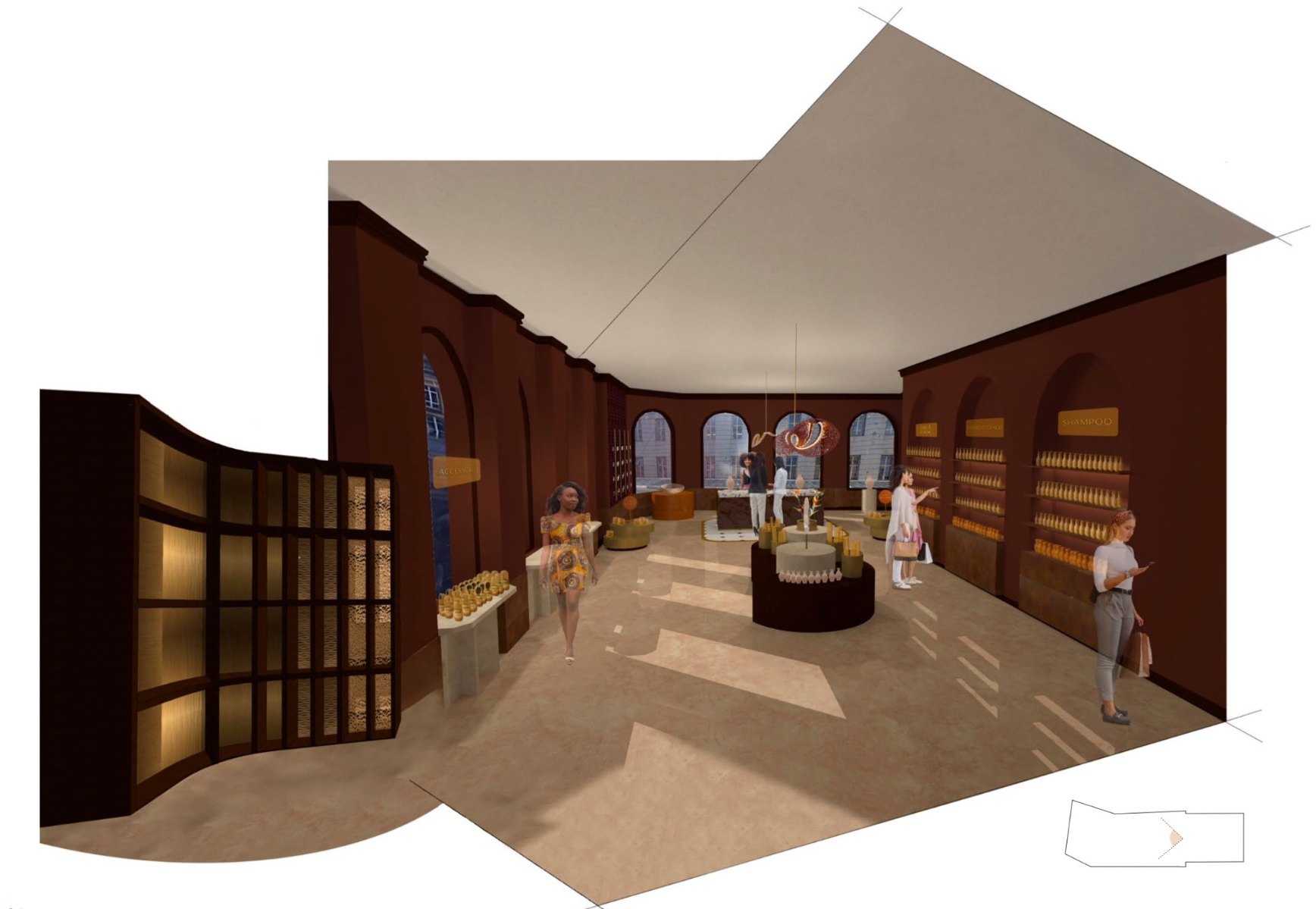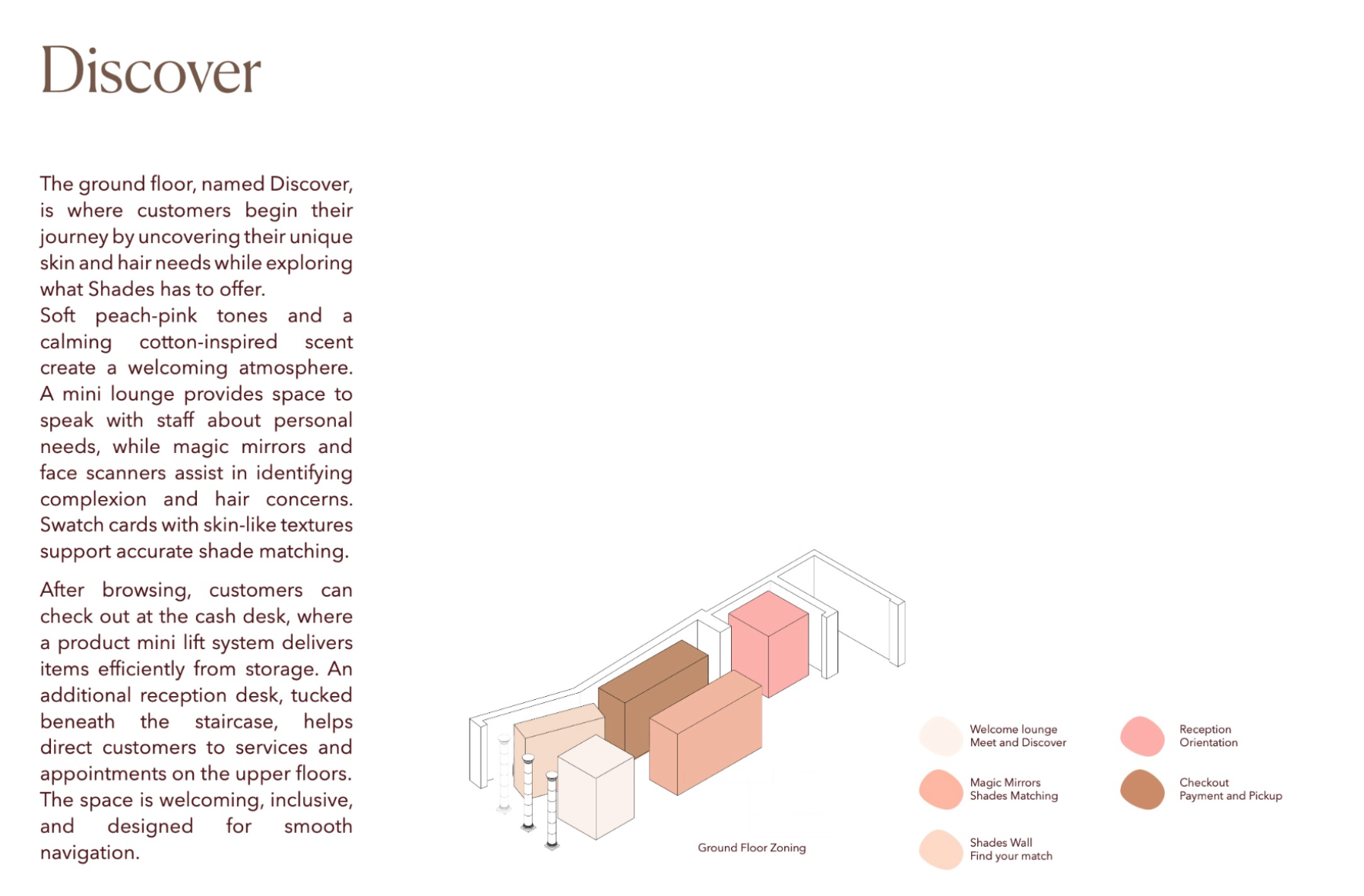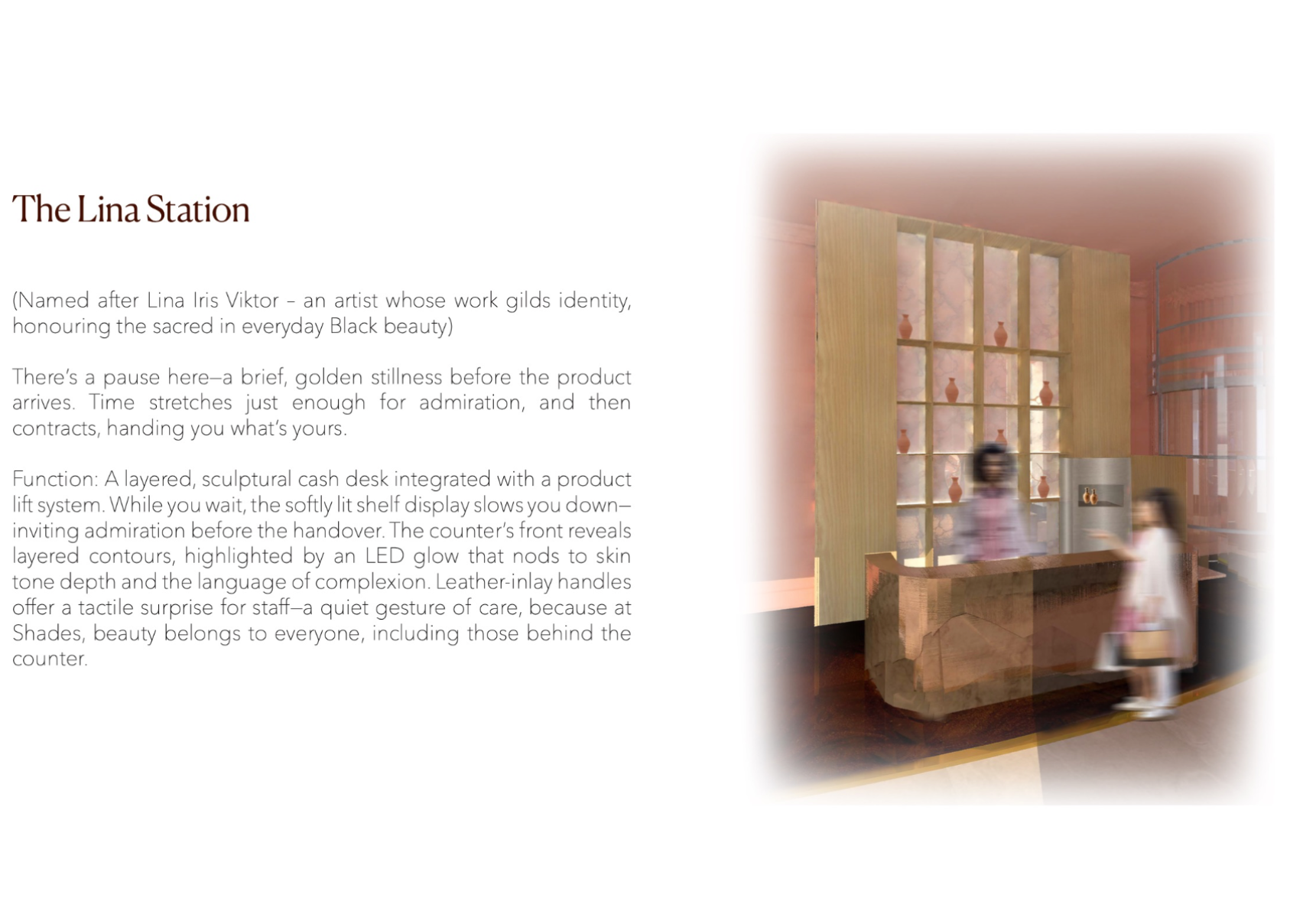 Shades is a beauty retail concept that celebrates multiculturalism and inclusivity, with a focus on people of colour and those of mixed heritage. The design reimagines the beauty store as a space centred on identity, connection, and confidence. Spread across five themed floors, it offers immersive experiences like smart mirrors, swatch-matching tools, workshops, and a multicultural tea bar. Every material, texture, and furniture piece draws from global craft traditions. Rooted in warm, earthy tones, Shades creates an environment where the customer is at the centre — a place where individuality is embraced and everyone feels seen.