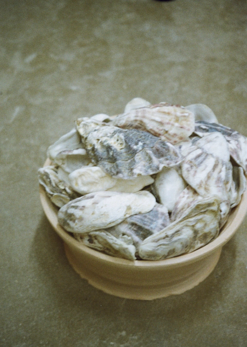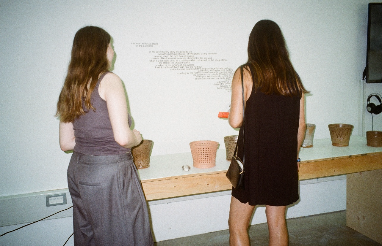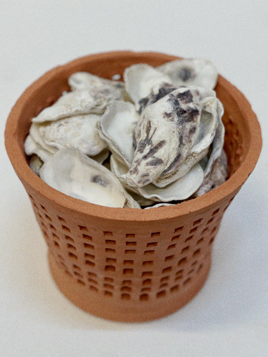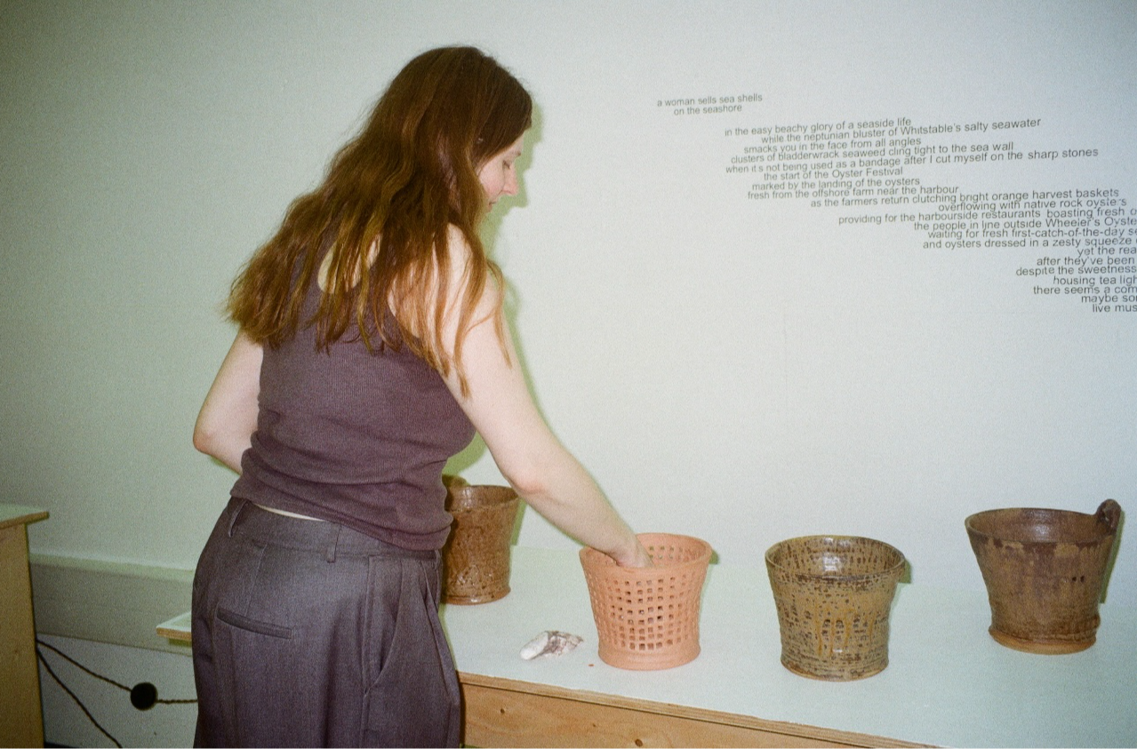 It feels rather lucky to have spent my childhood by the sea in Whitstable, Kent, a town world famous for its oysters, and means I have been graced with buckets full of delicious girlhood memories of collecting oyster shells and taking part in the town's annual Oyster Festival held in the summertime. Oysters are so inextricably embedded in the identity of this town and, for me, it all seems to start with that nursery rhyme of a woman selling seashells on the seashore. Fuelled by sugary sour beachy nostalgia and a deep connection to Whitstable’s landscape, alongside a poem walking you through a typical summer back home, this ceramic collection is material-led and hopes to immerse you in a sense of place, celebrating local materials and oyster farming culture through oyster harvest baskets I often see stacked up in the harbour. Consciously sourcing and processing local oyster shells and oak from my fireplace to use as glaze material alternatives tells a seaside story, encouraging sustainable practice and allowing the work to serve as a tangible celebration of a landscape.